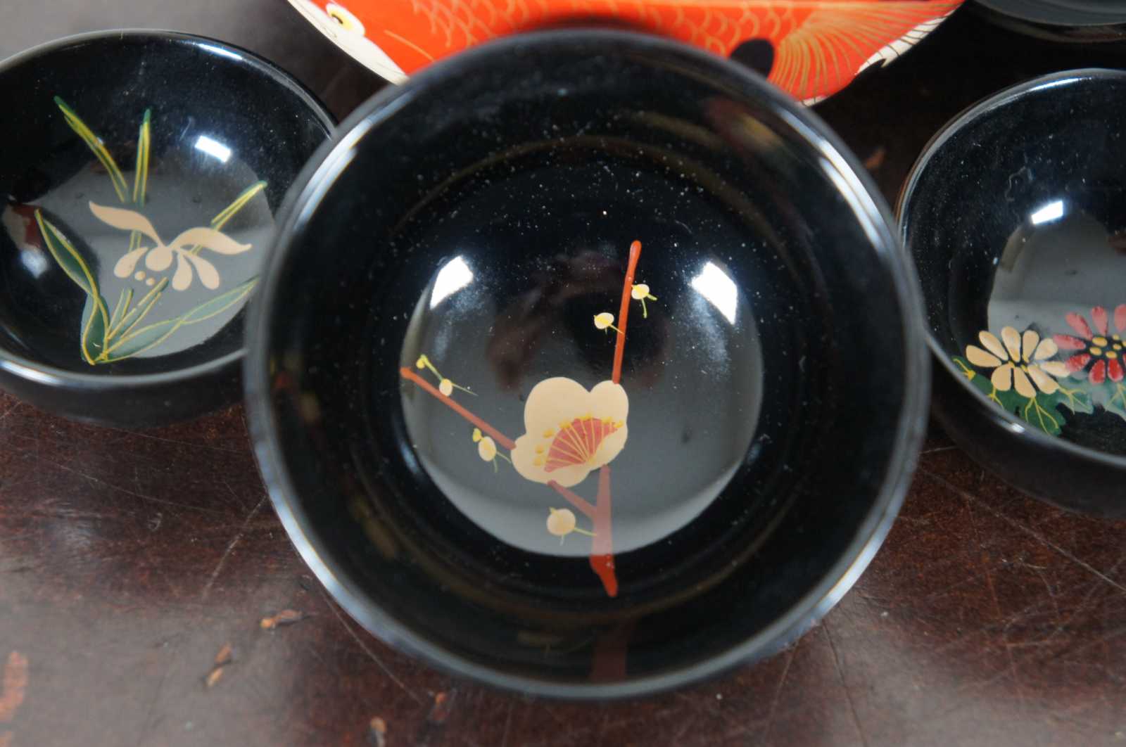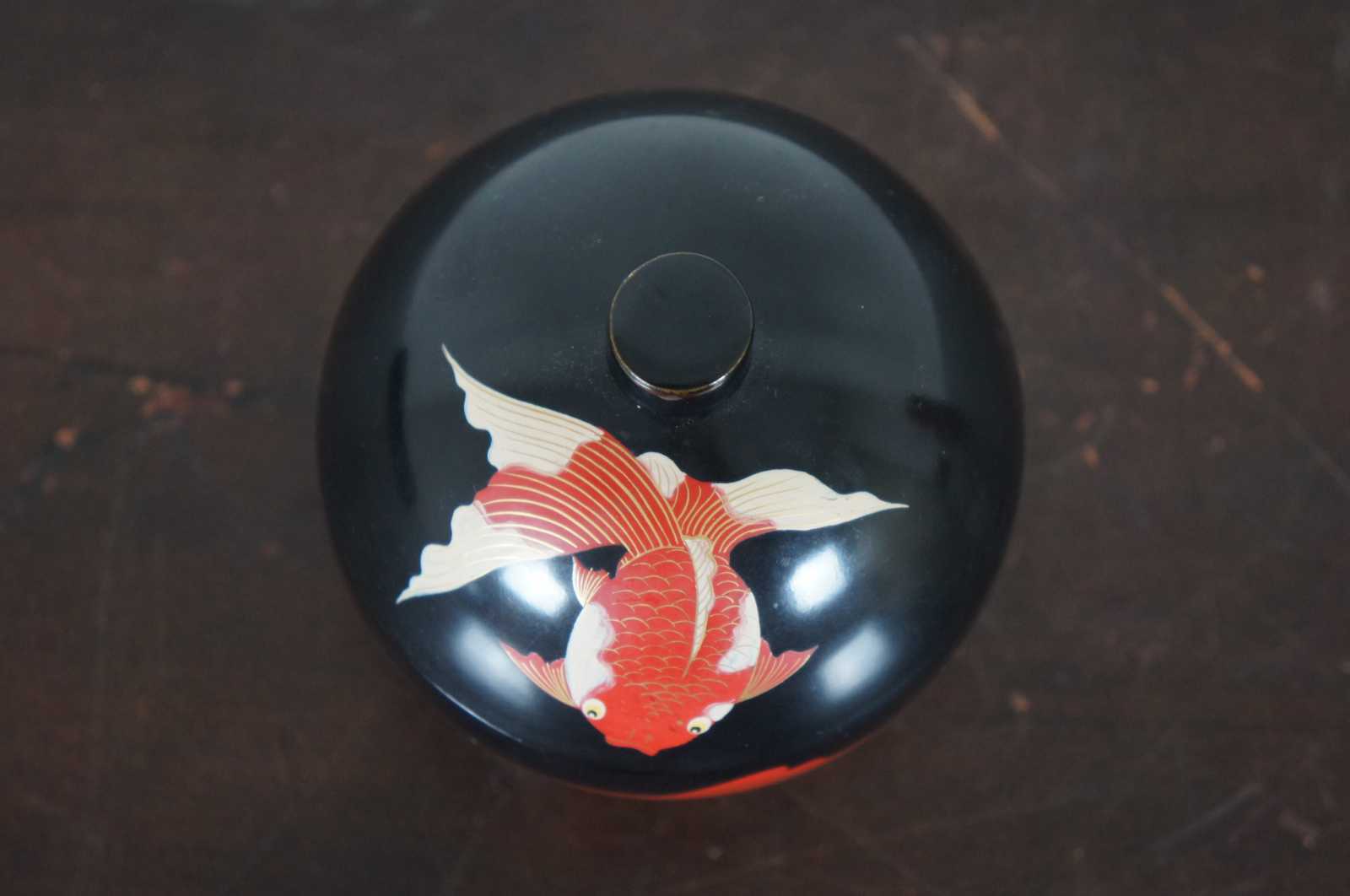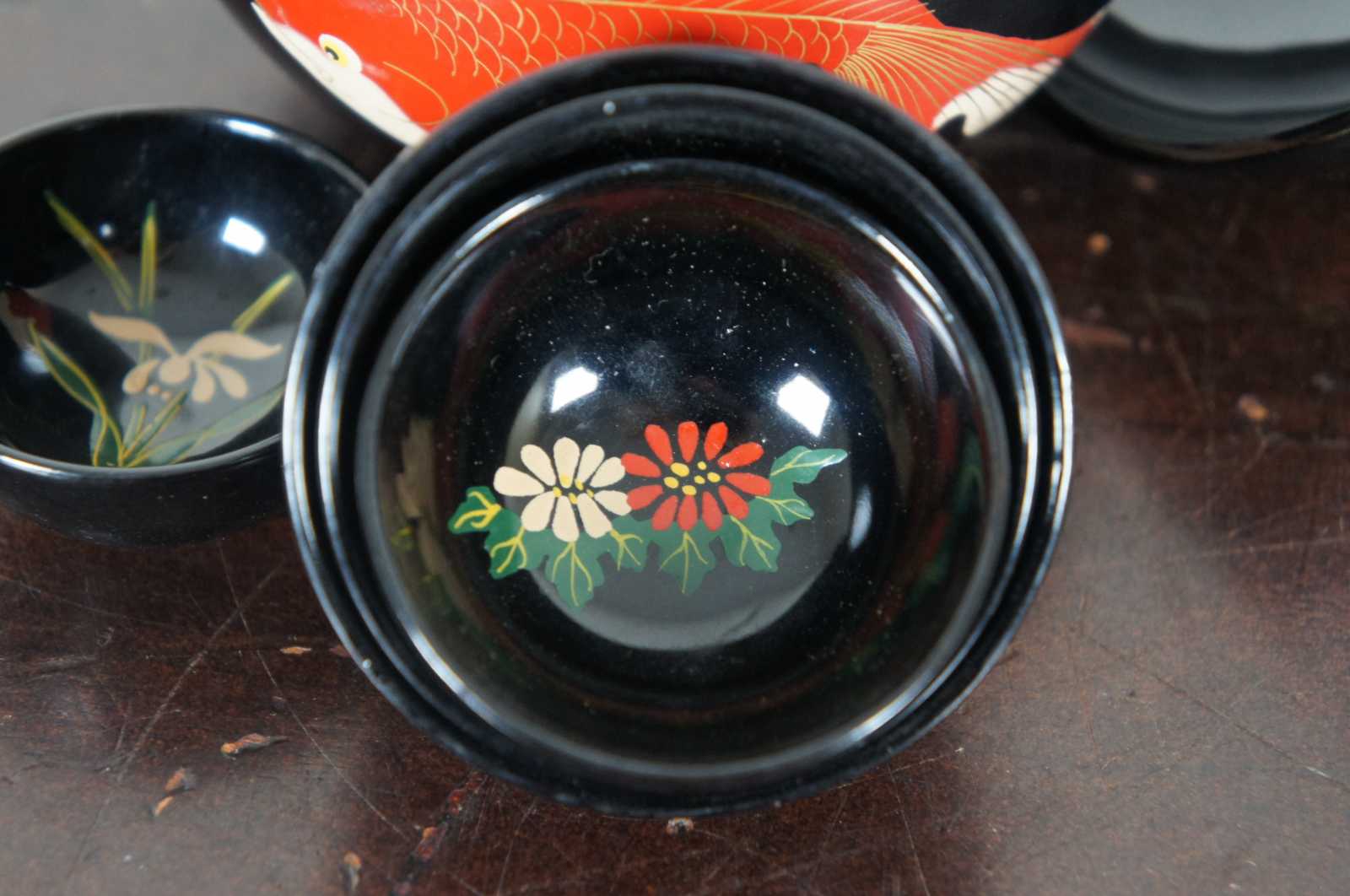 Vintage Bemco Okinawa Japanese lacquerware lot including koi decorated trinket box, apple shaped nesting box/bowl set, and one lacquer die.