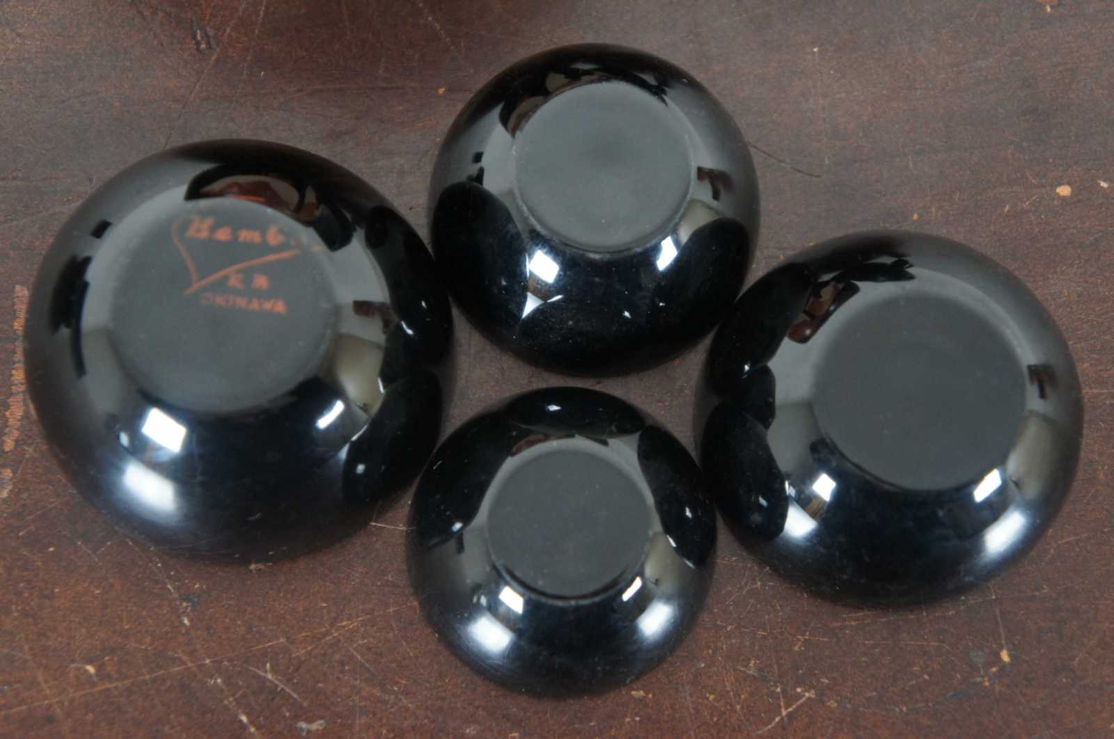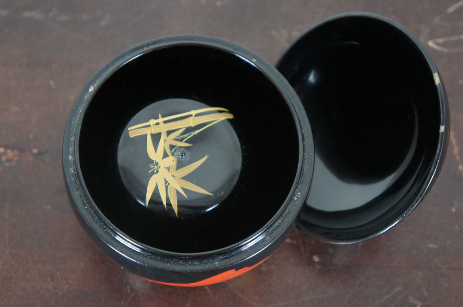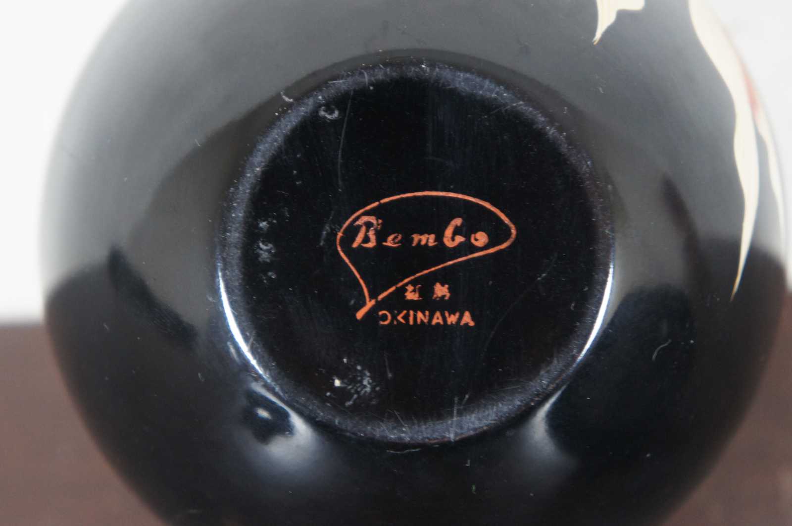 Vintage Bemco Okinawa Japanese lacquerware lot including koi decorated trinket box, apple shaped nesting box/bowl set, and one lacquer die.