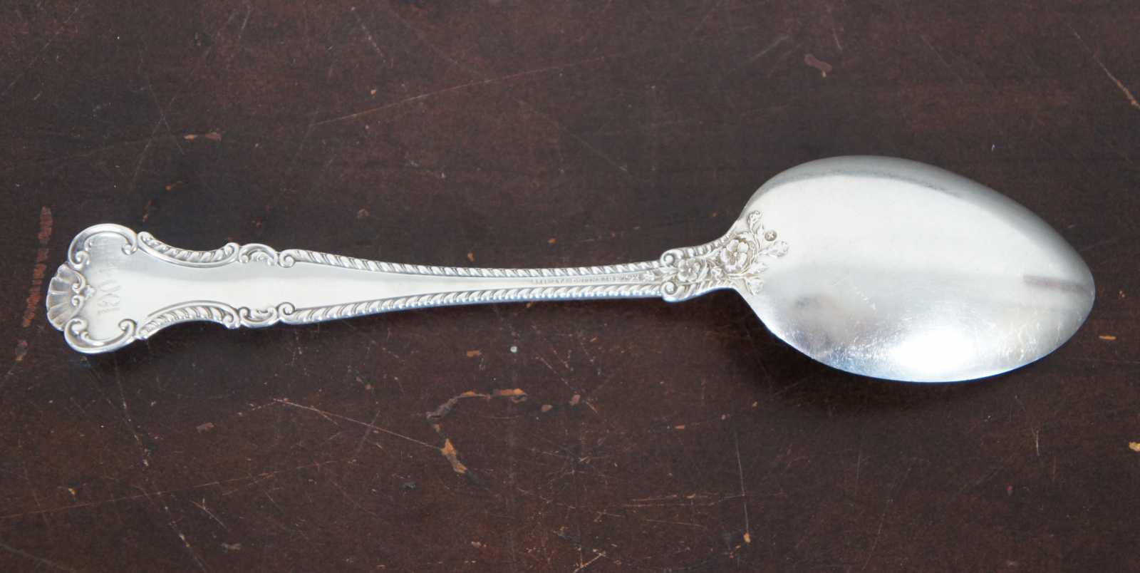 Antique Gorham sterling silver .925 serving spoon in the 1899 Cambridge pattern, monogrammed with an N and the year 1904.
