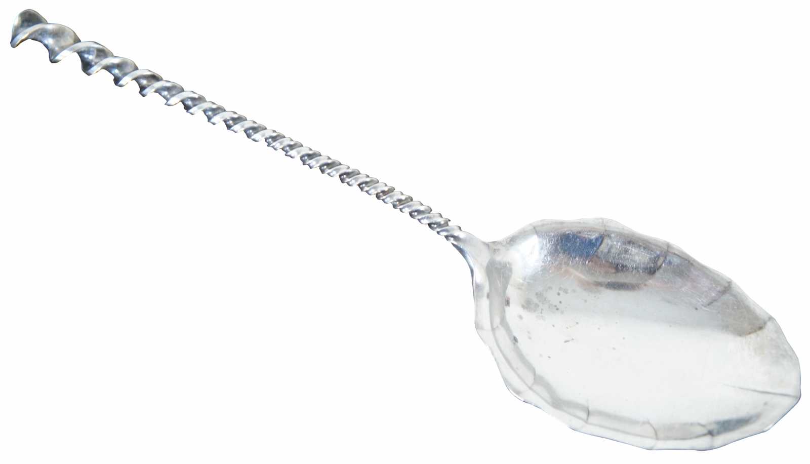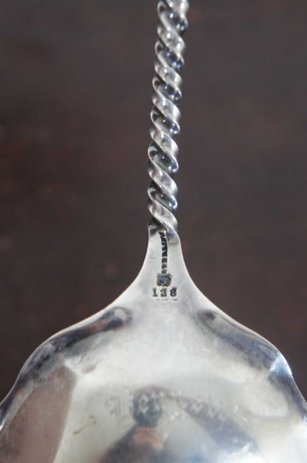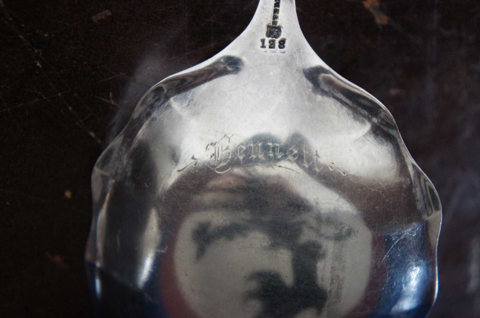 Antique sterling silver 925 serving spoon with twisted handle and lightly scalloped bowl, engraved on the back with the name “Bennett.” Sterling 128.
