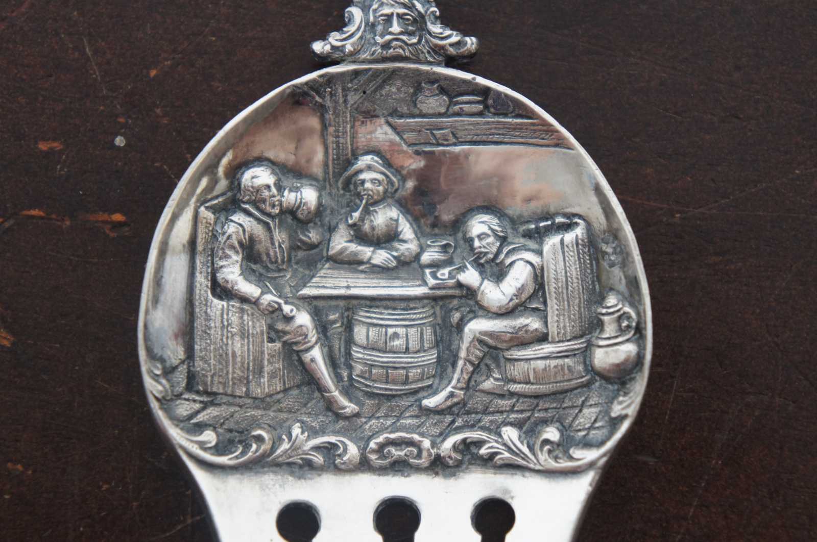 Antique German silver serving fork with a tavern scene of men drinking and smoking on the base, figural faces on each end of the handle between a twisted body, which is topped by a castle tower.