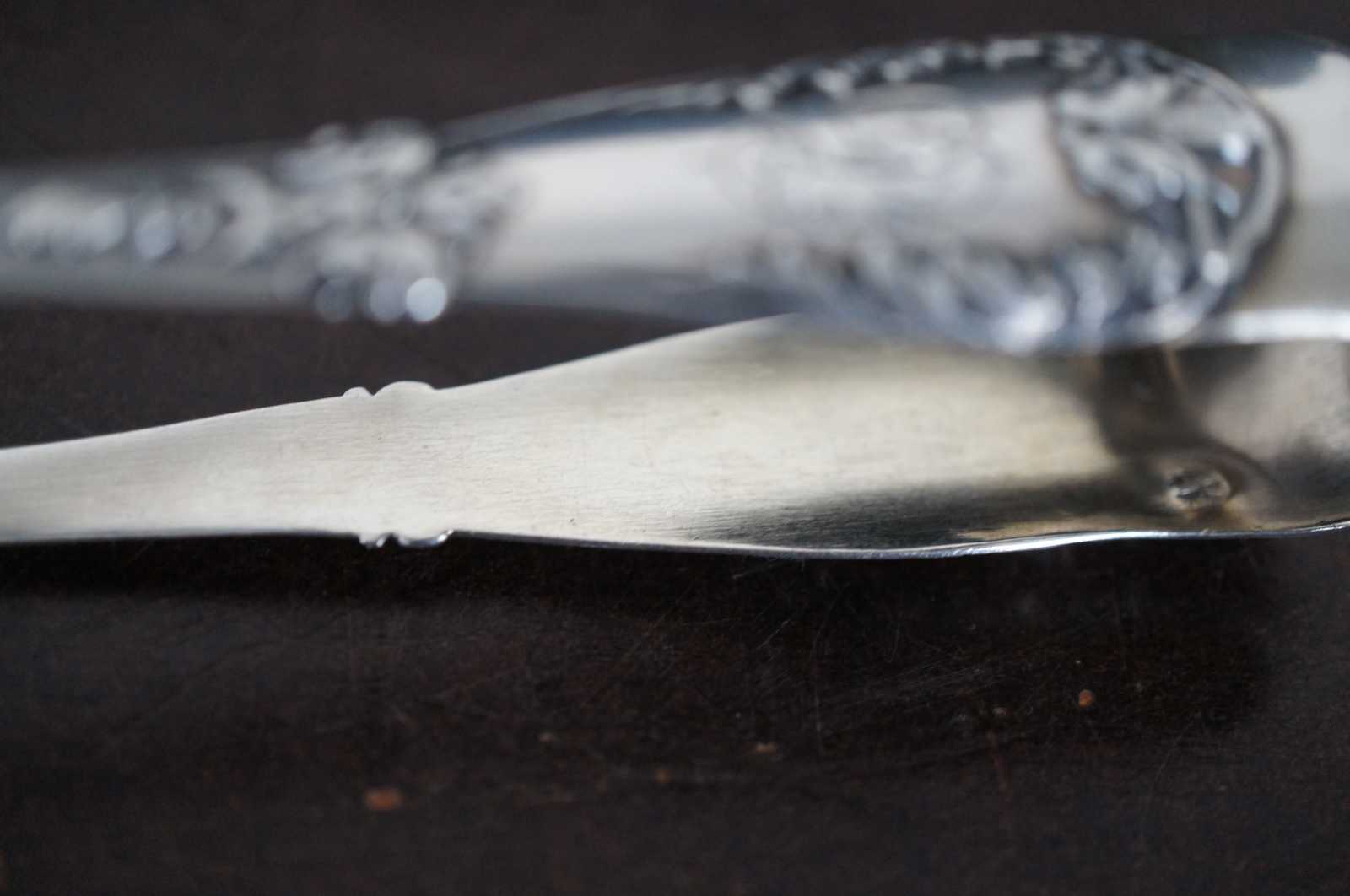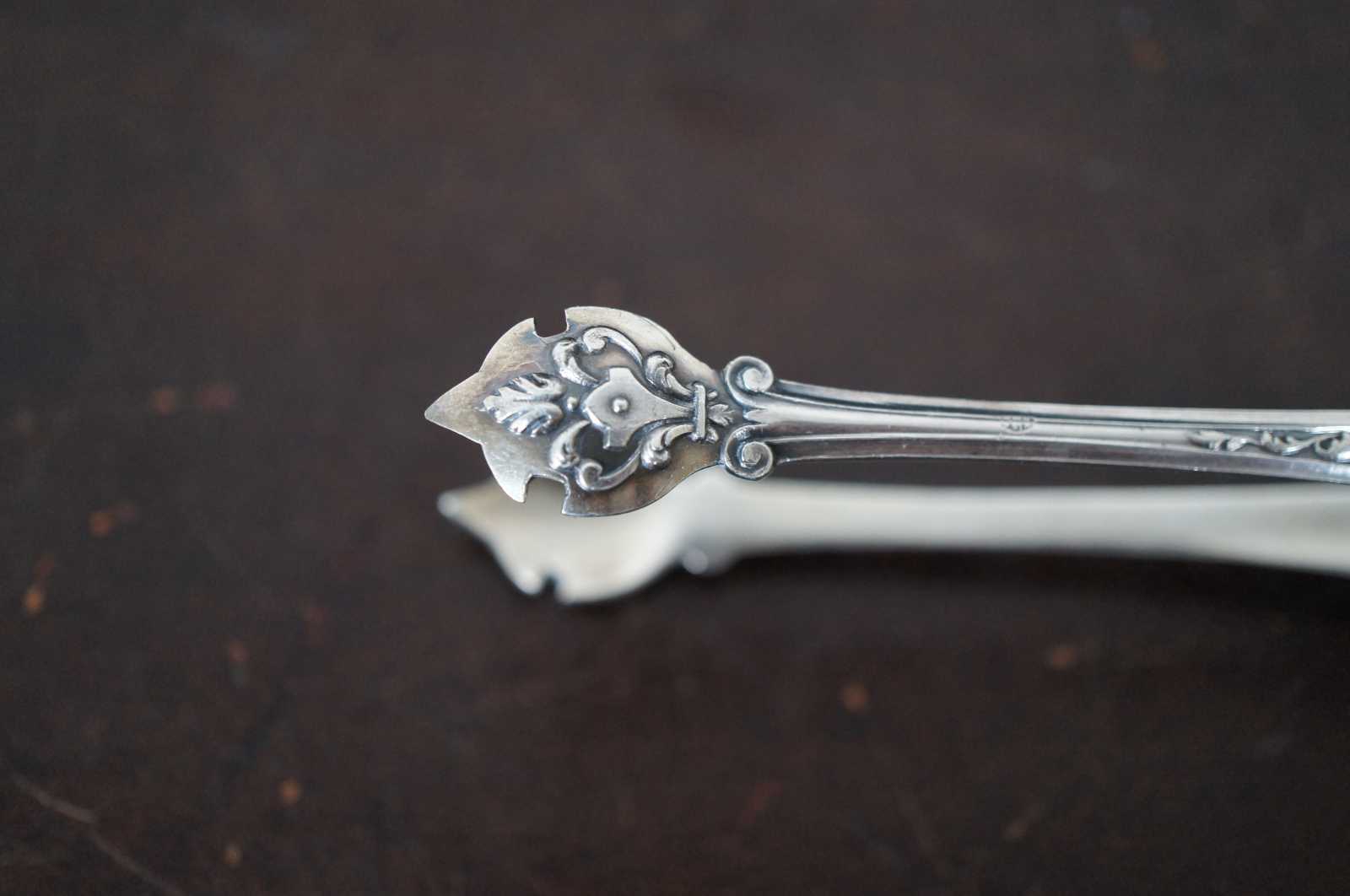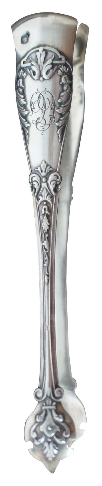 Antique sterling silver sugar tongs monogrammed with a D and stamped with a European Diana Head Minerva fineness mark.