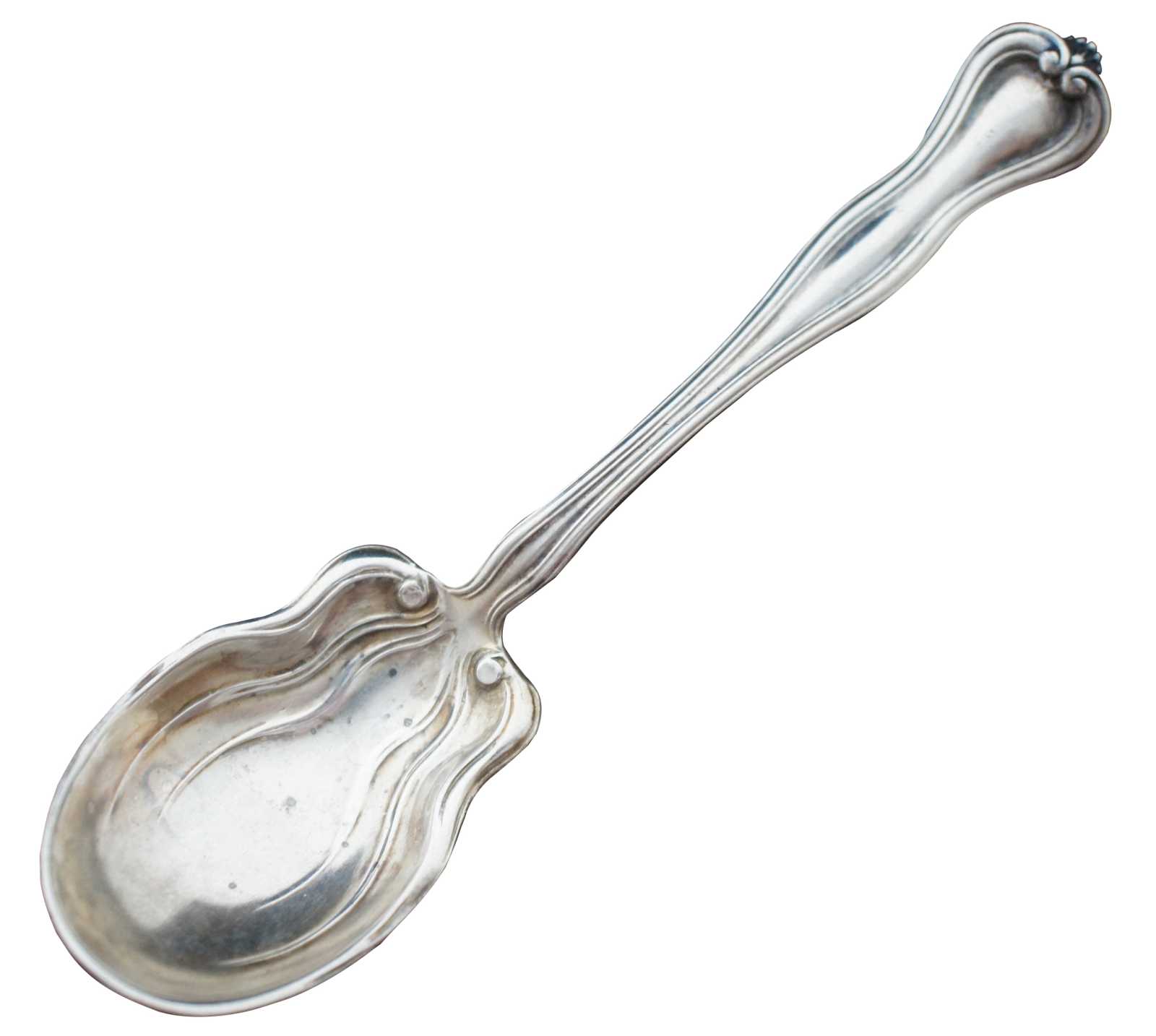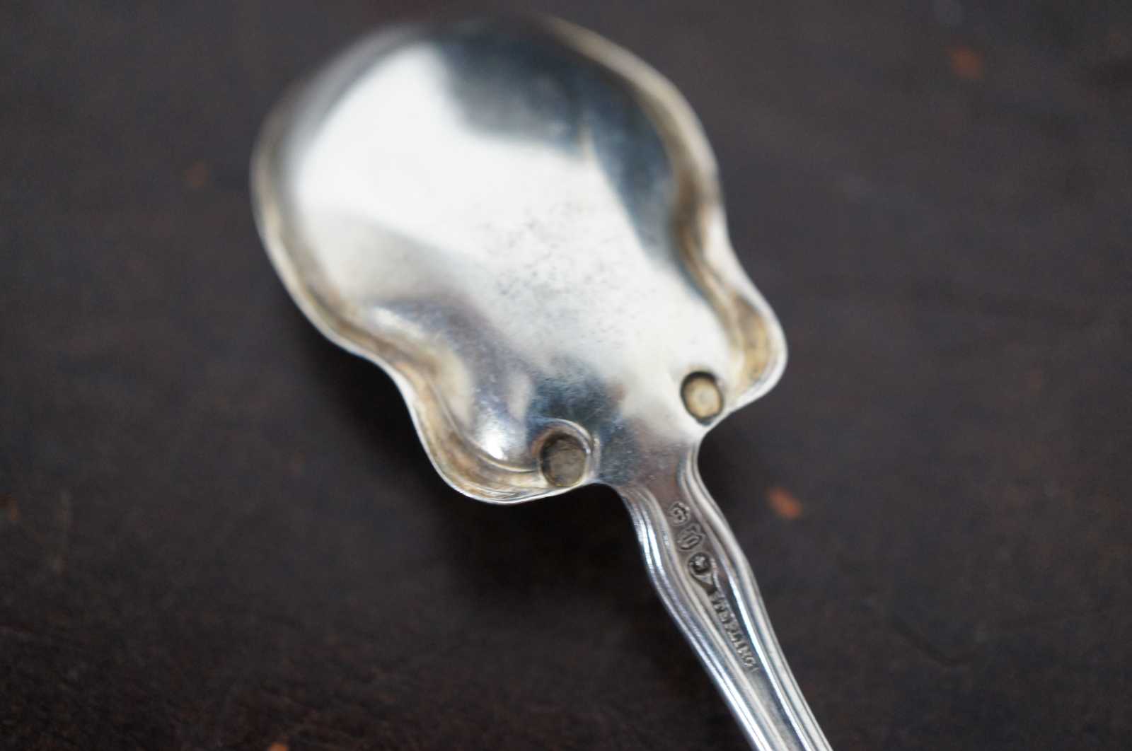 Antique 19th century sterling silver sugar spoon by the Watson Company with scalloped bowl, serpentine form, and monogram B on the handle. “The origin of the firm traces back to 1874 when was formed in Attleboro, MA, the Cobb, Gould & Co. The founders were Clarence L. Watson, Fred Newell, Charles Cobb, Samuel Gould and W.A. Battey.