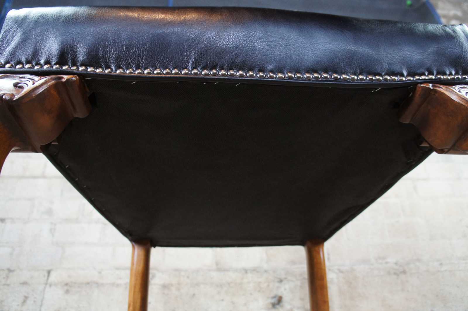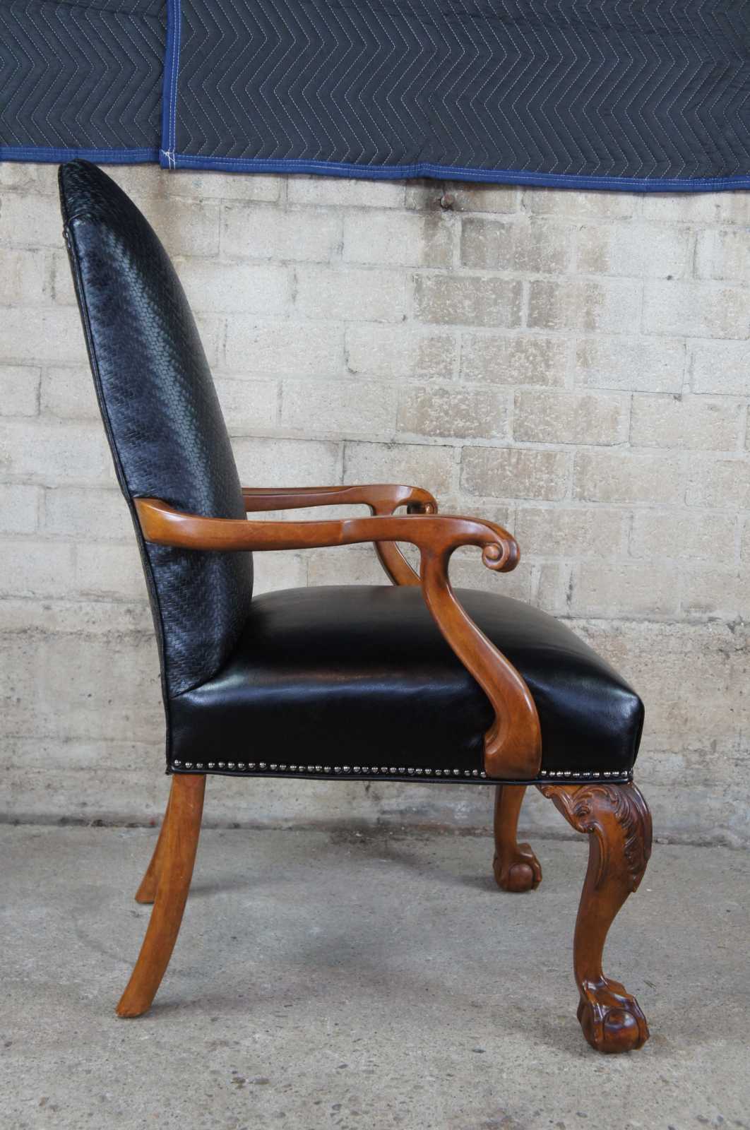 Set of two vintage Century Furniture arm chairs. Featuring ball and claw feet and upholstered in black leather with woven herringbone pattern and nailhead trim.
