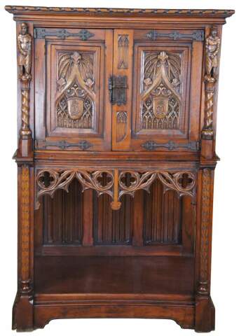 Antique English Gothic Revival court cupboard or secretary desk, circa late 1800s. Made of Quartersawn Oak featuring figural columns, panelled siding and an arched pierced apron. The two doors are heavily detailed with an embowed design, crest and ornate iron hardware. Opens to a pull out writing surface, shelf and upper cuby with drawer.