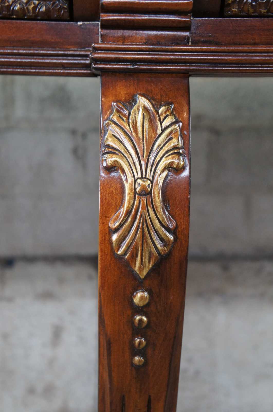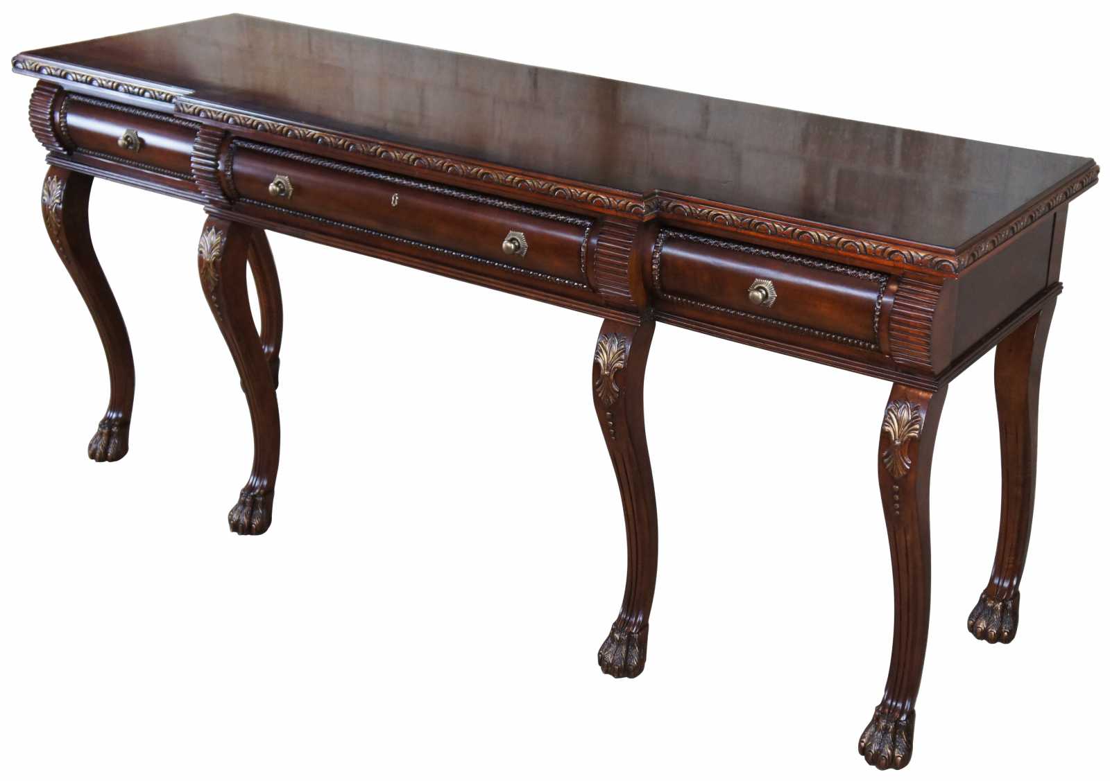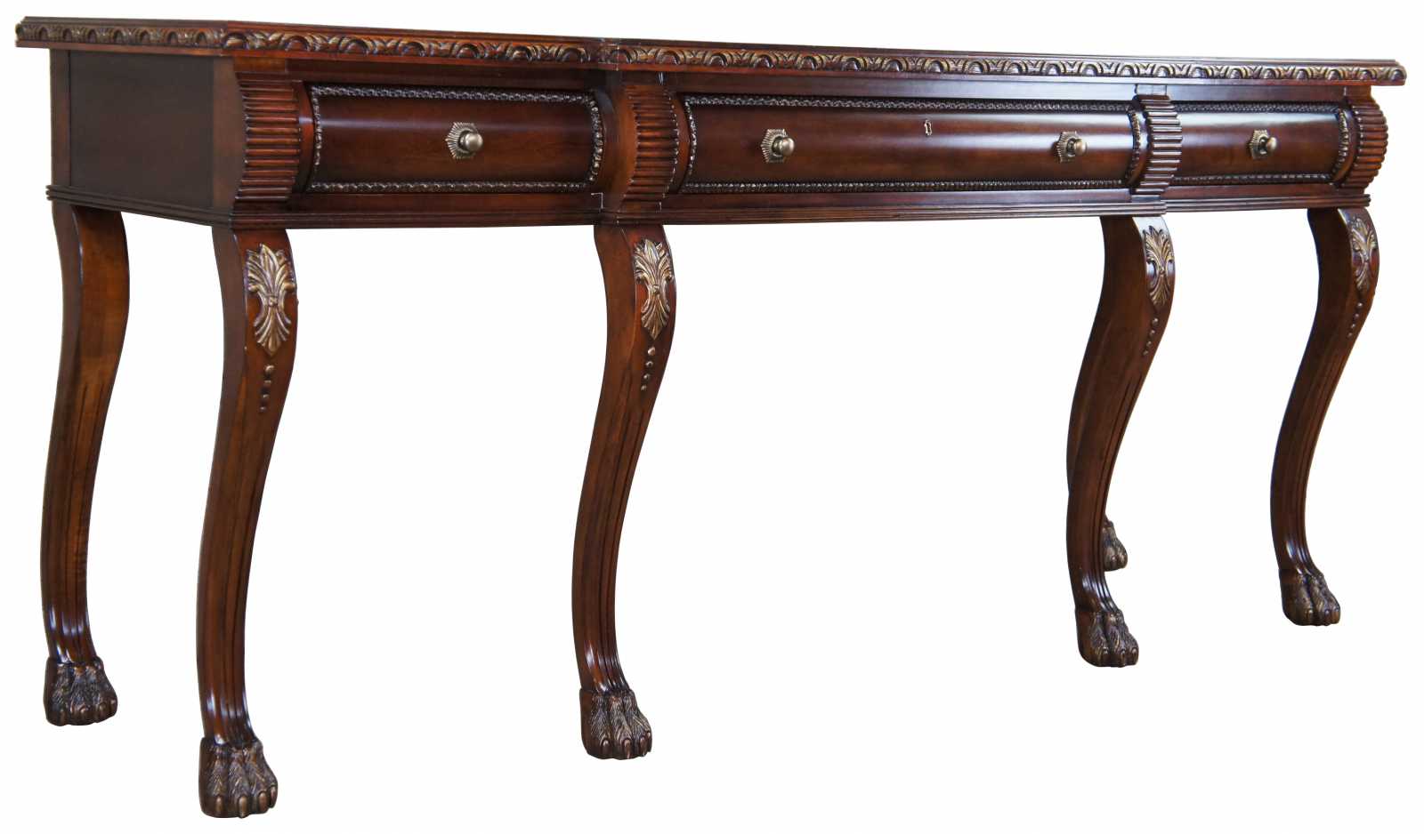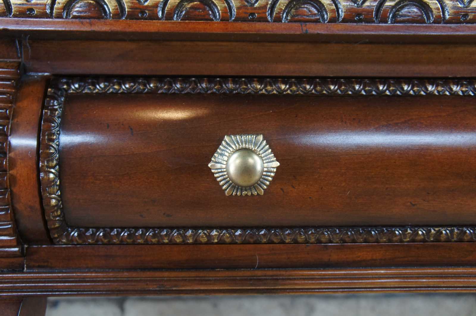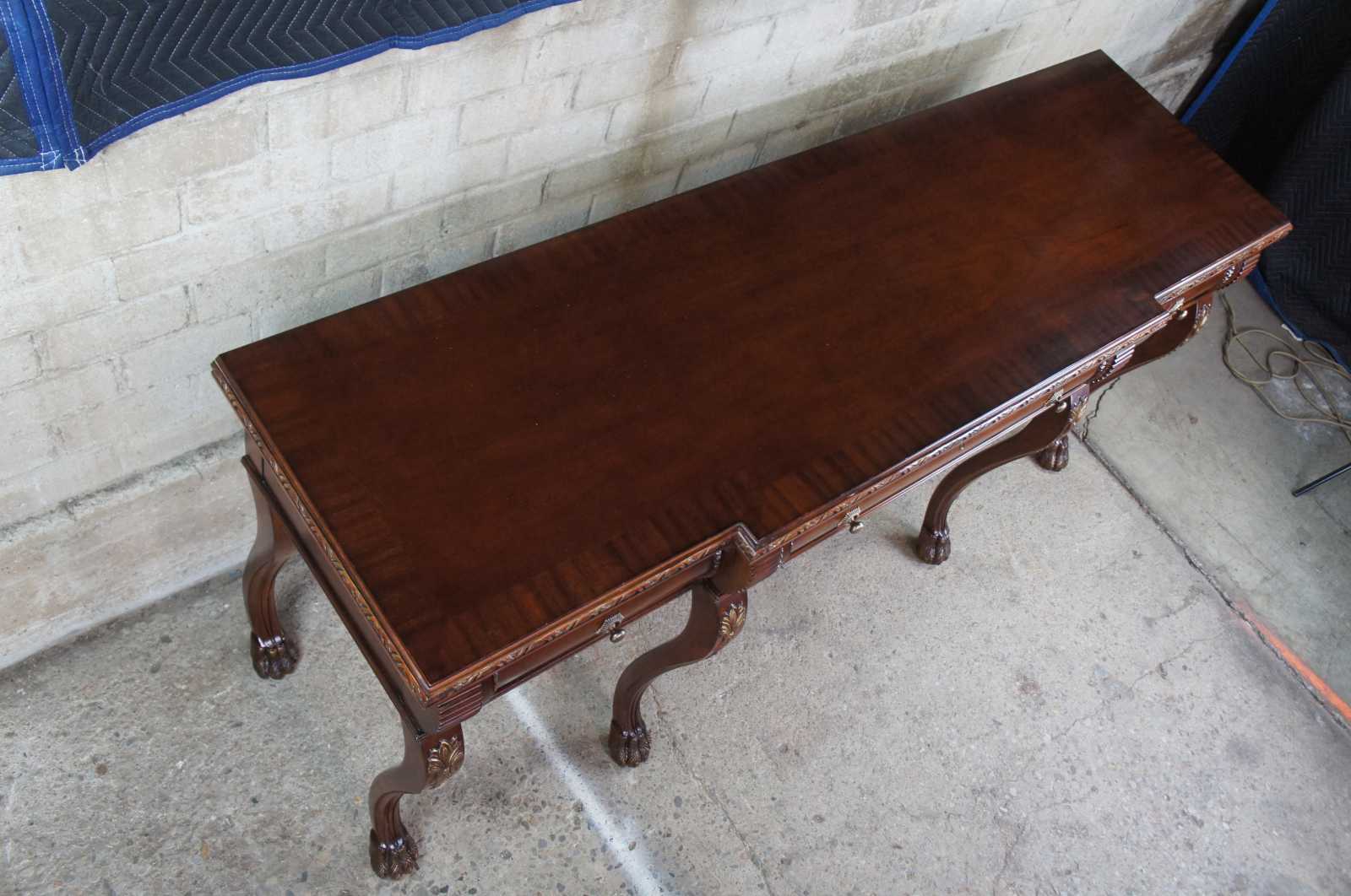 Century Furniture Chippendale Sideboard. Features a rectangular form with breakfront over 3 drawers and 6 swooping cabriole legs leading to paw feet. Includes a brushed gilt finish, gadrooning, fluting, carved crests and brass hardware. Great for use as a server, console, credenza, sofa table, dry bar or server.