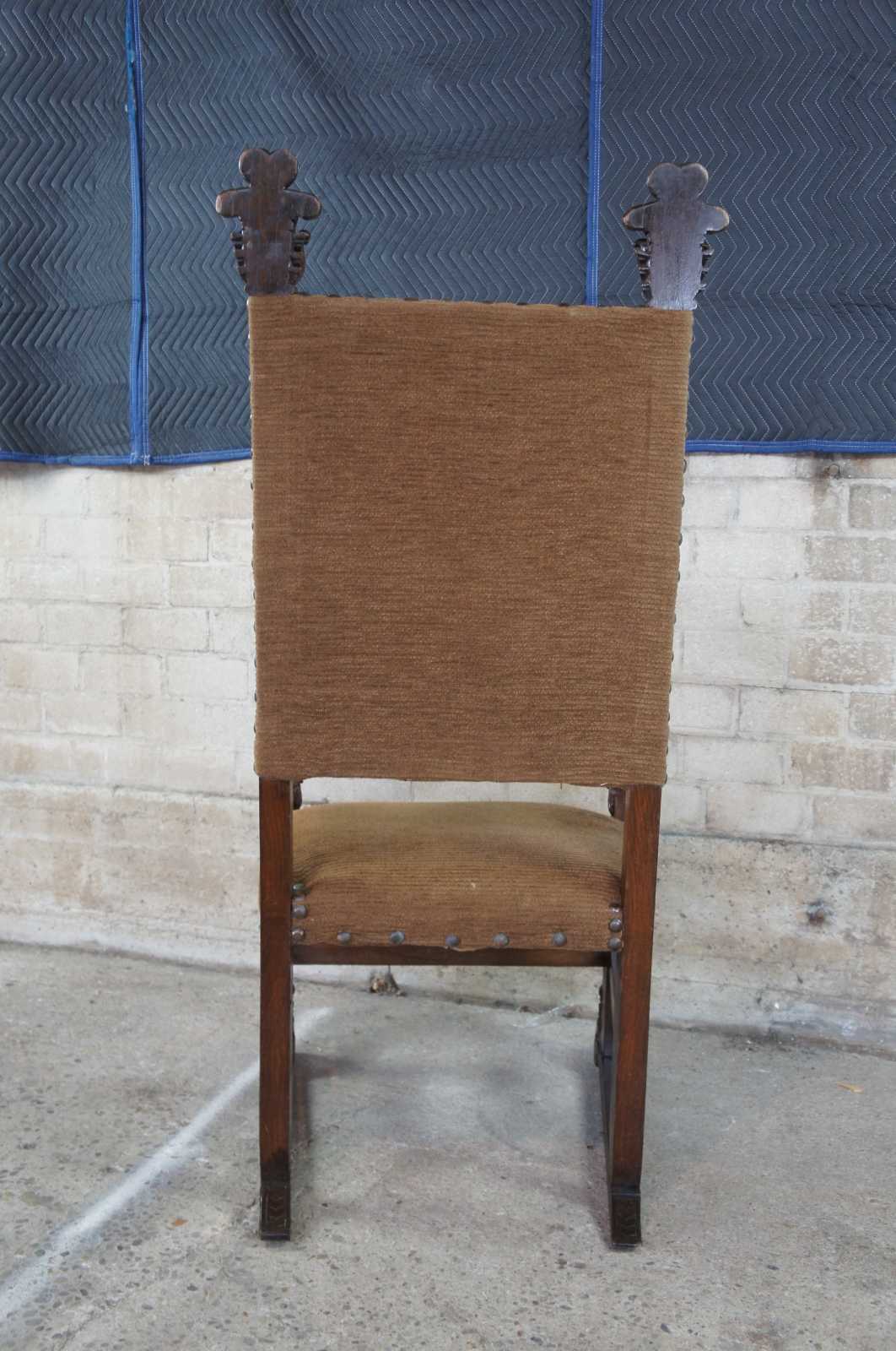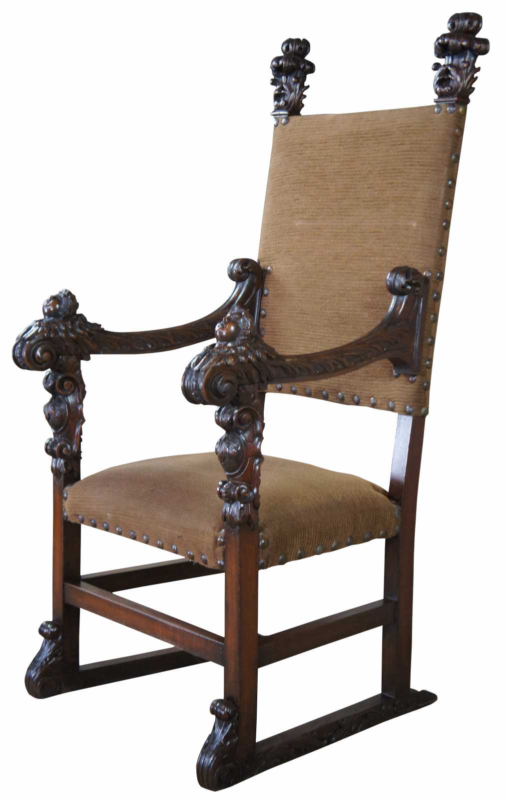 Monumental 19th Century Italian Renaissance Old World Throne Chair. Made from oak with meticulously caved detail. Features scrolled arms topped with figural cherubs and acanthus leaves. Upholstered in beige with button tufting.
