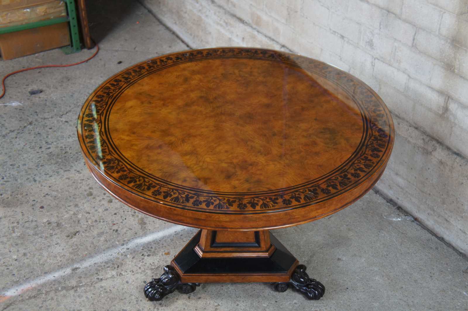 The Regency centre table, a rare piece, was designed in circular or round burr ash by George Bullock. Adorning the inlaid top is a broad border of ebonized floral vines within ebonized bands. The frieze follows suit with ebonized mouldings above a tapering, triangular support with raised ebonized mouldings. A moulded plinth with dark ebonized lion's paw feet is carved with floral scrolls and inset with brass casters.