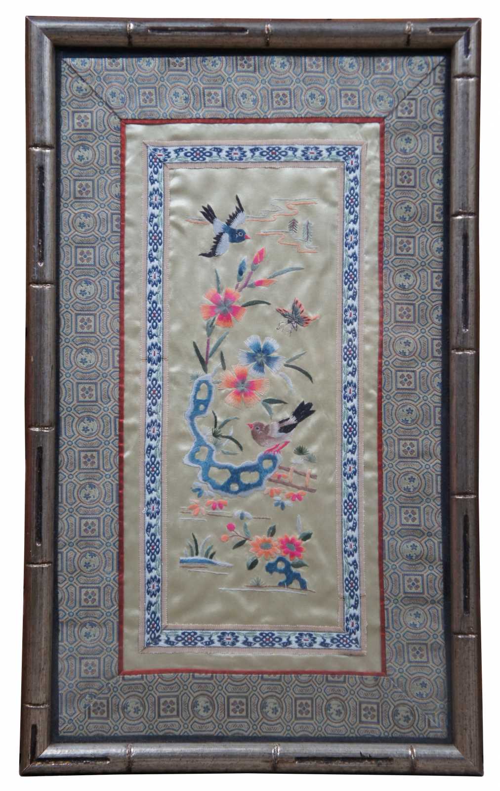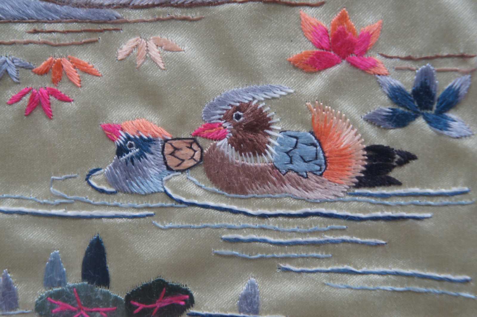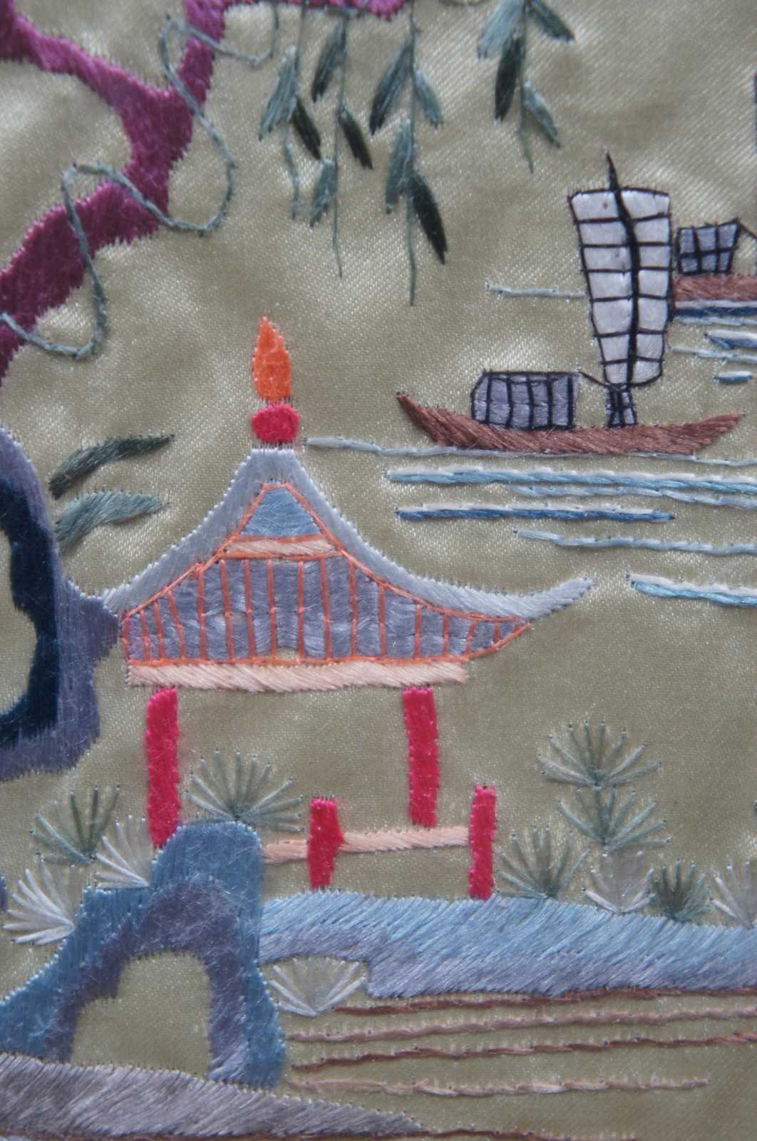 Pair of framed hand embroidered Chinese tapestries on gold silk, showing birds, flowers, nautical boats and pagoda / cottages.
