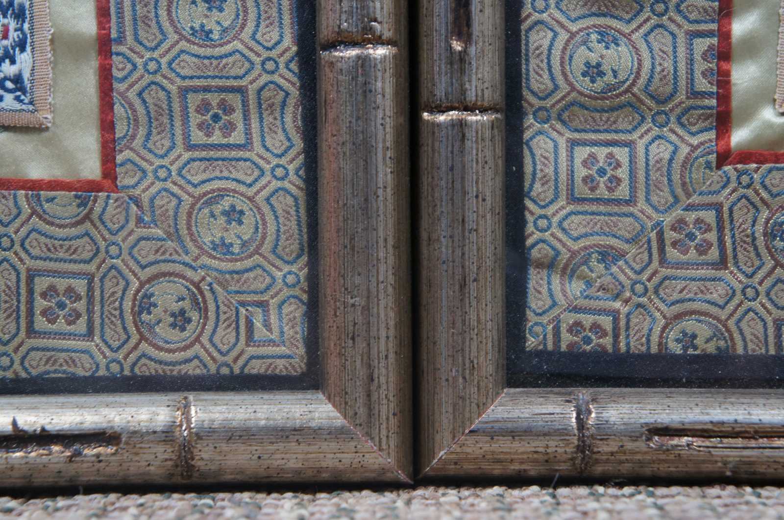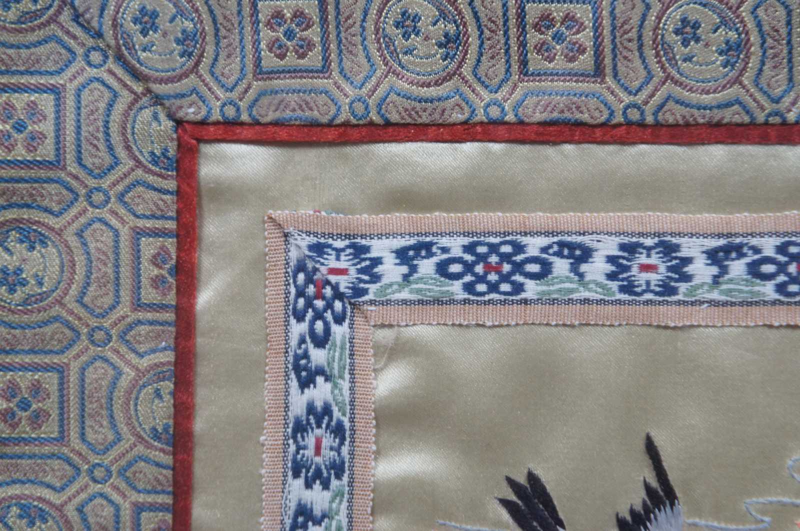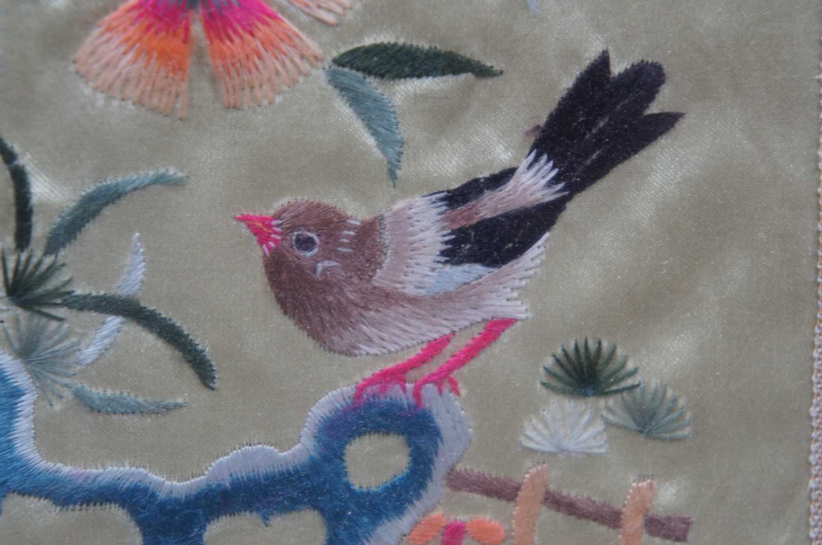 Pair of framed hand embroidered Chinese tapestries on gold silk, showing birds, flowers, nautical boats and pagoda / cottages.
