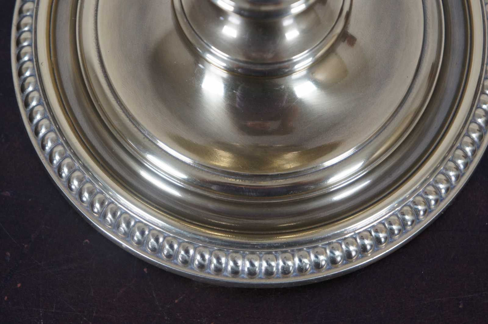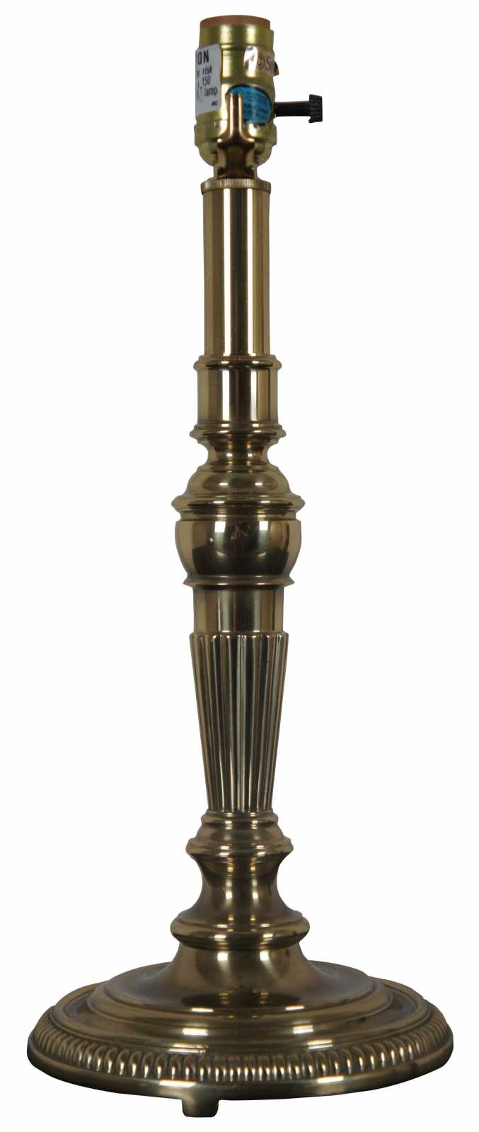 Vintage Stiffel brass candlestick style table lamp with wide base and column shaped body.