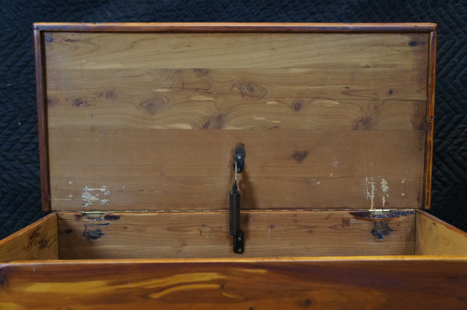Antique cedar wood chest with brass plate on the front, petite size perfect for a child’s room; bottom rails and rubber feet appear to be a later addition.