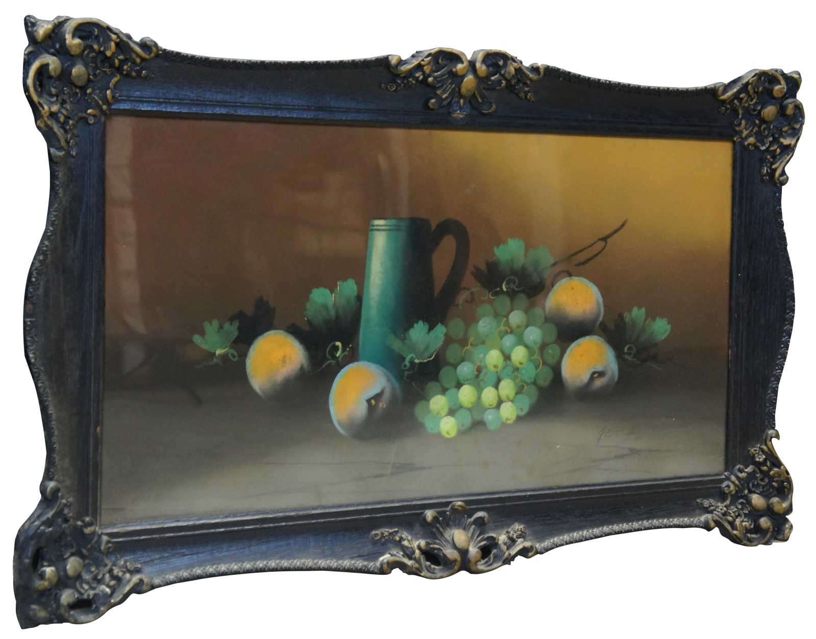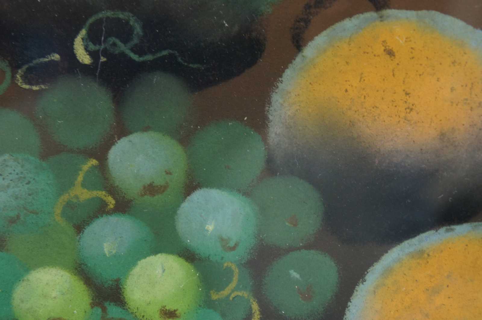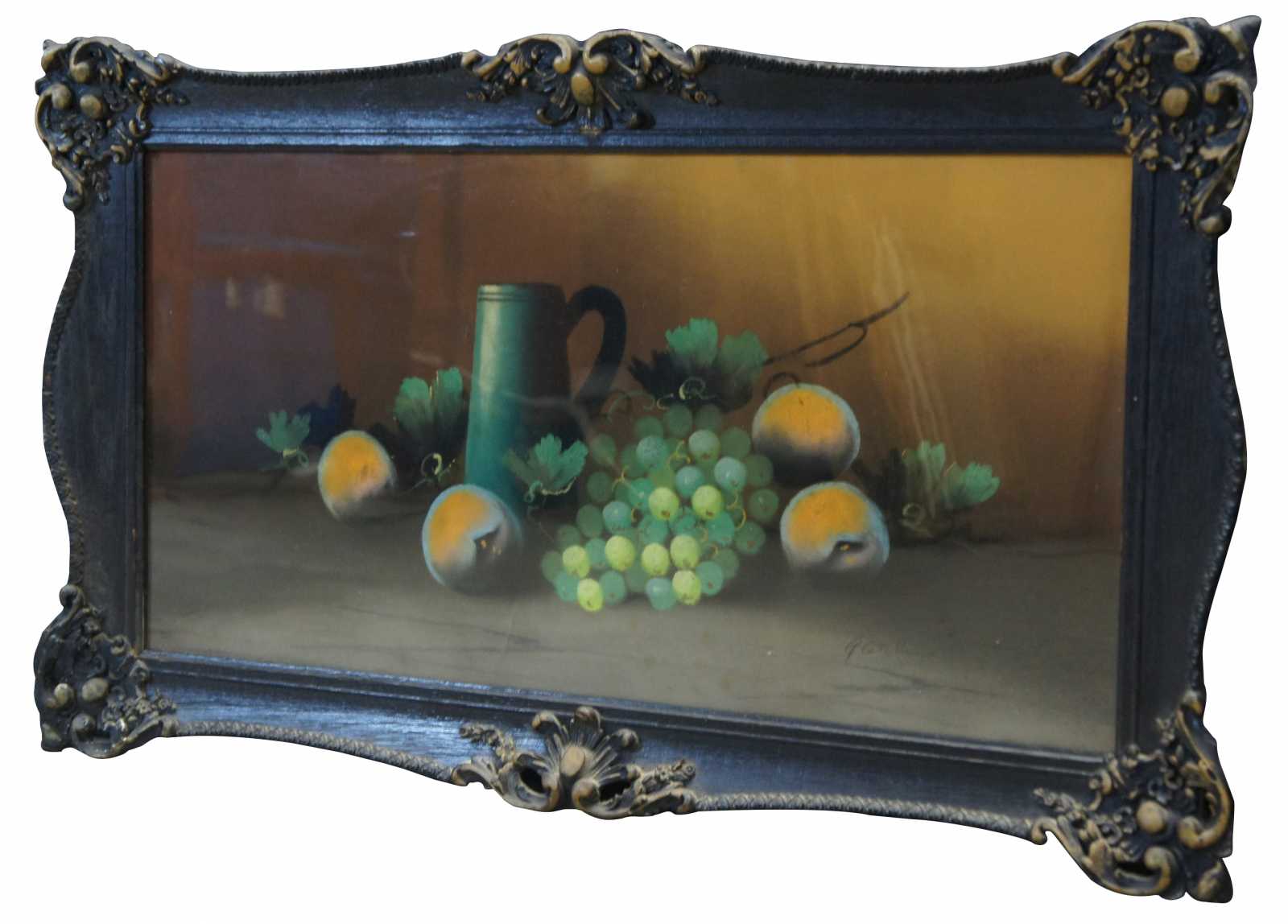 Albert Glatthaar pastel painting of a still life with peaches, grapes and a tankard, in a black and gold carved frame; signed by the artist in the lower right.