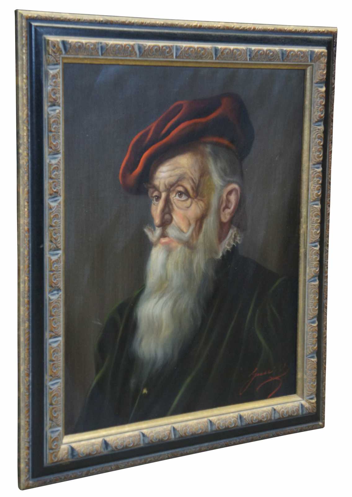 Vintage 20th century oil on canvas painting by Hungarian artist Jeno Gussich (1905 - ), showing an old man with white hair and beard, wearing a dark green velvet smock with an Elizabethan style lace collar and red beret.