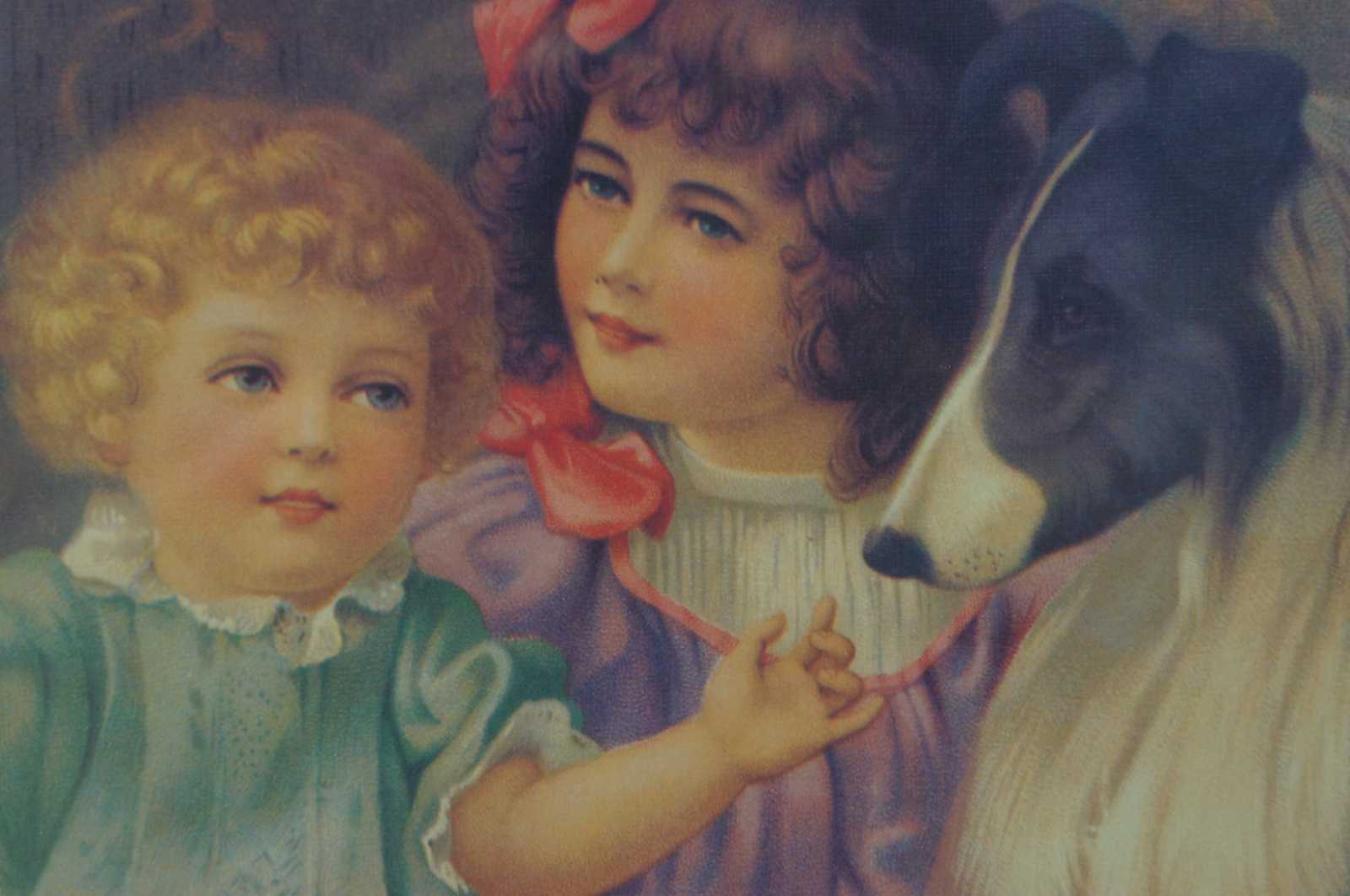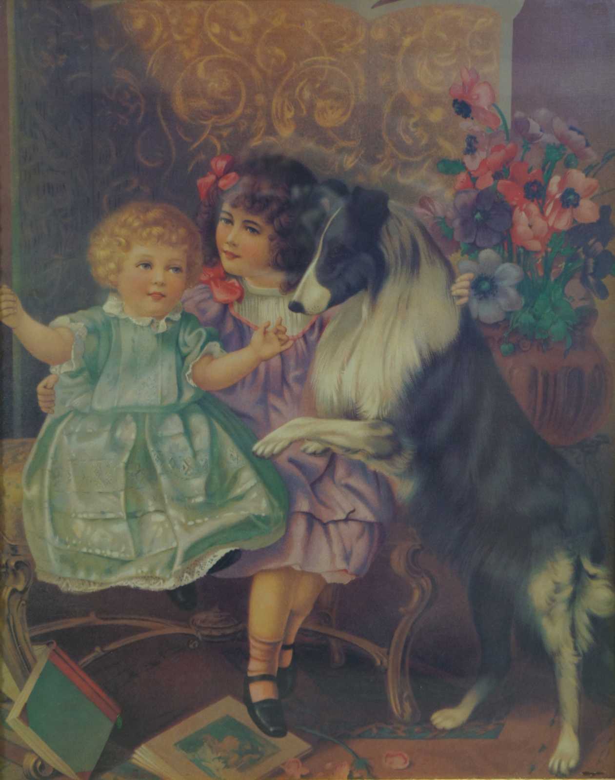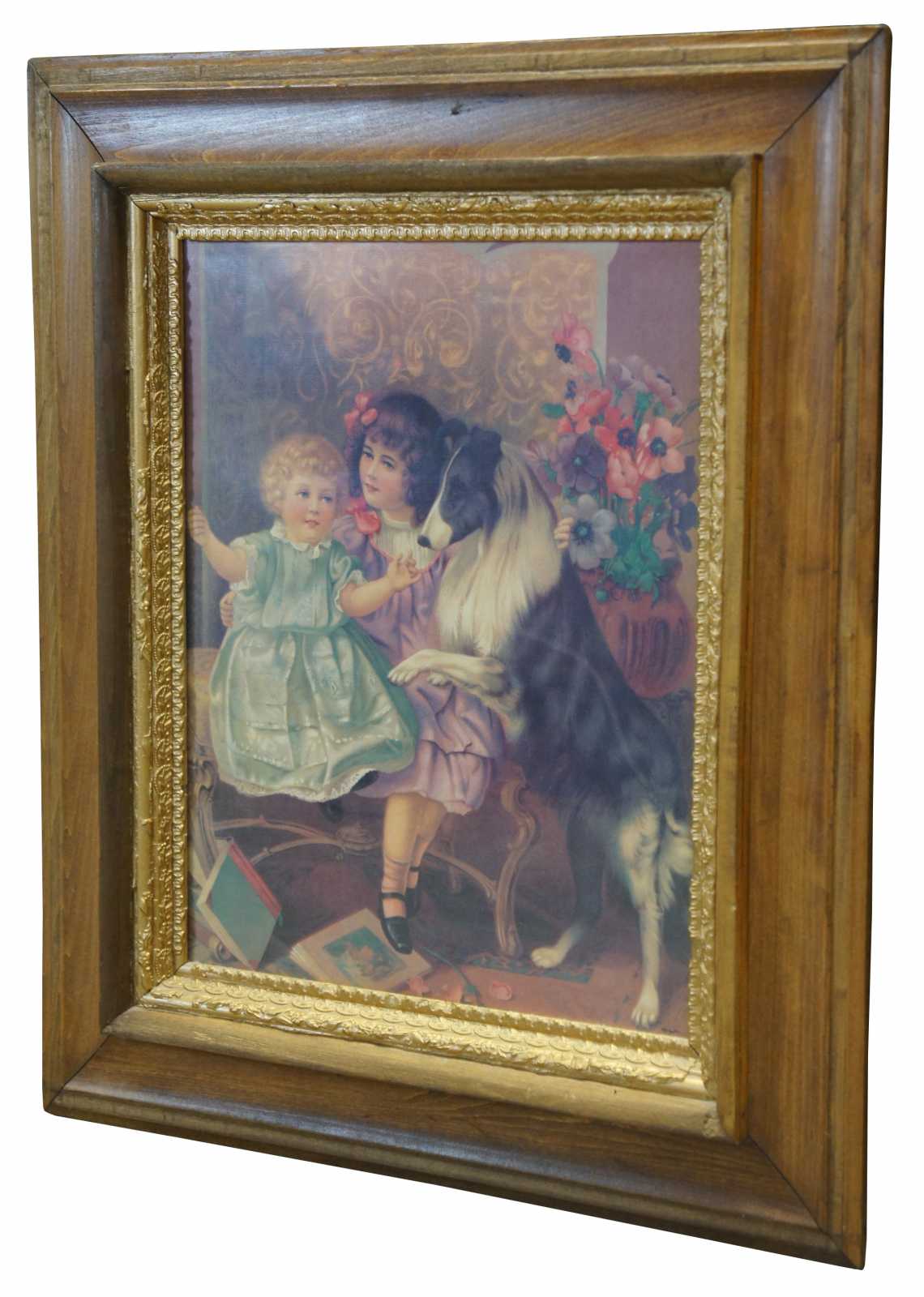 Antique Victorian lithograph print of an illustrated scene of two young girls on a settee with a rough collie.