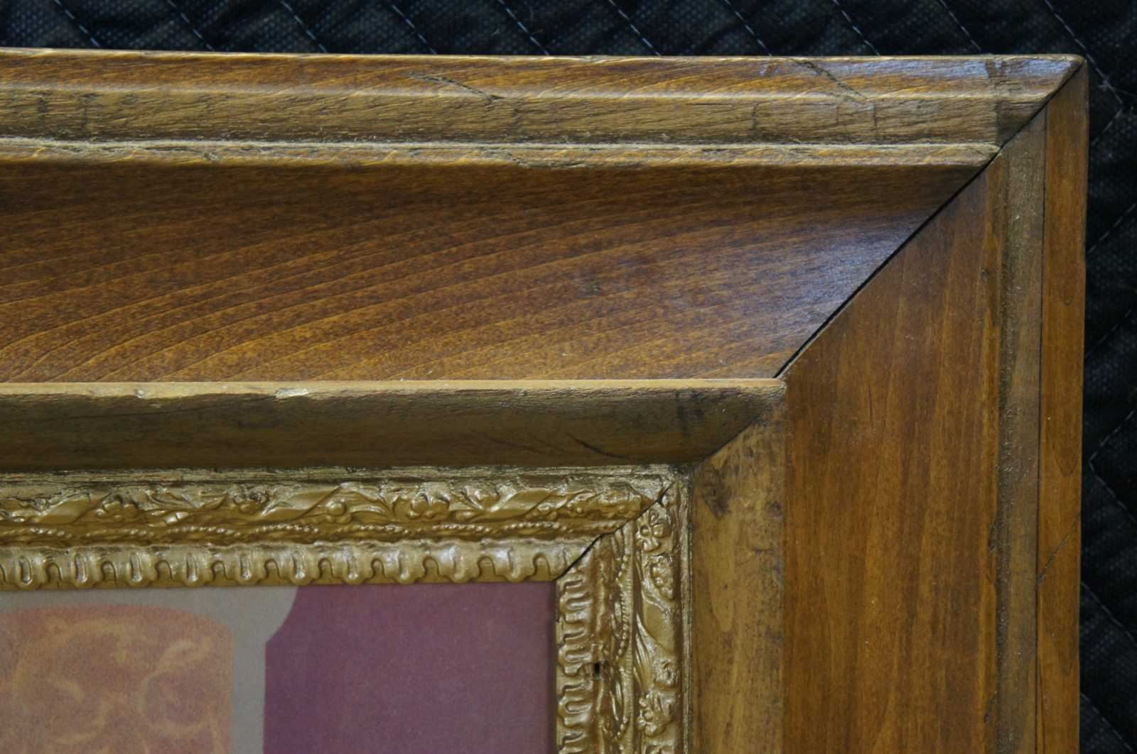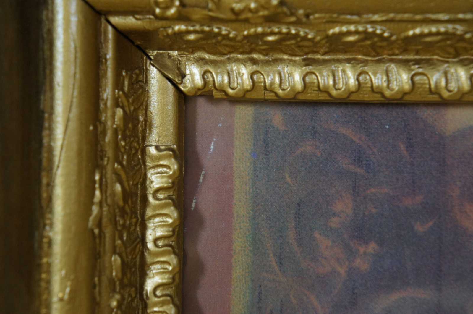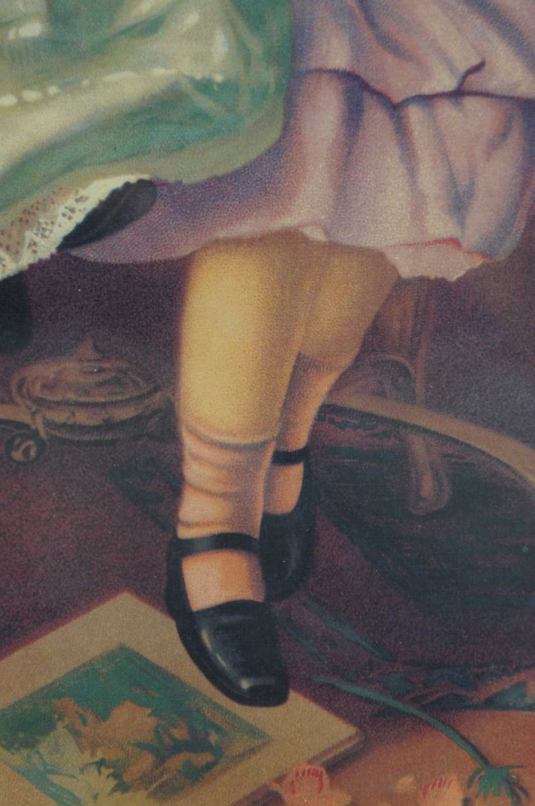 Antique Victorian lithograph print of an illustrated scene of two young girls on a settee with a rough collie.