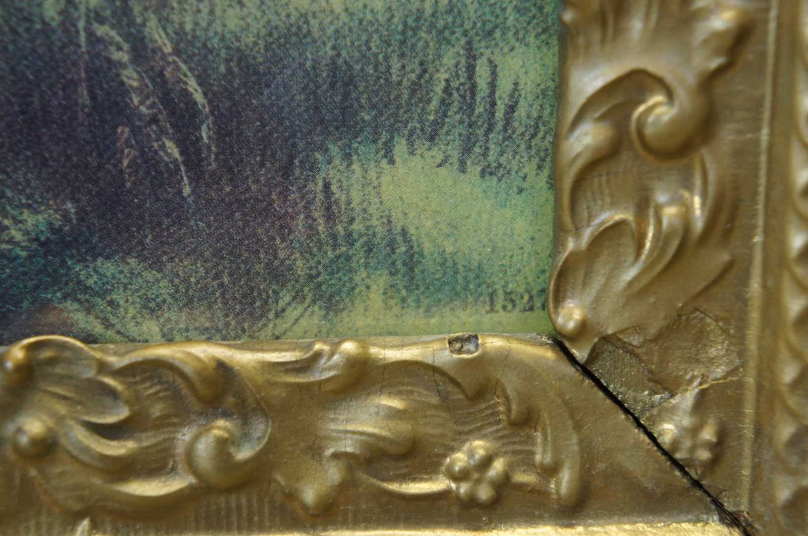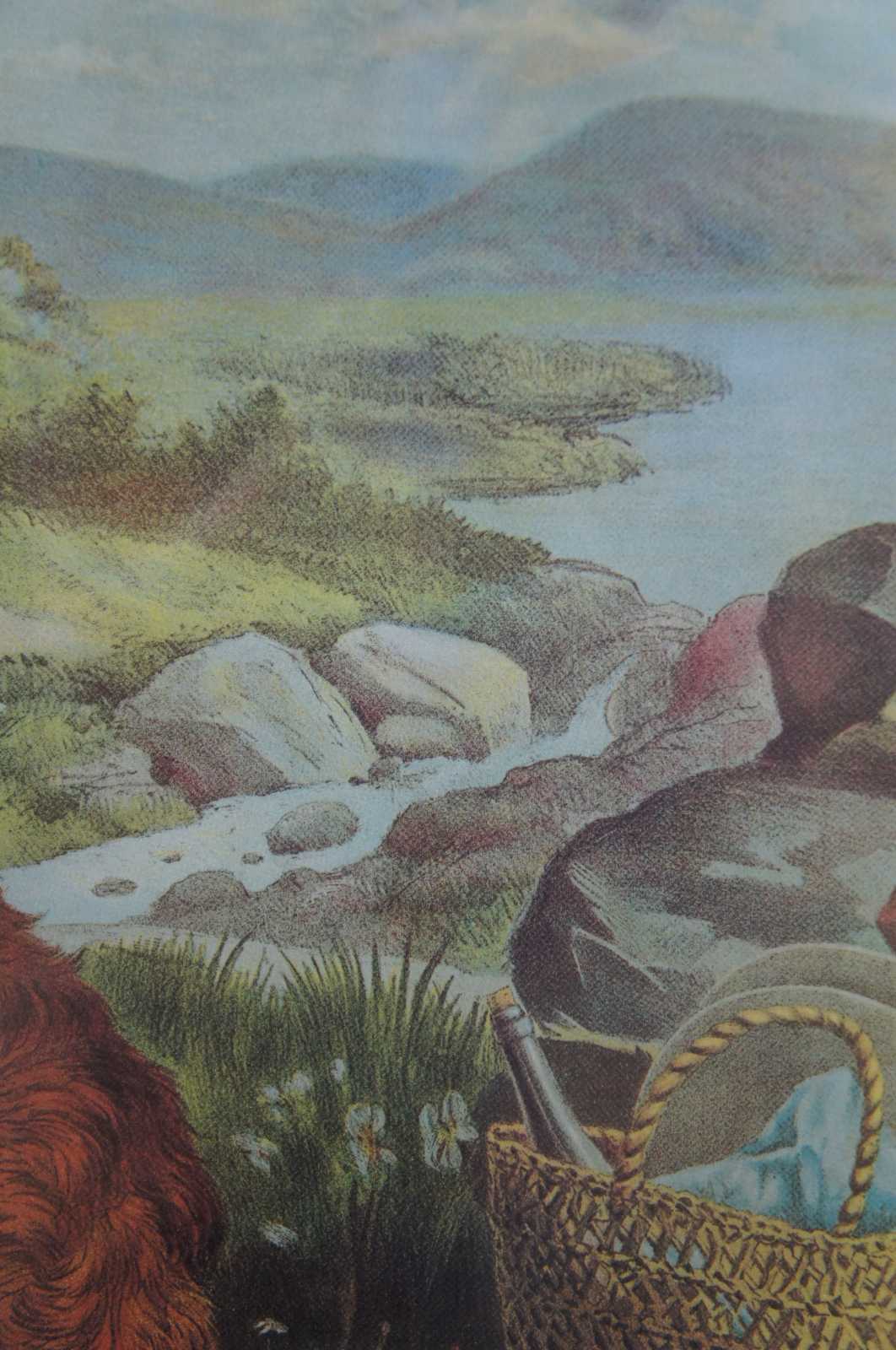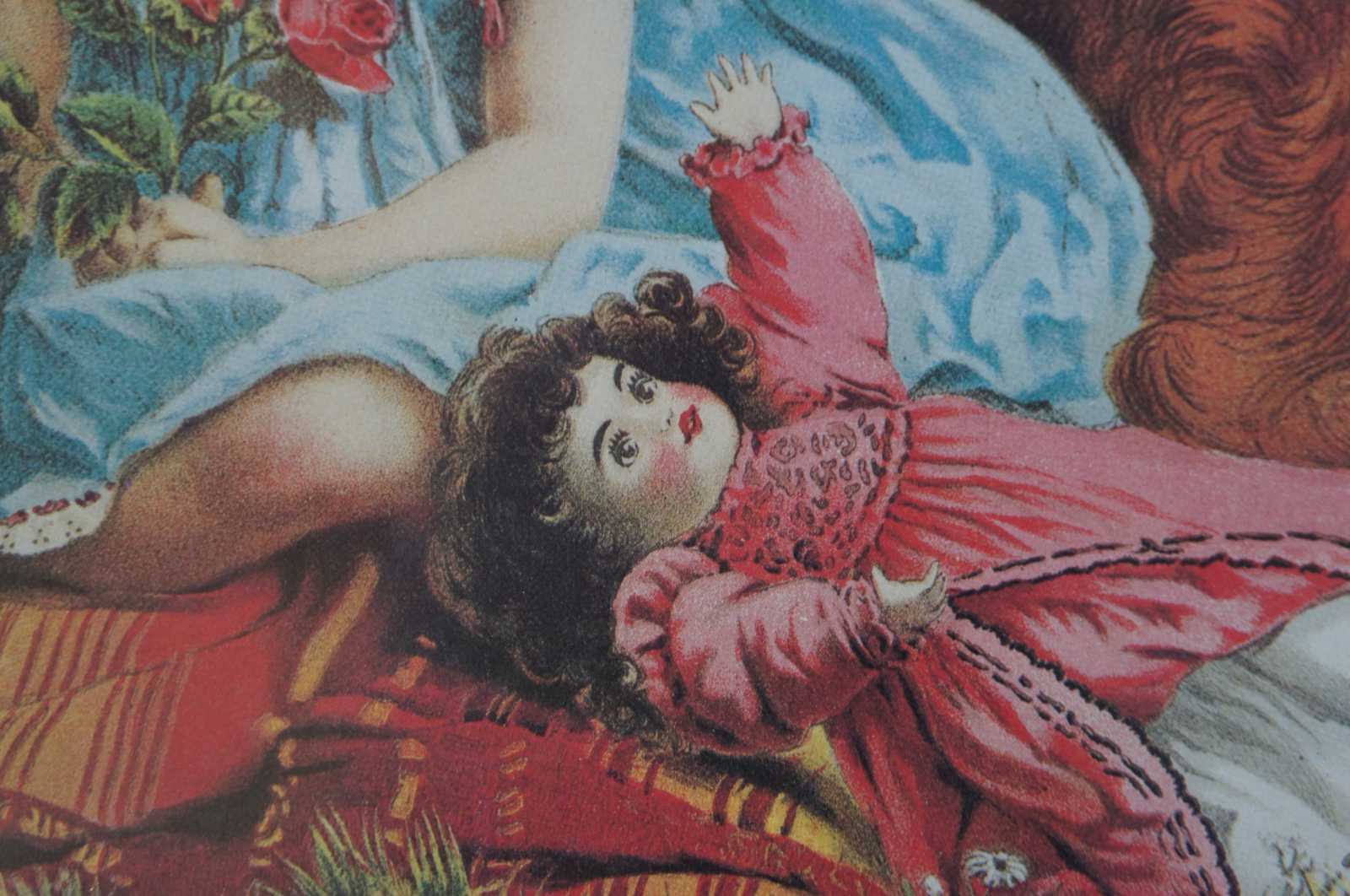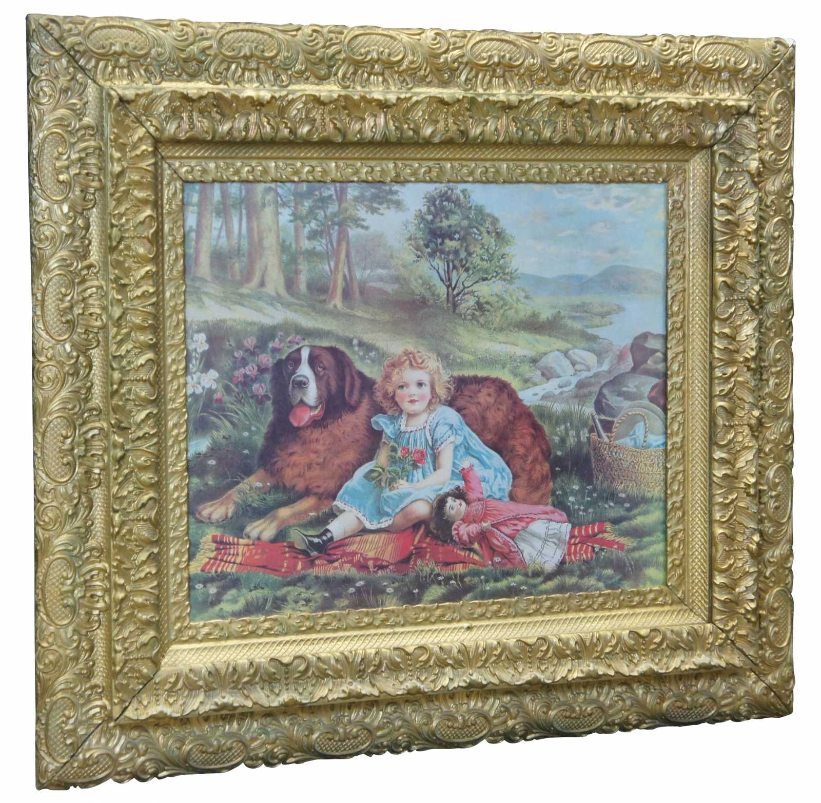 Antique Victorian electro-grain gravure print featuring a little girl seated with a doll and a Saint Bernard. Number 1527 by McLoughlin Bros, 1902.