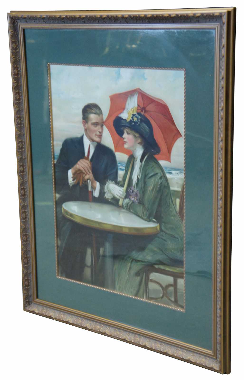 Framed lithograph print of a Victorian couple seated at a table by the sea shore, the man holds a cane and gloves and the woman a red parasol.