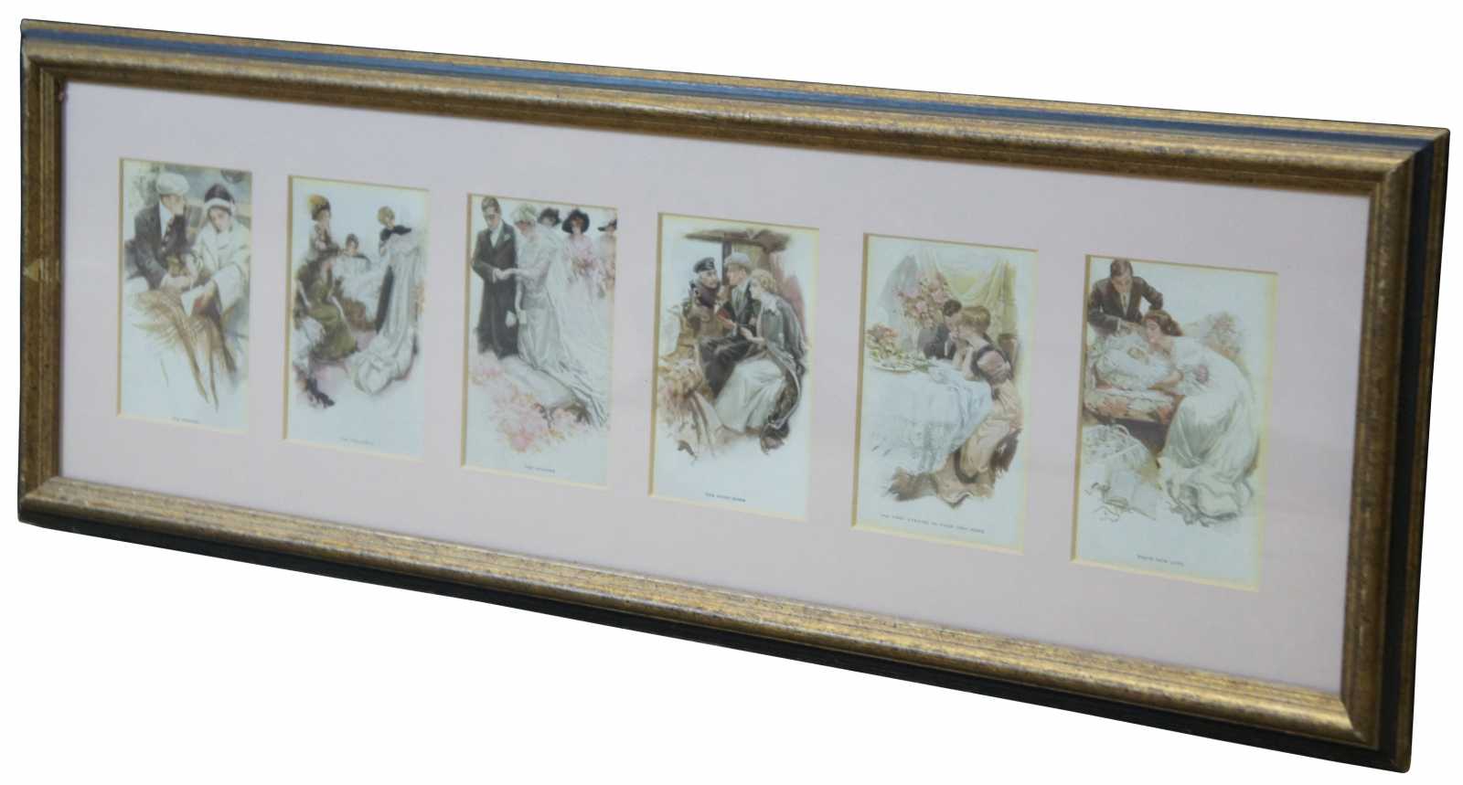 Framed set of early 1910’s six part picture postcard series entitled “Greatest Moments of a Girl’s Life” by Harrison Fisher, published by Reinthal & Neuman. “Harrison Fisher (1875-1934) became nationally known for his illustrations of beautiful women, known as the Harrison Fisher Girls. His illustrations appeared frequently in ""Saturday Evening Post"", ""Scribner's"", ""Life"", and ""Cosmopolitan"".