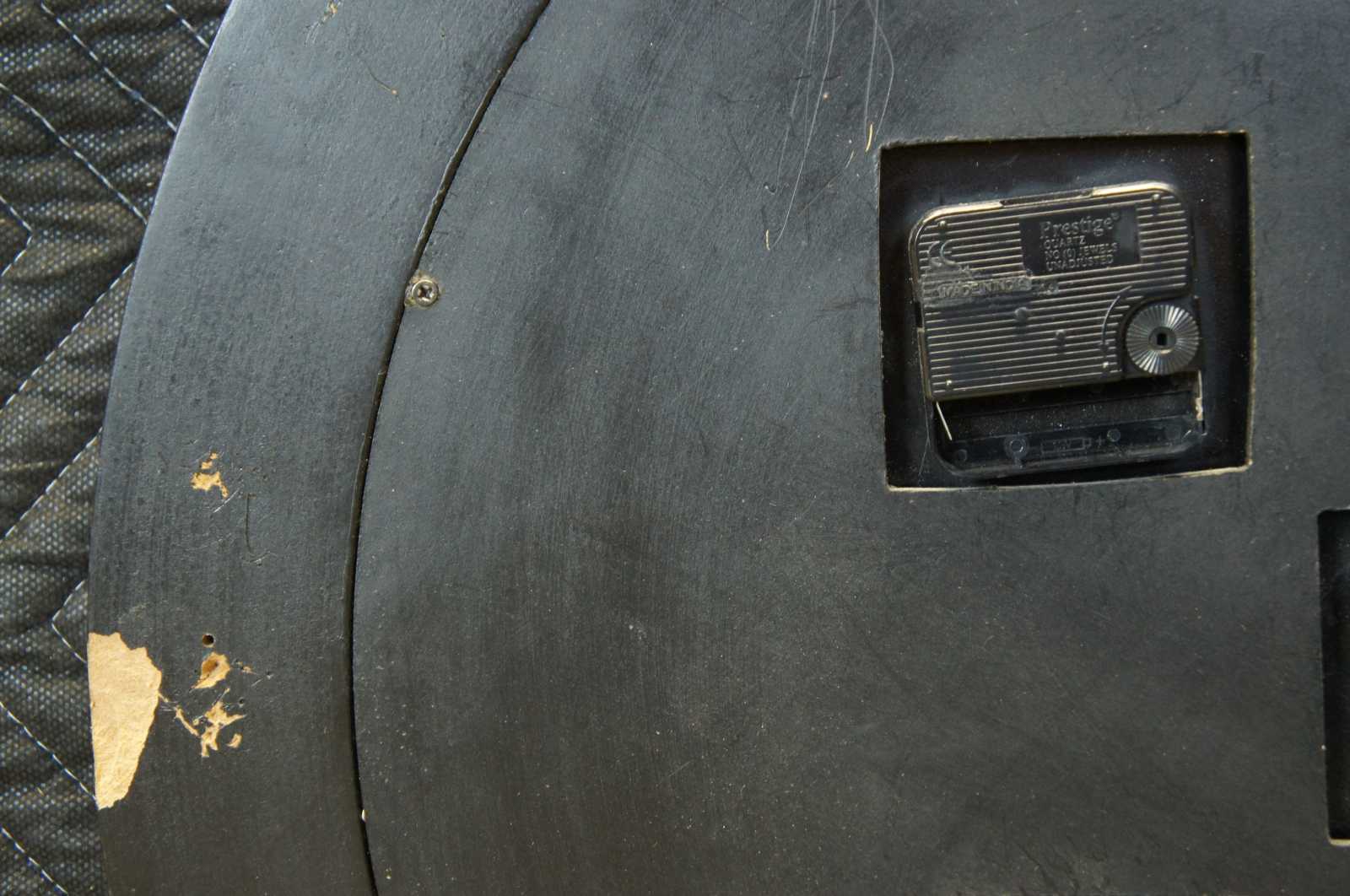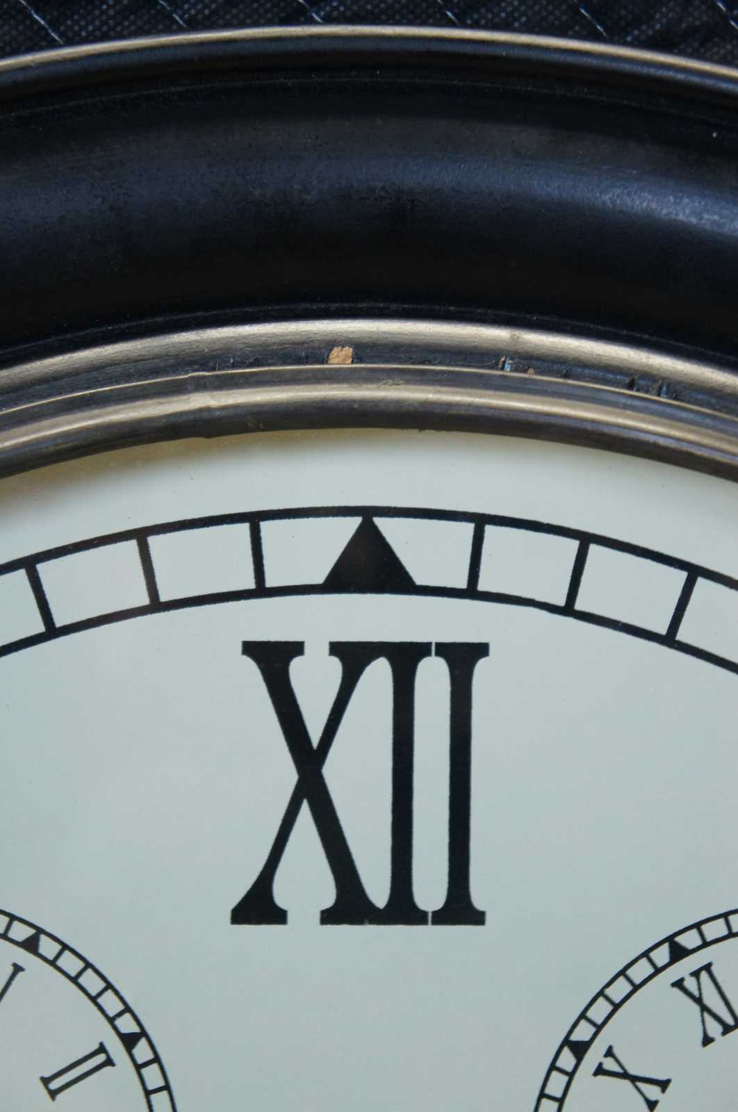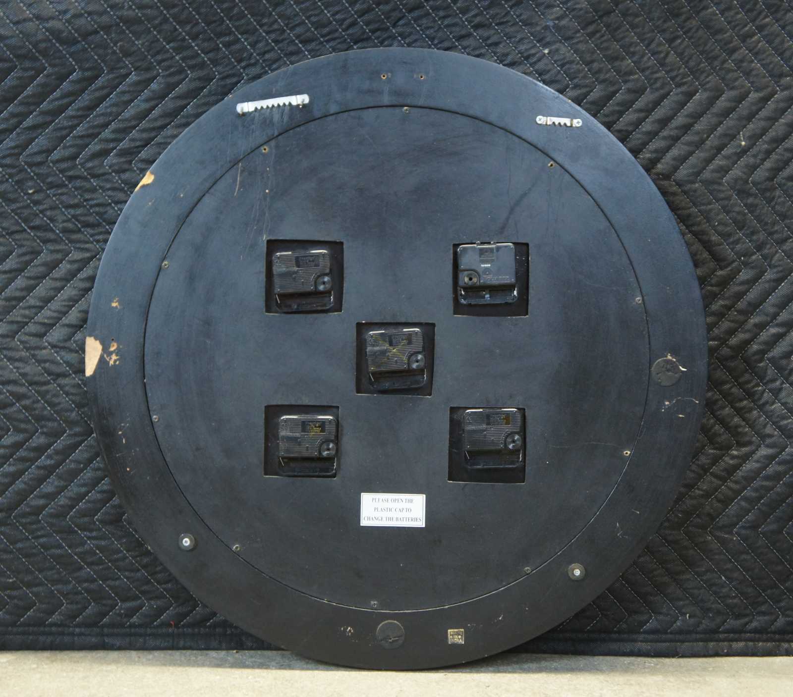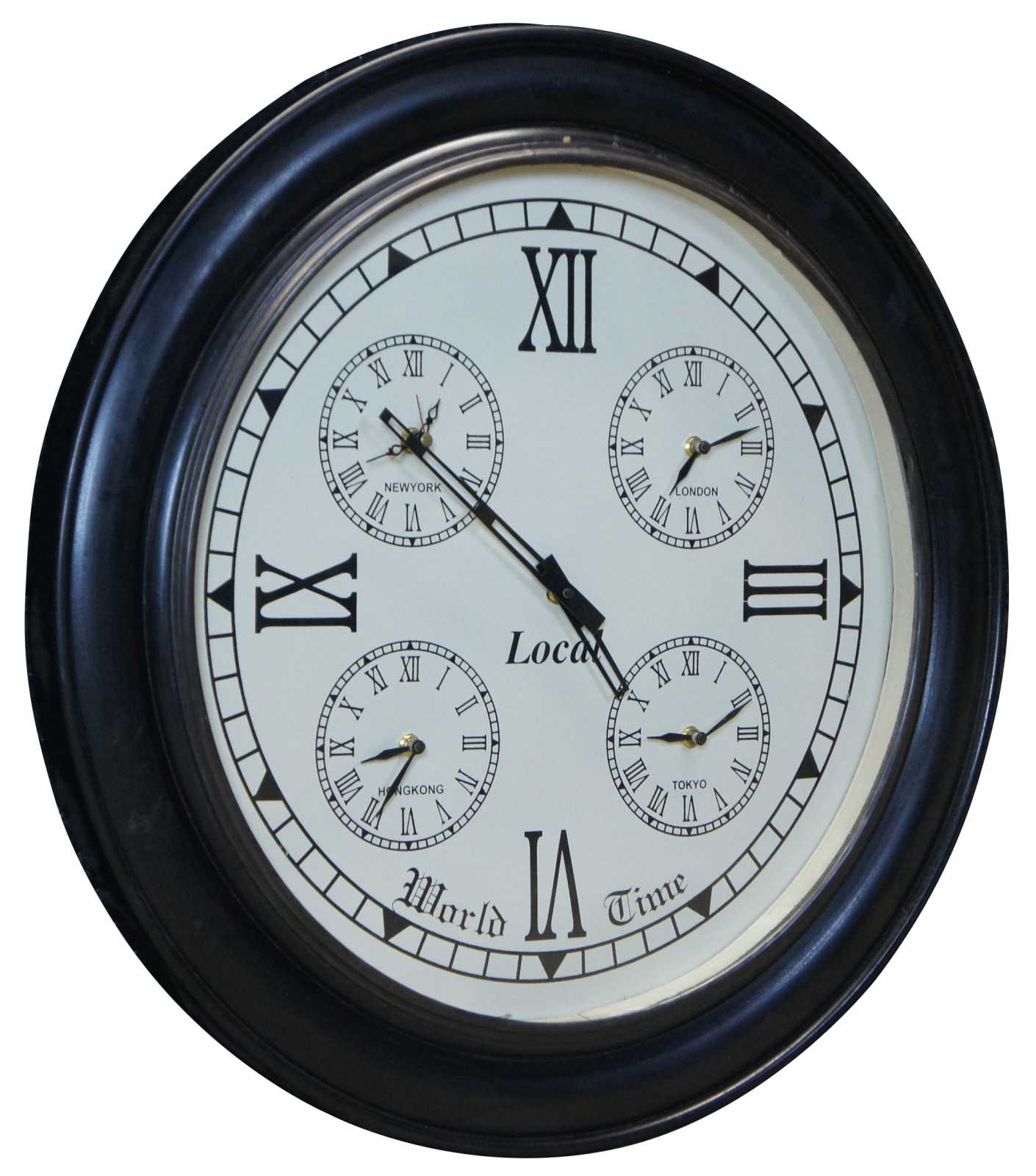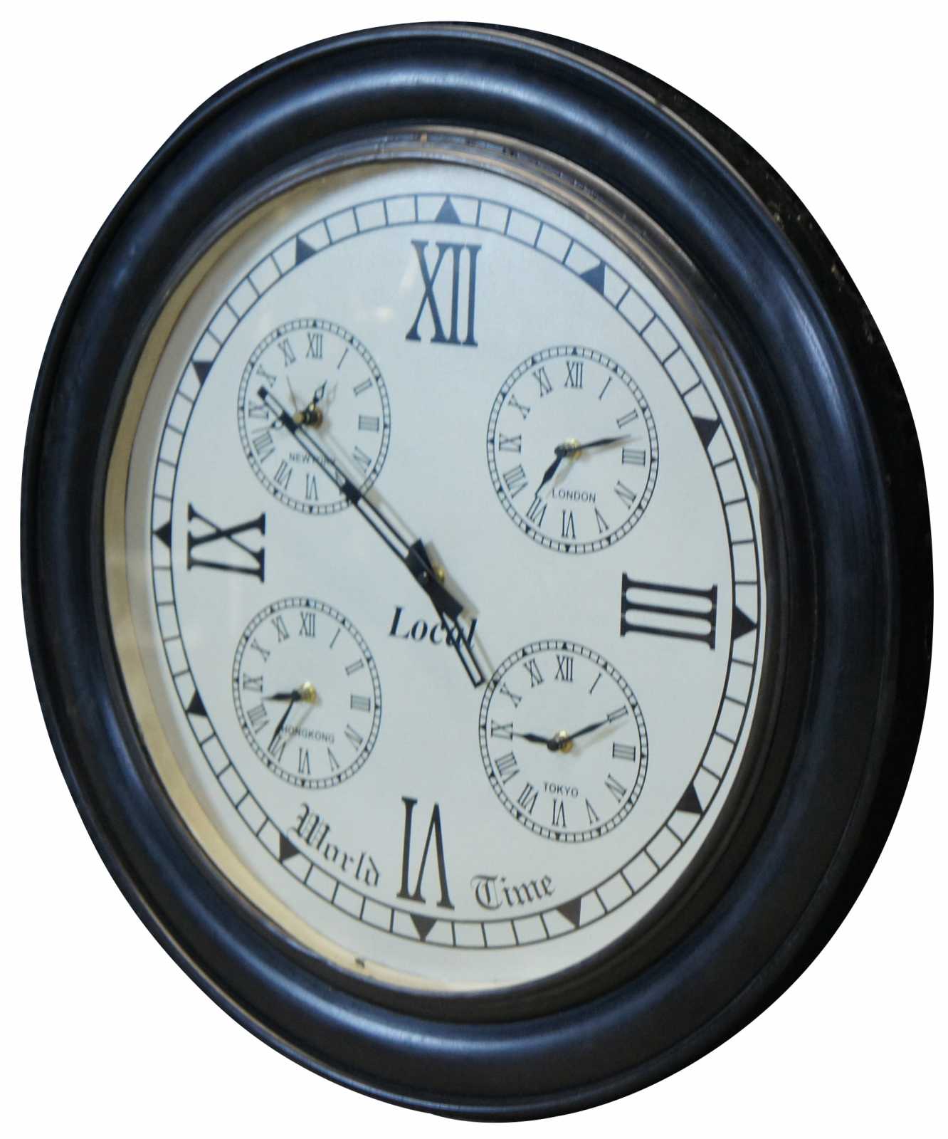 Battery operated local and world time wall clock with round beveled black wood frame and independently set faces for New York, London, Tokyo and Hong Kong.