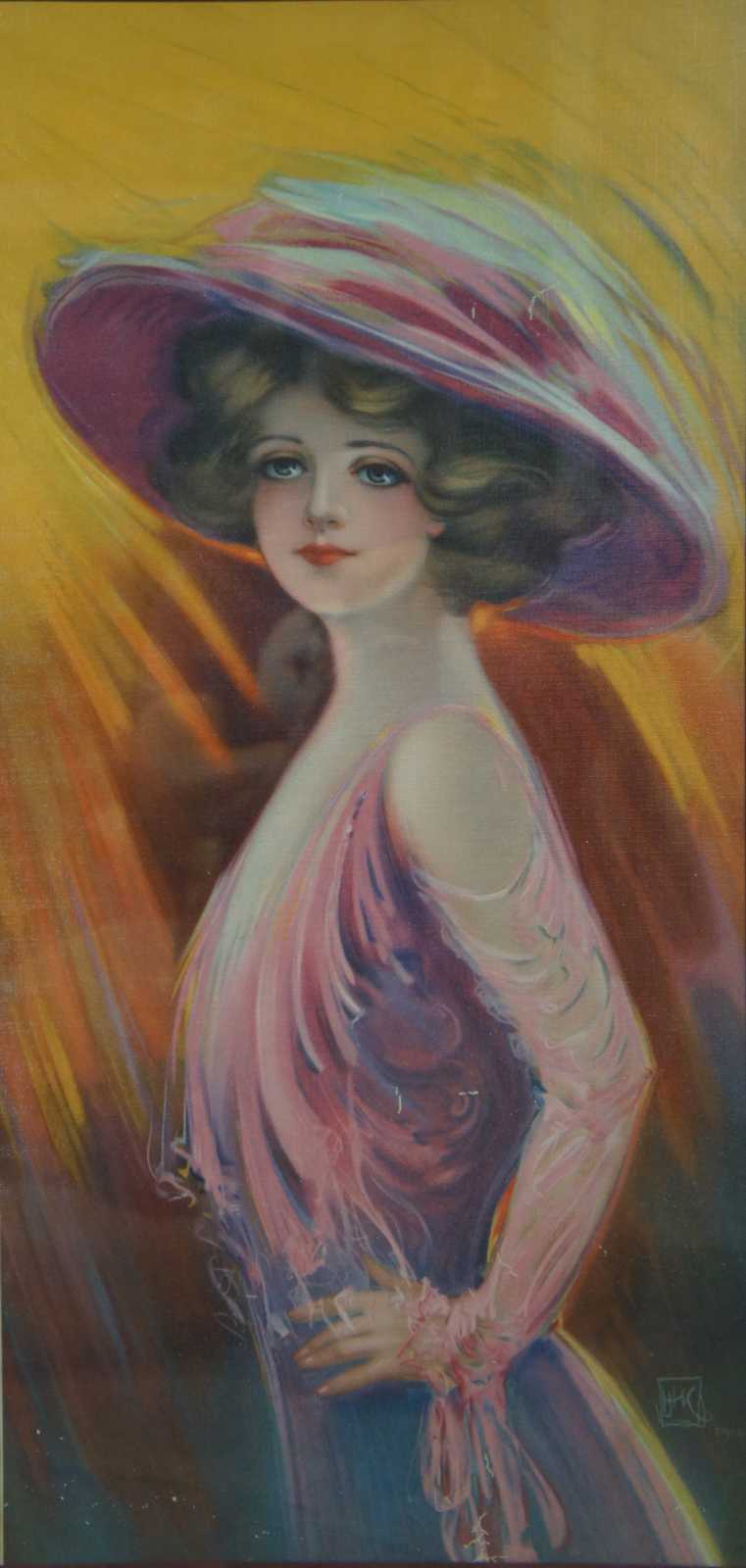 Vintage expressionist framed print of a Victorian woman in a pink dress and hat; artist initials “JHK” in the lower corner.