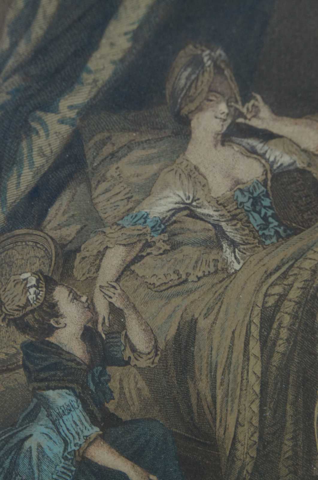 Antique Louis XVI mahogany trumeau wall mirror topped with a 1774 hand colored engraving titled “Le Lever” by Antoine Louis Romanet (1742-1810, French engraver and miniaturist) after Sigmund Freudenberger. “Sigmund Freudenberger (16 June 1745 – 15 November 1801) was a Swiss painter. Freudenberger was the son of a lawyer, and studied as a portraitist. He lived from 1765 to 1773 in Paris, where he worked with François Boucher. He then founded in a private art school in Bern and was known as "Little Master" for his genre-like depictions of rural life. “