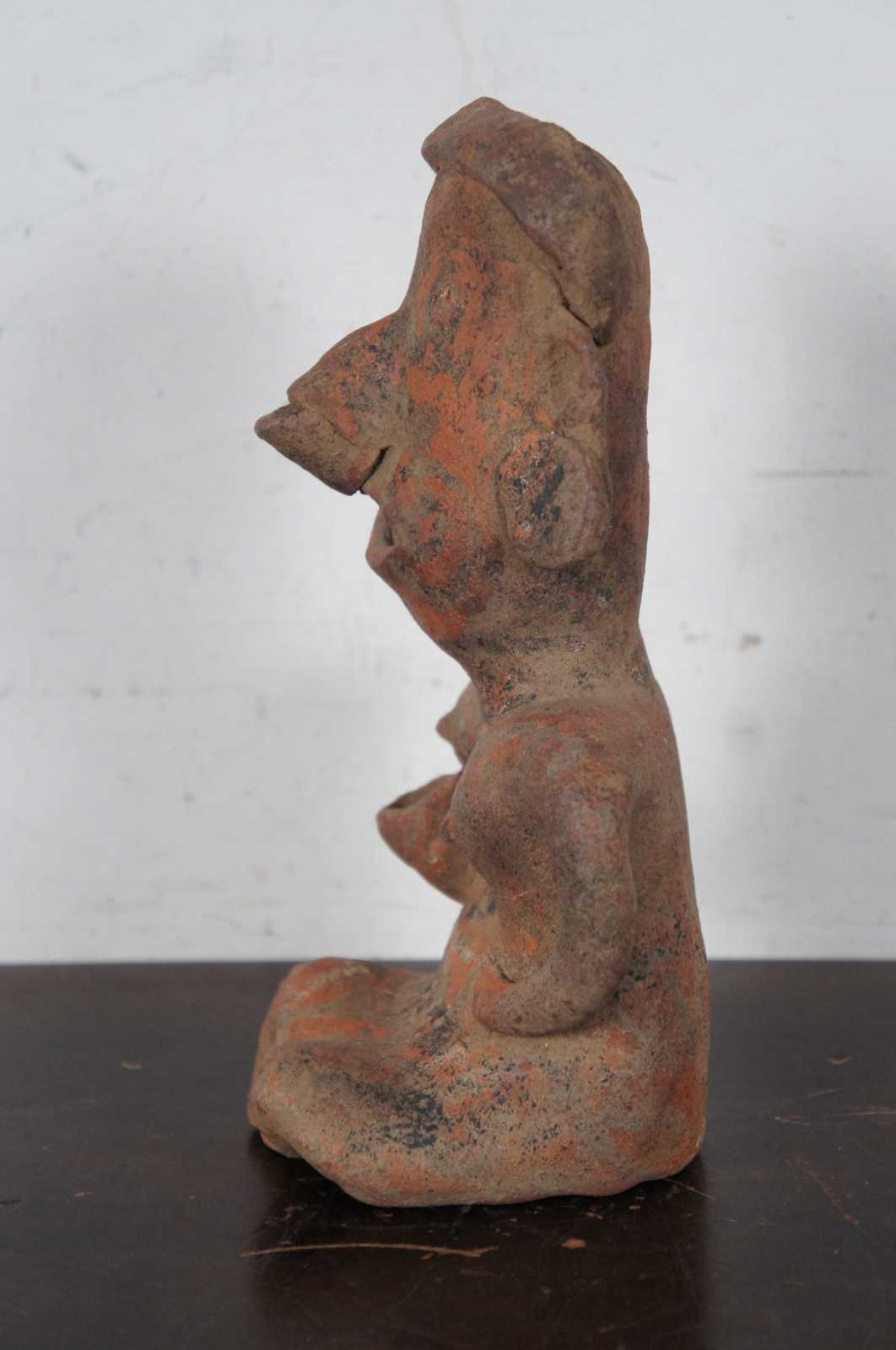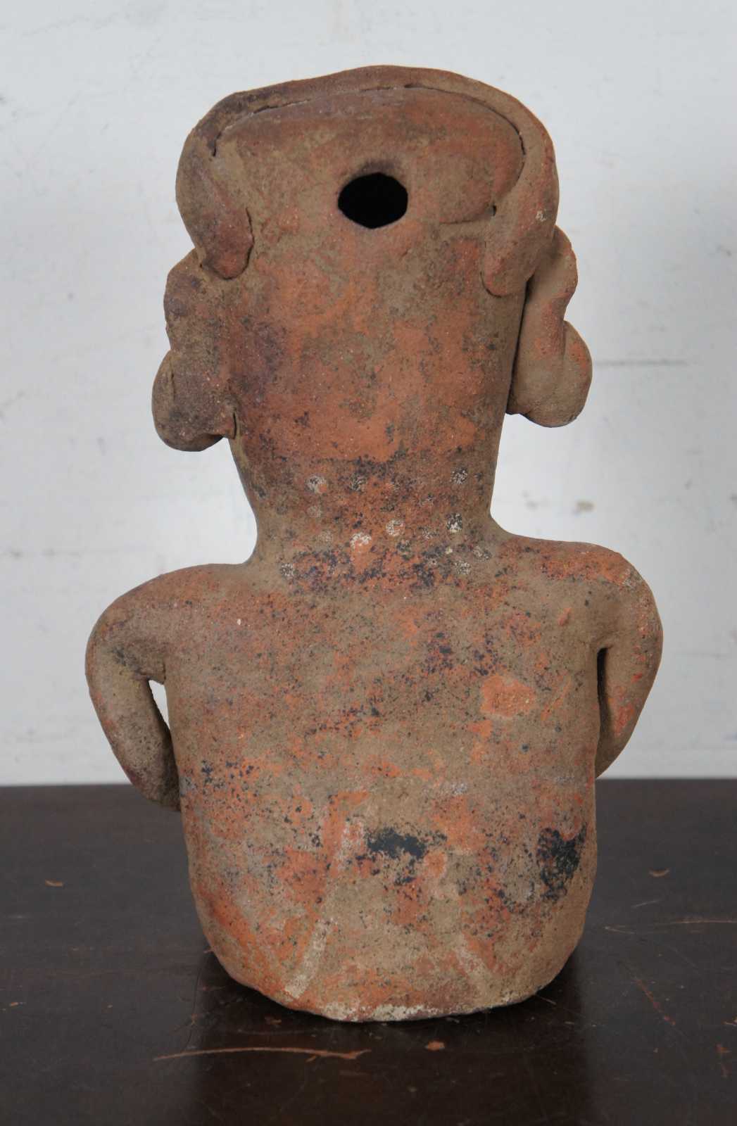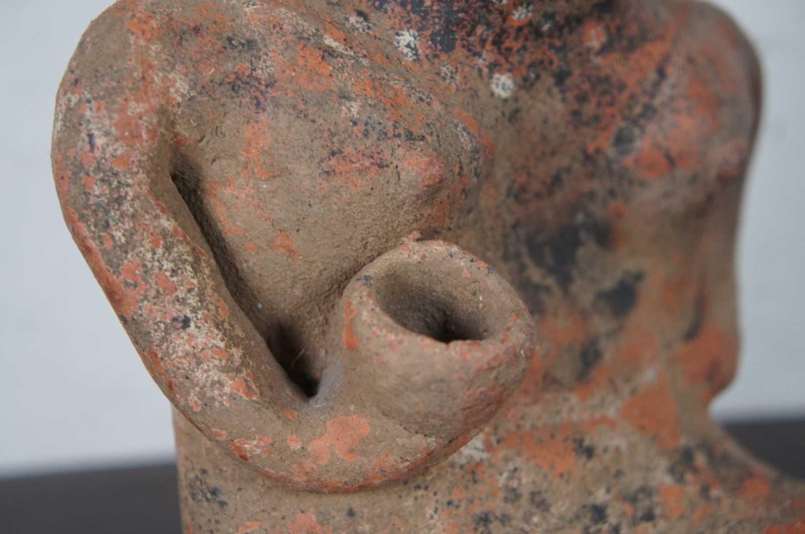 Impressive pre-Columbian Nyarit pottery earthenware vessel in the shape of a seated female figure holding a cup with a spout opening from her nose.