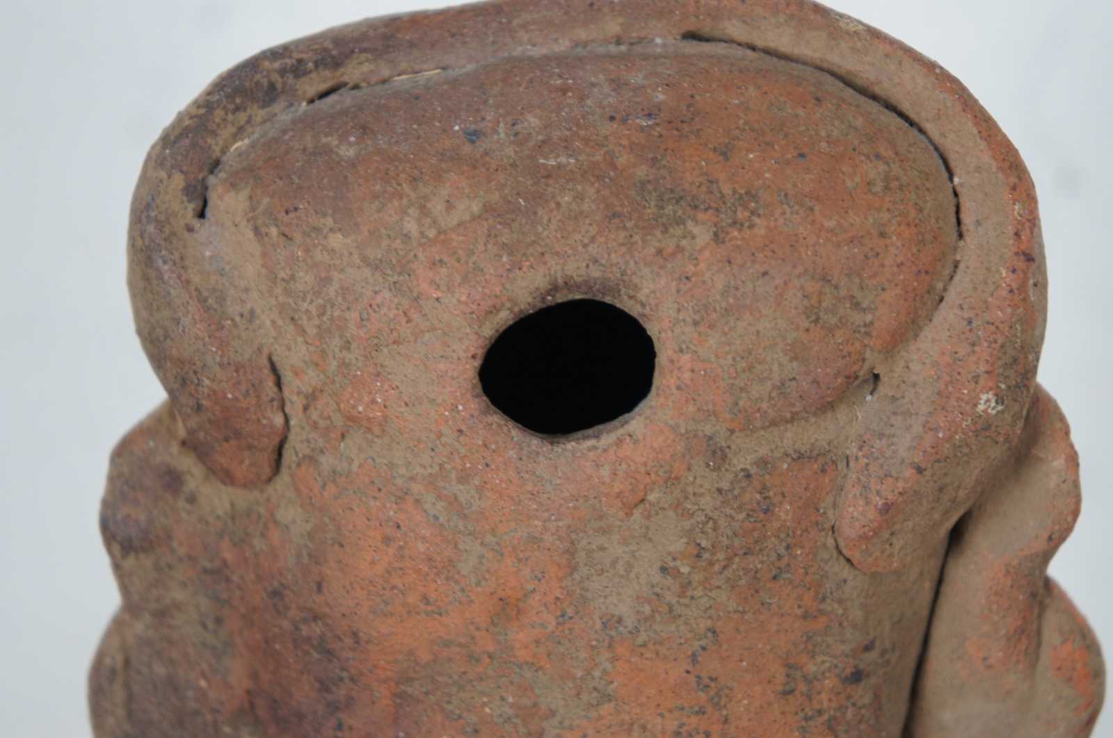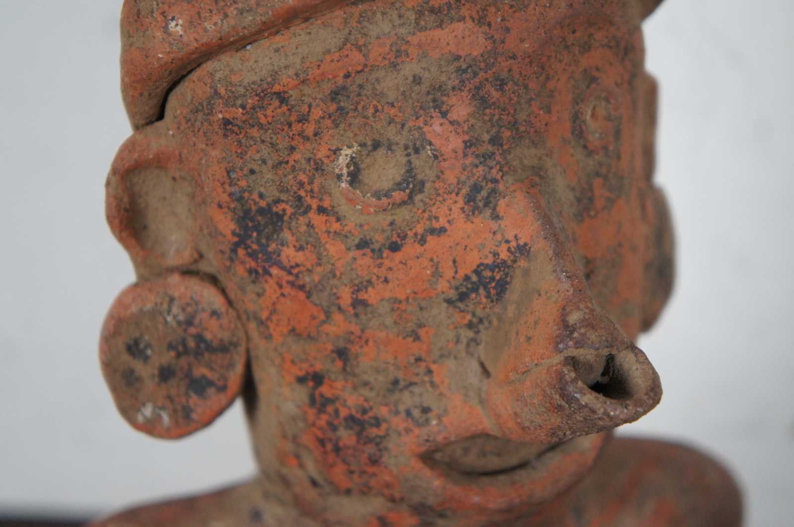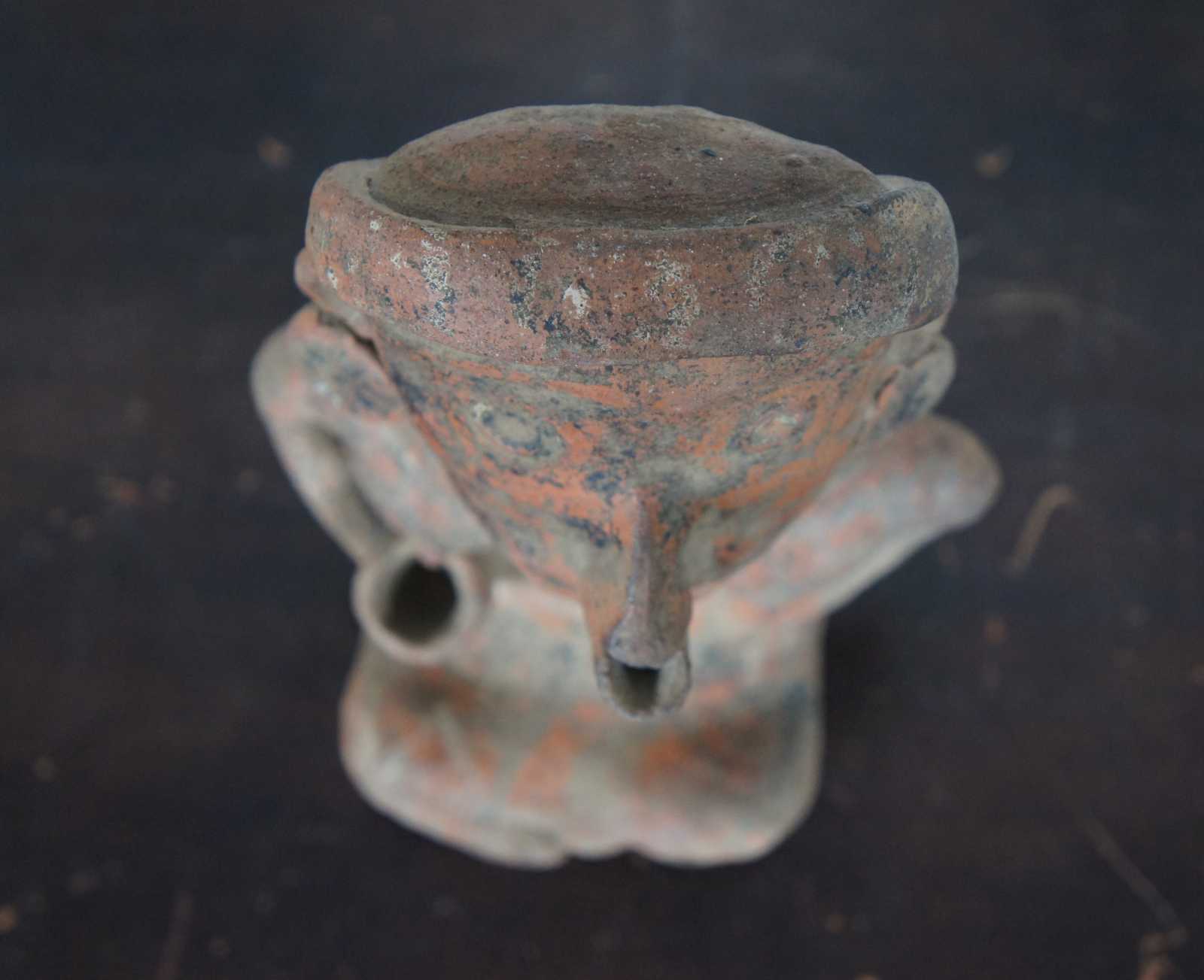 Impressive pre-Columbian Nyarit pottery earthenware vessel in the shape of a seated female figure holding a cup with a spout opening from her nose.