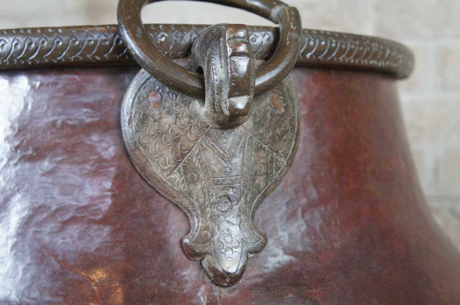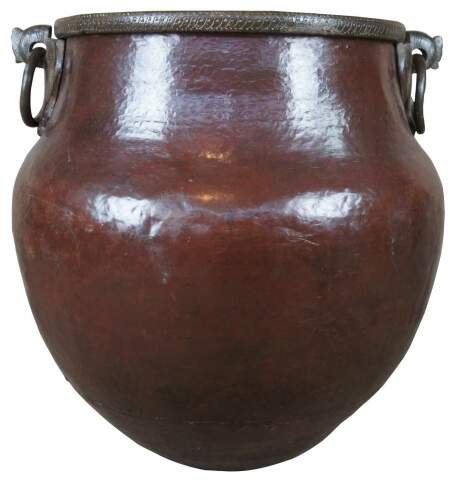 A Very Large Antique Hammered Copper Southern Indian Temple Water Vessel from Tanjore with iron ring handles cock s head mounts and rim band incised and stamped with embellishments