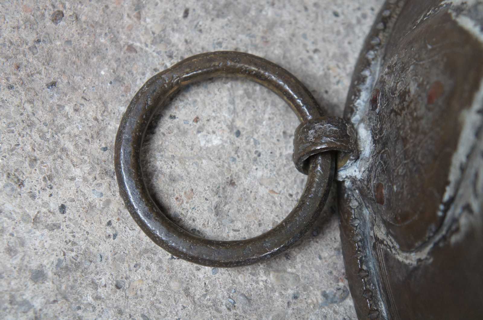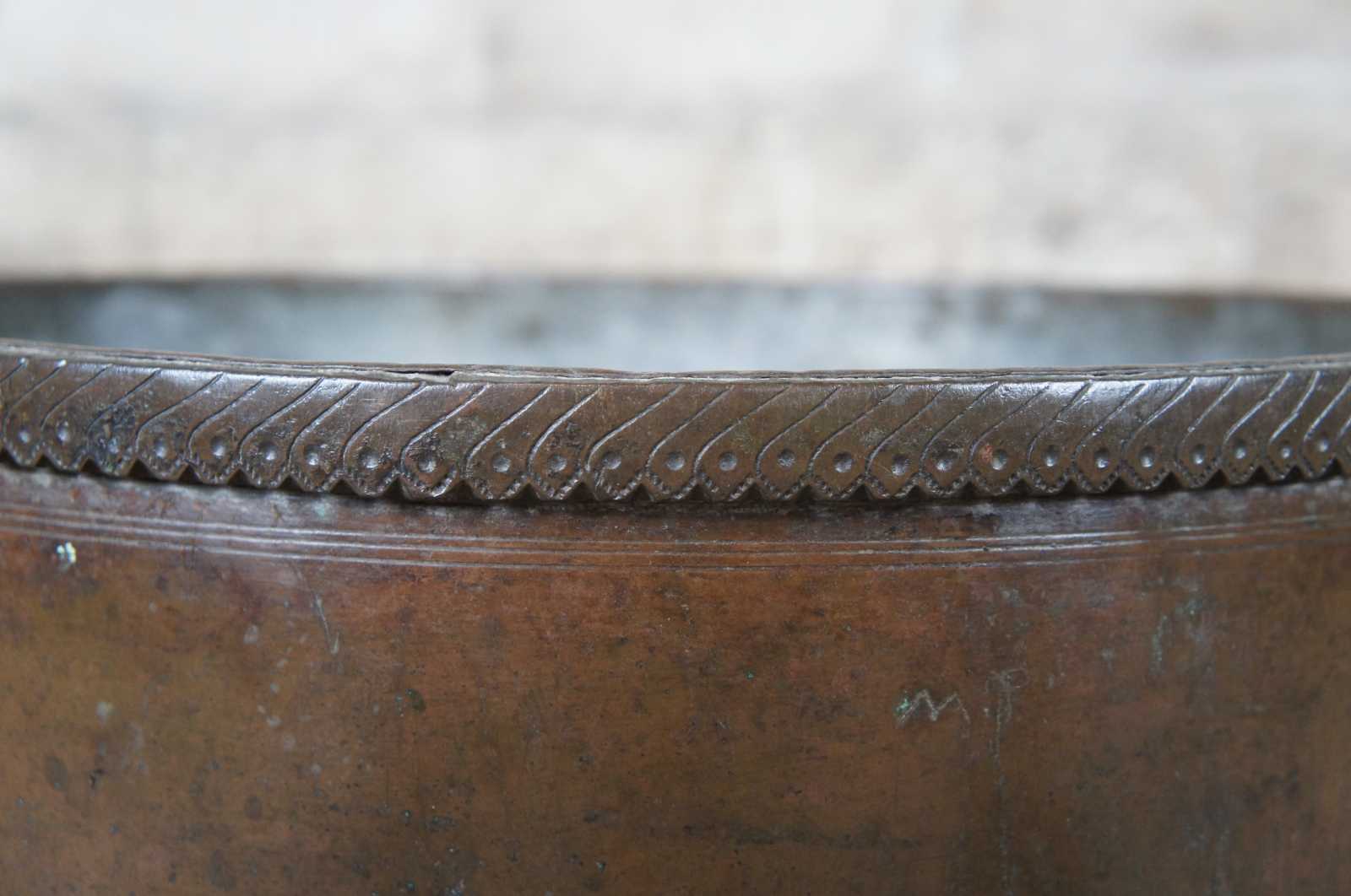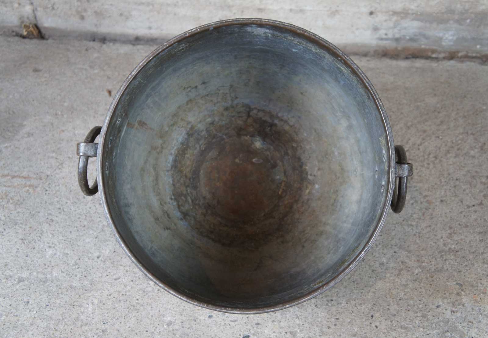 A monumental hammered copper vessel or water storage pot. Round with tapered base and Iron ring handles. Features a chased iron rim.