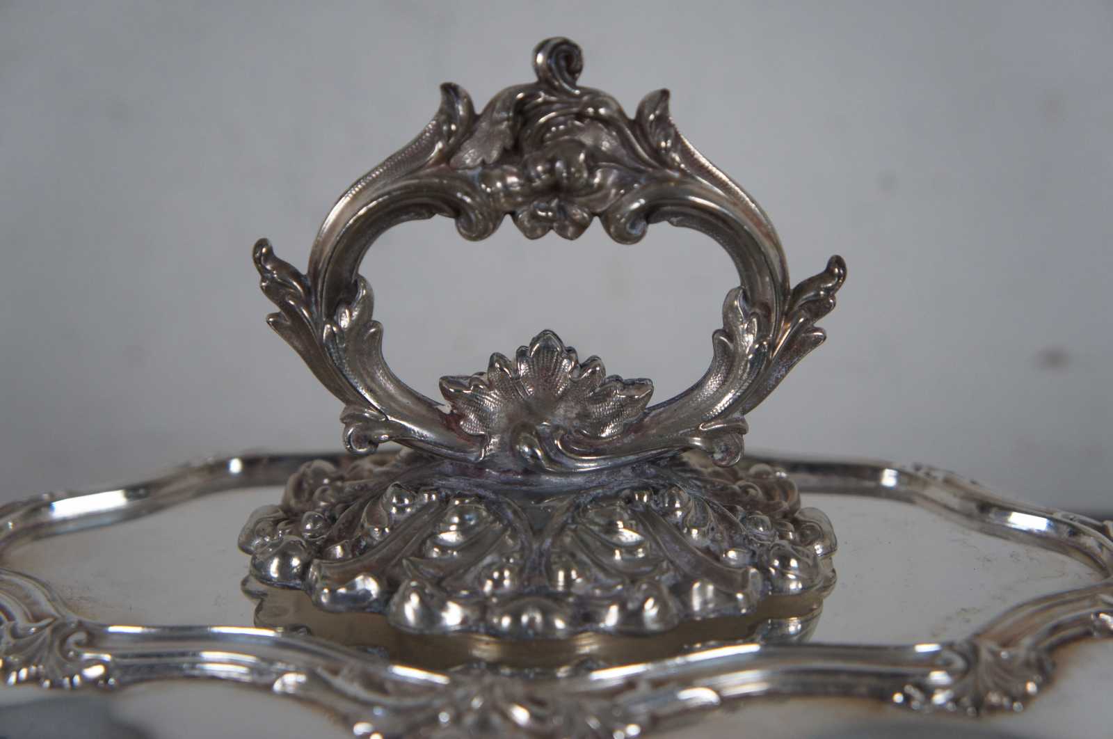 Set of two antique English silver plate serving dishes with floral scalloped edges; the handles are removable to convert the lids into additional dishes and simplify storage. Lid stamped with the coat of arms of the Royal Northumberland Fusiliers.