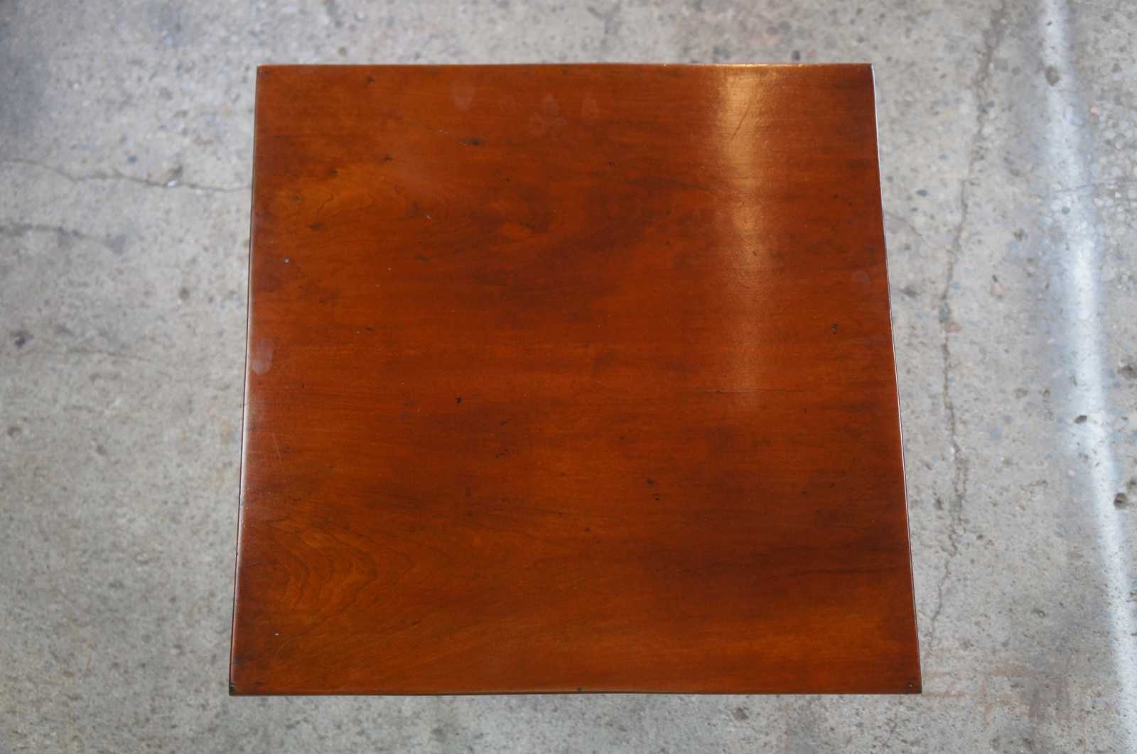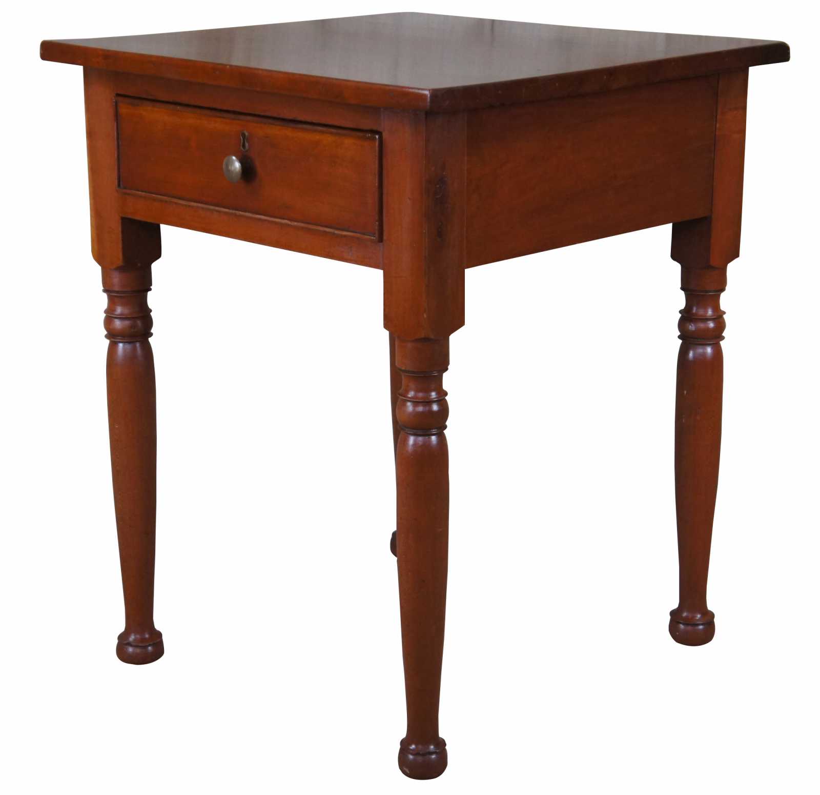Antique American side or accent table. Made of cherry featuring square form, one upper drawer and turned legs.