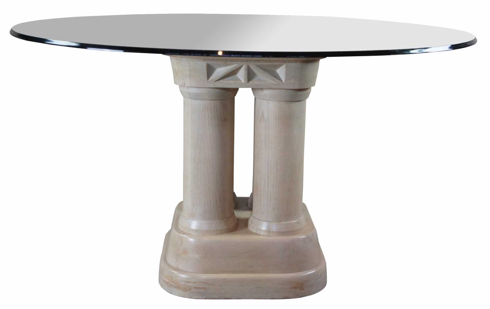 Vintage Henredon pickled oak dining table. Features four column pedestal base with square inset copper accent and round glass top.