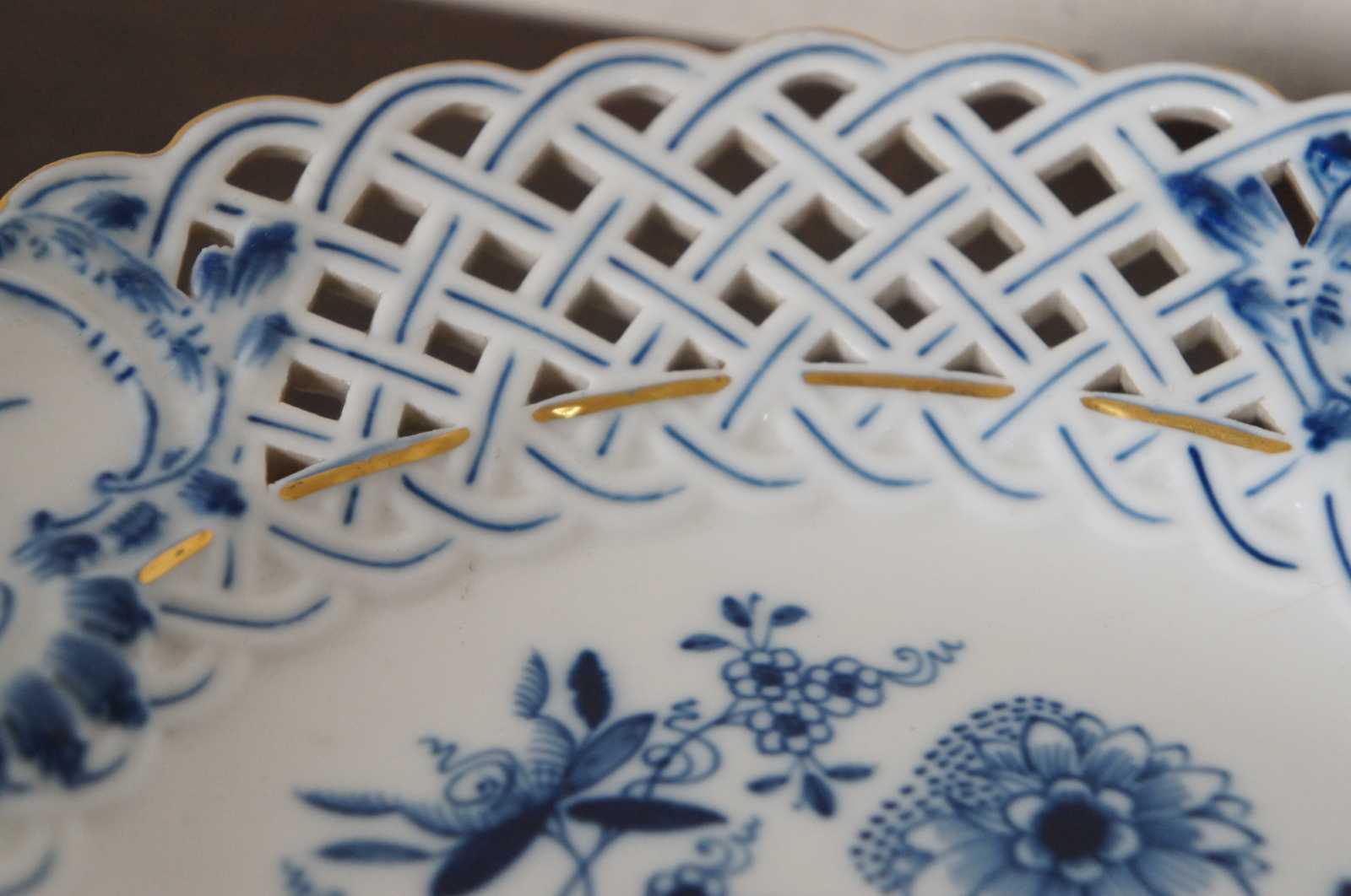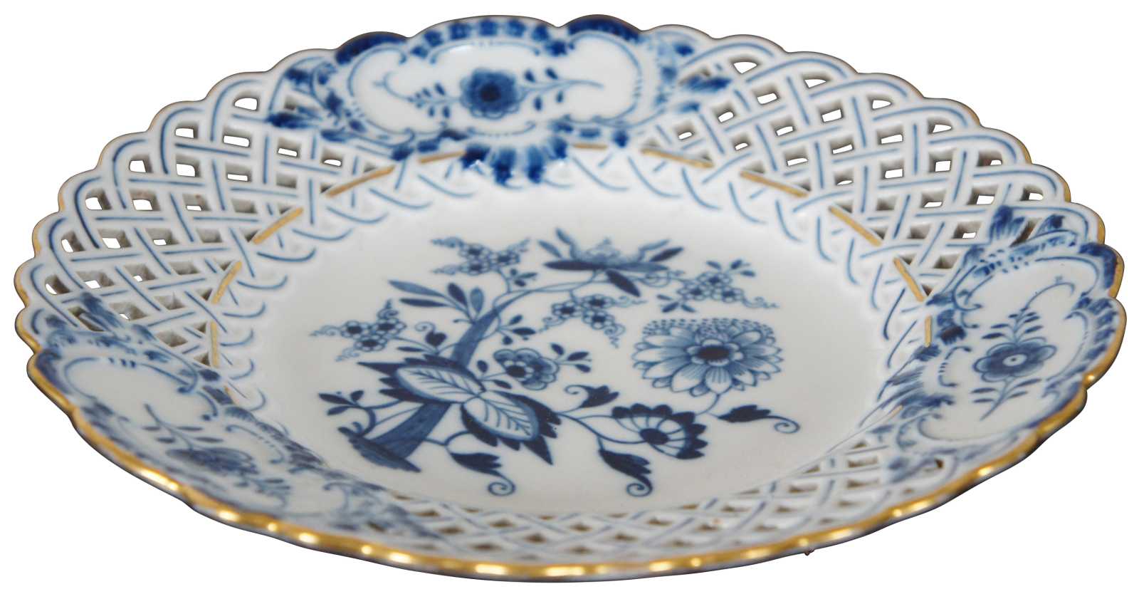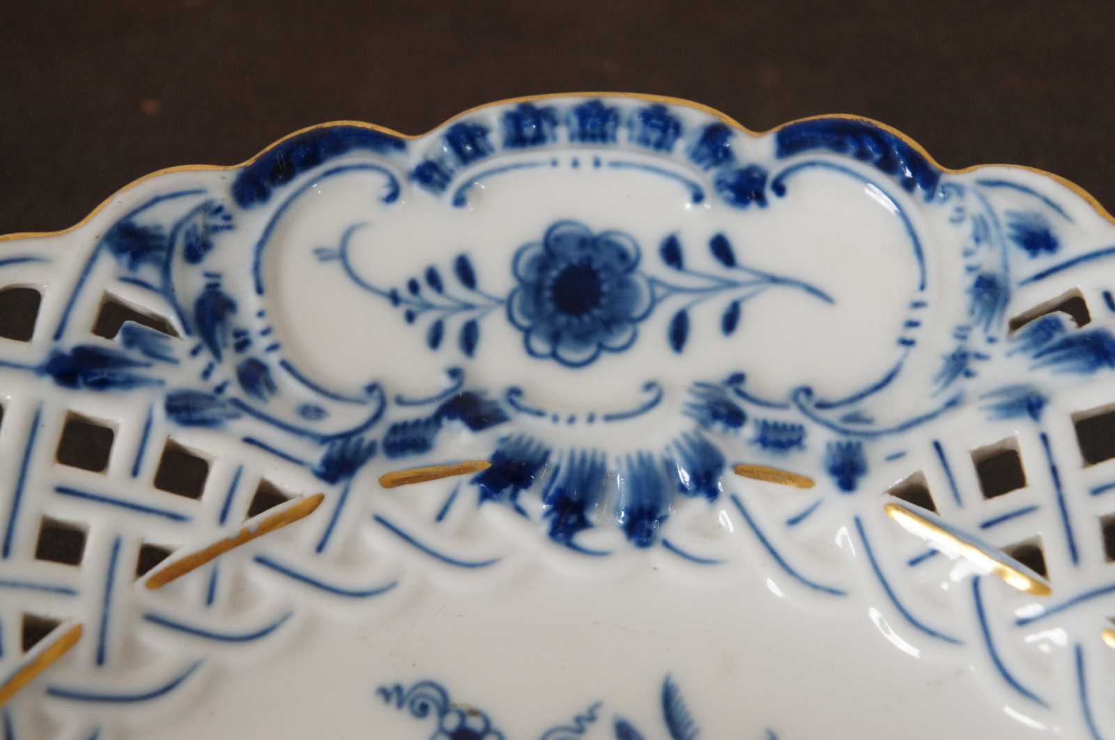 Antique Meissen porcelaing salad plate with crossed sword mark, pierced scalloped edges and gold trim on the Blue Onion pattern.