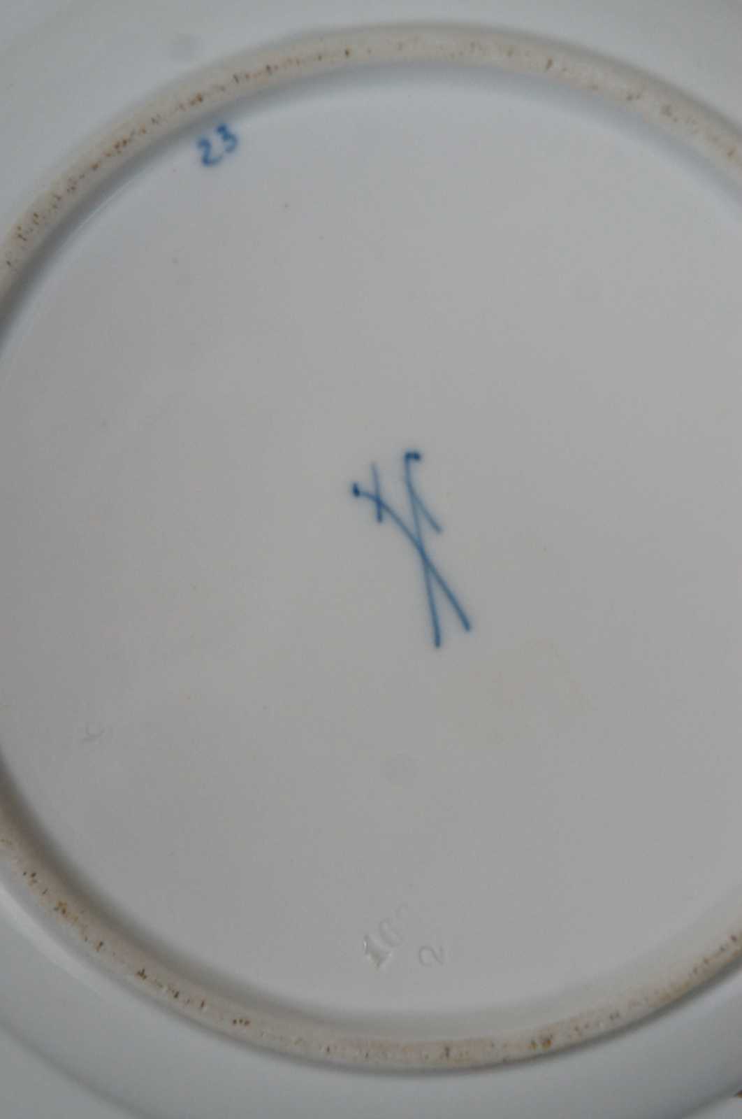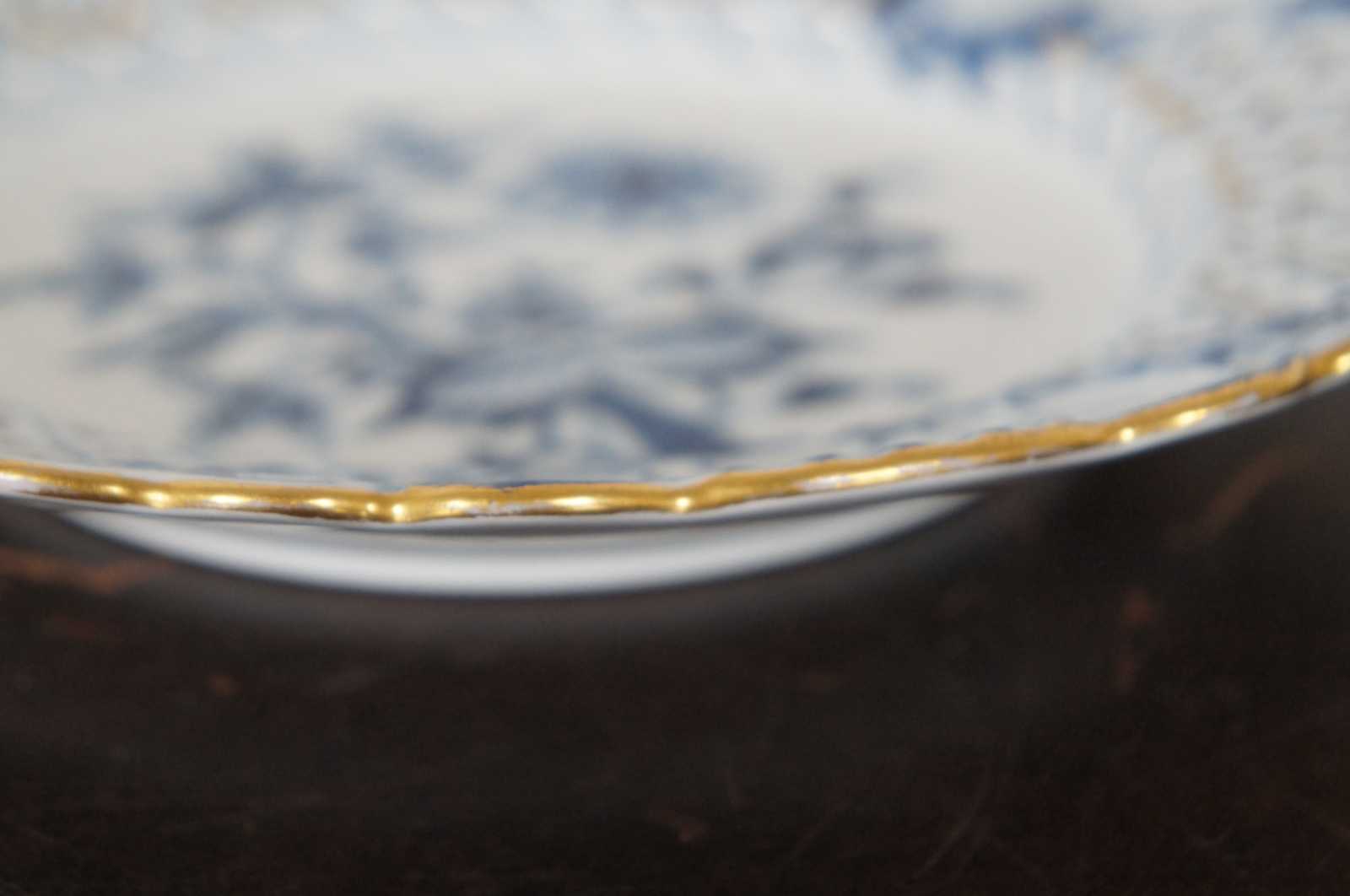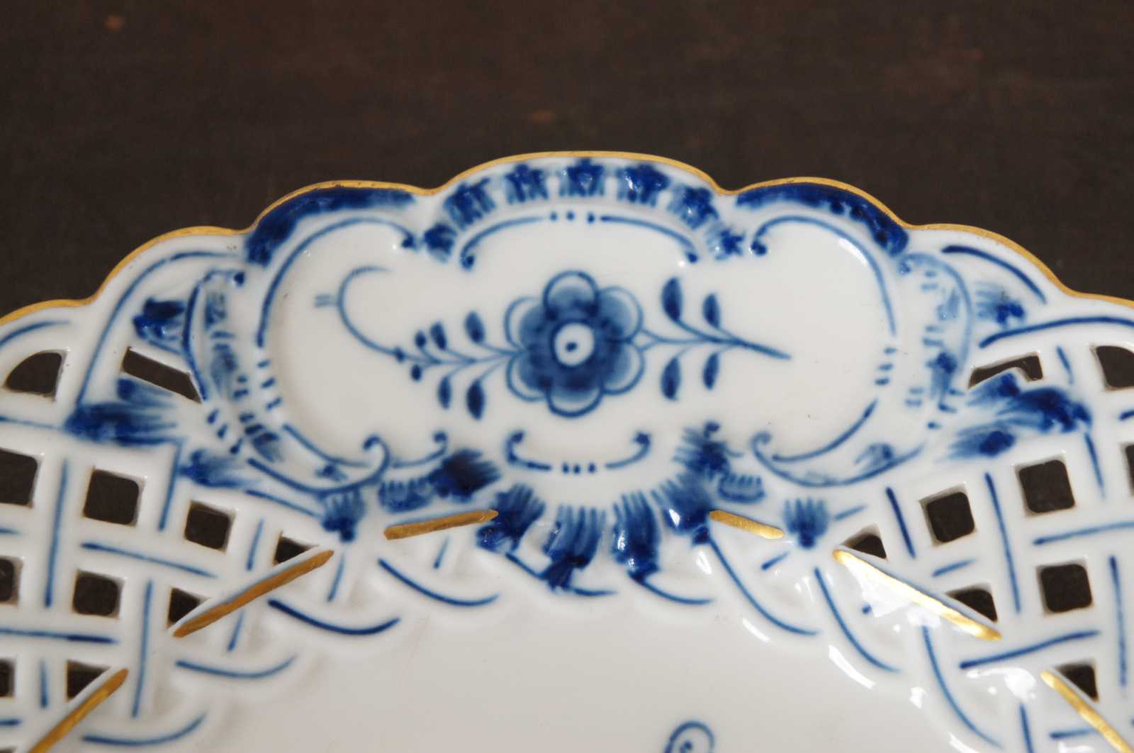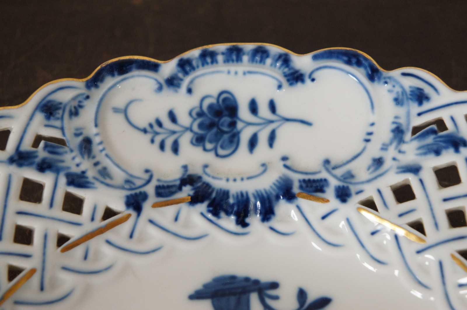 Antique Meissen porcelaing salad plate with crossed sword mark, pierced scalloped edges and gold trim on the Blue Onion pattern.