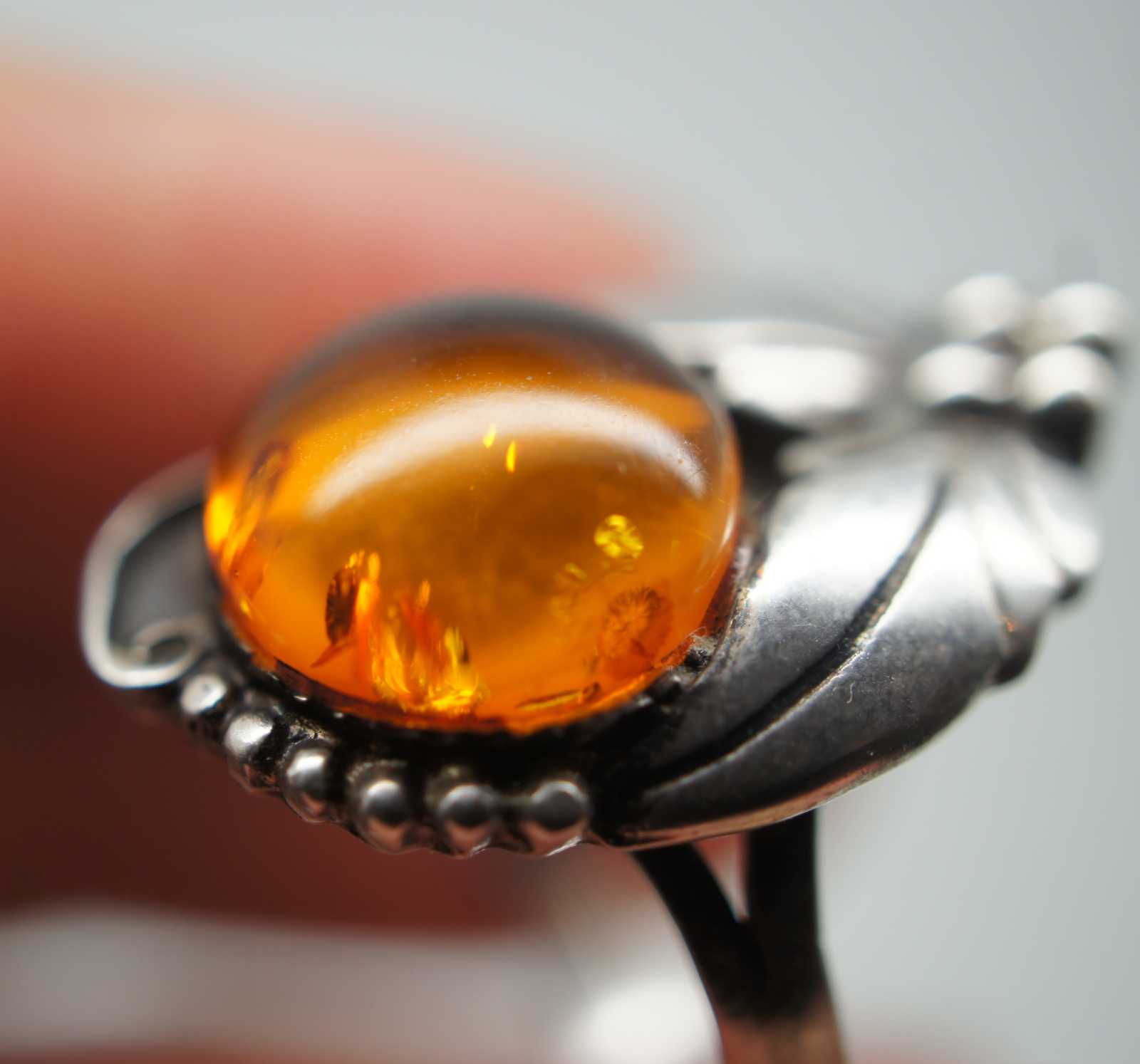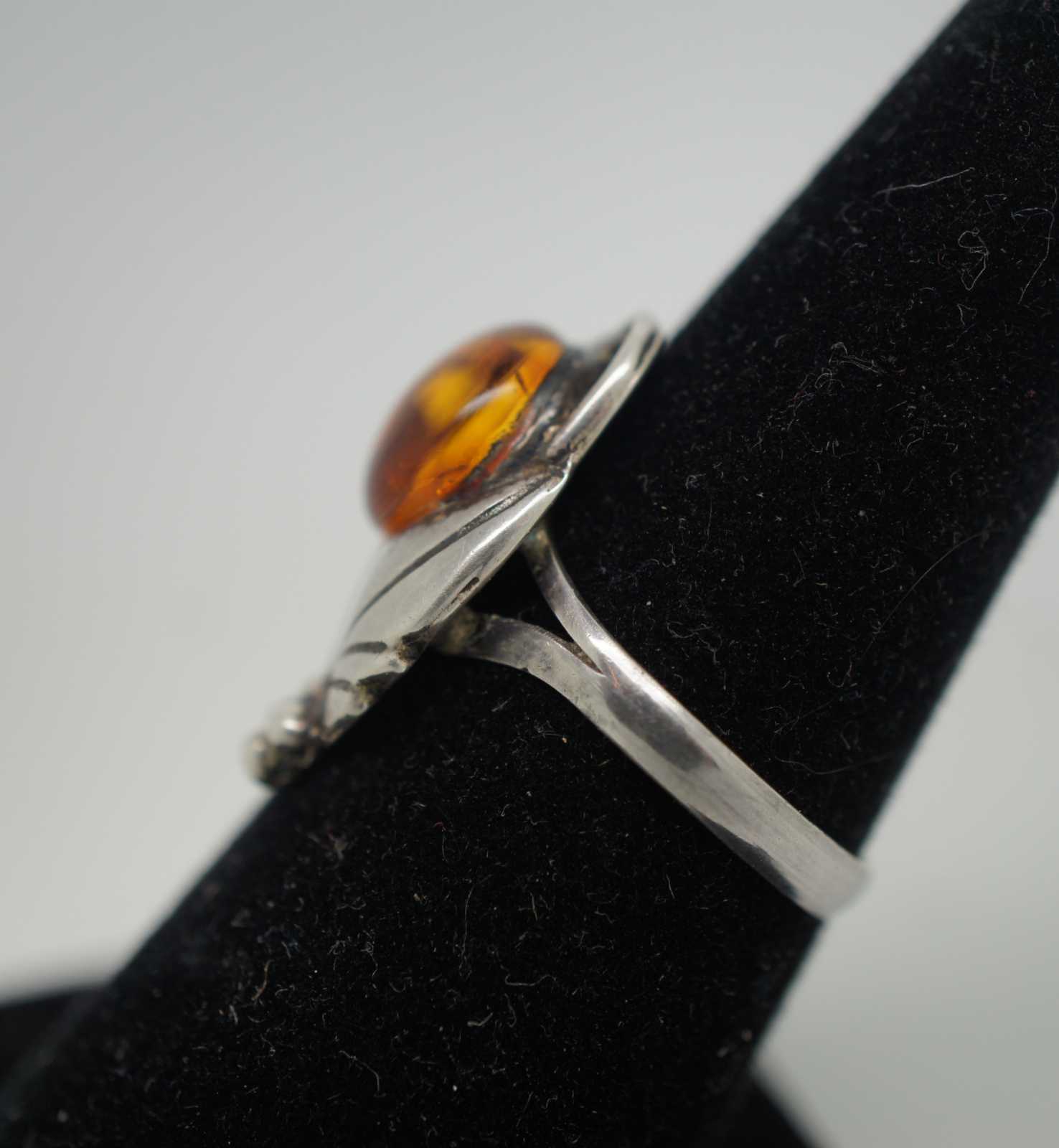 Antique Art Nouveau sterling silver 925 ring with a round polished Baltic amber stone flanked by leaves and berries. Size 8.5""