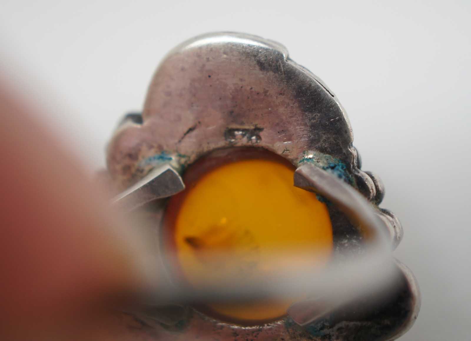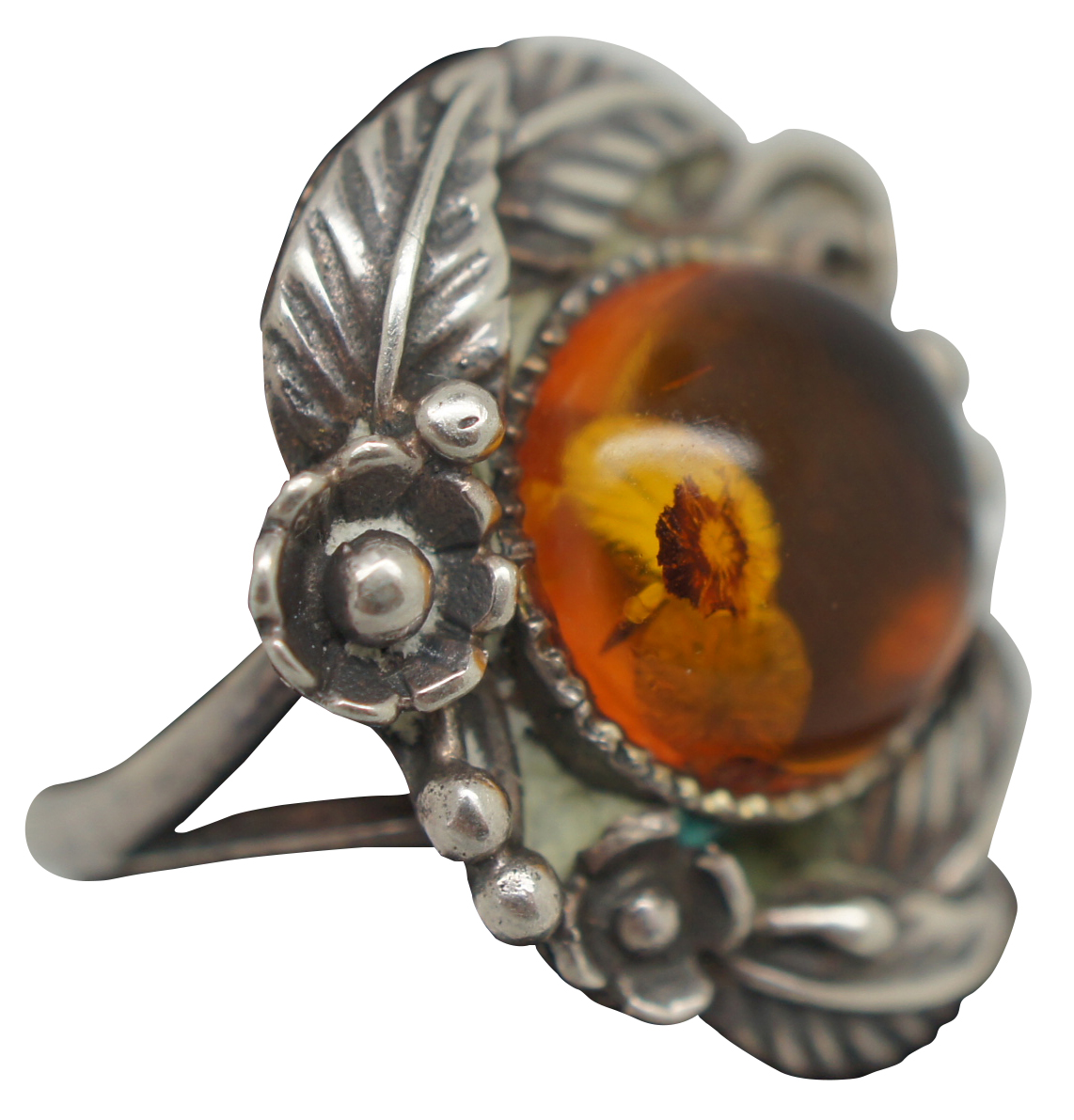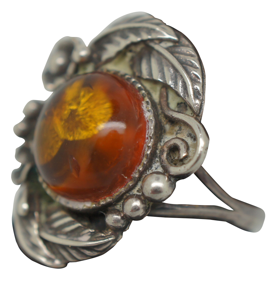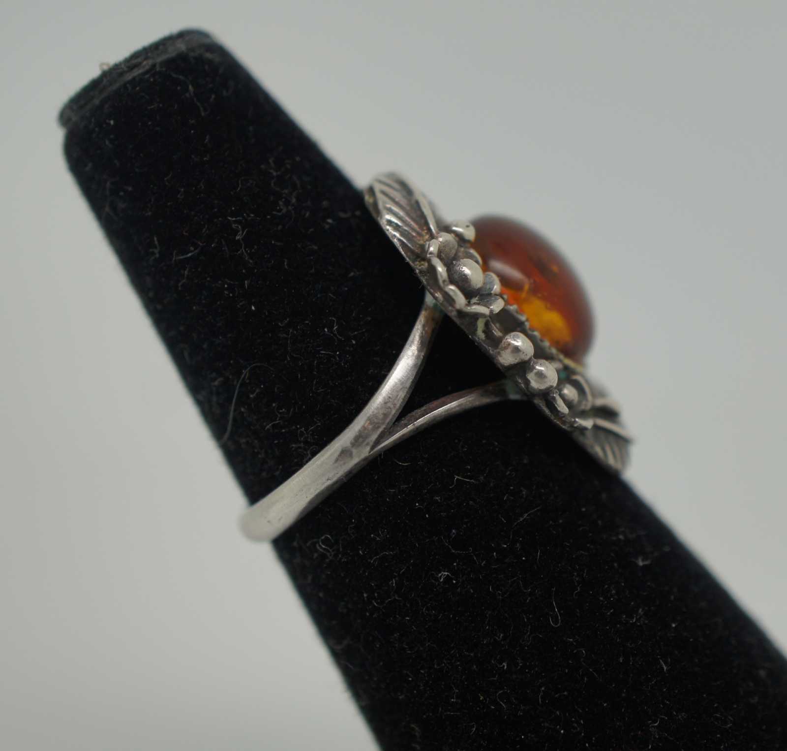 Antique Art Nouveau sterling silver 925 ring with a round polished amber stone surrounded by flowers and leaves. Size 6.