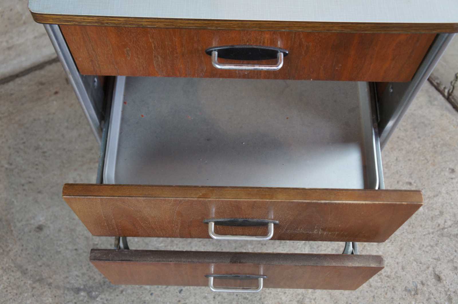 Good overall condition, wear and distressing from use, discoloration / staining to top, wear to drawer front, some rust/pitting, missing three drawer trays.