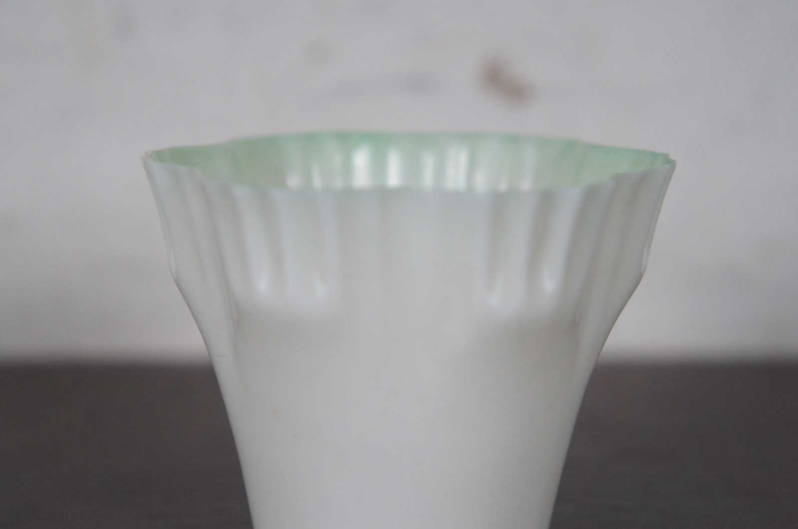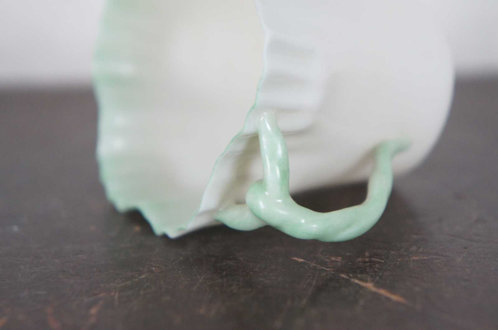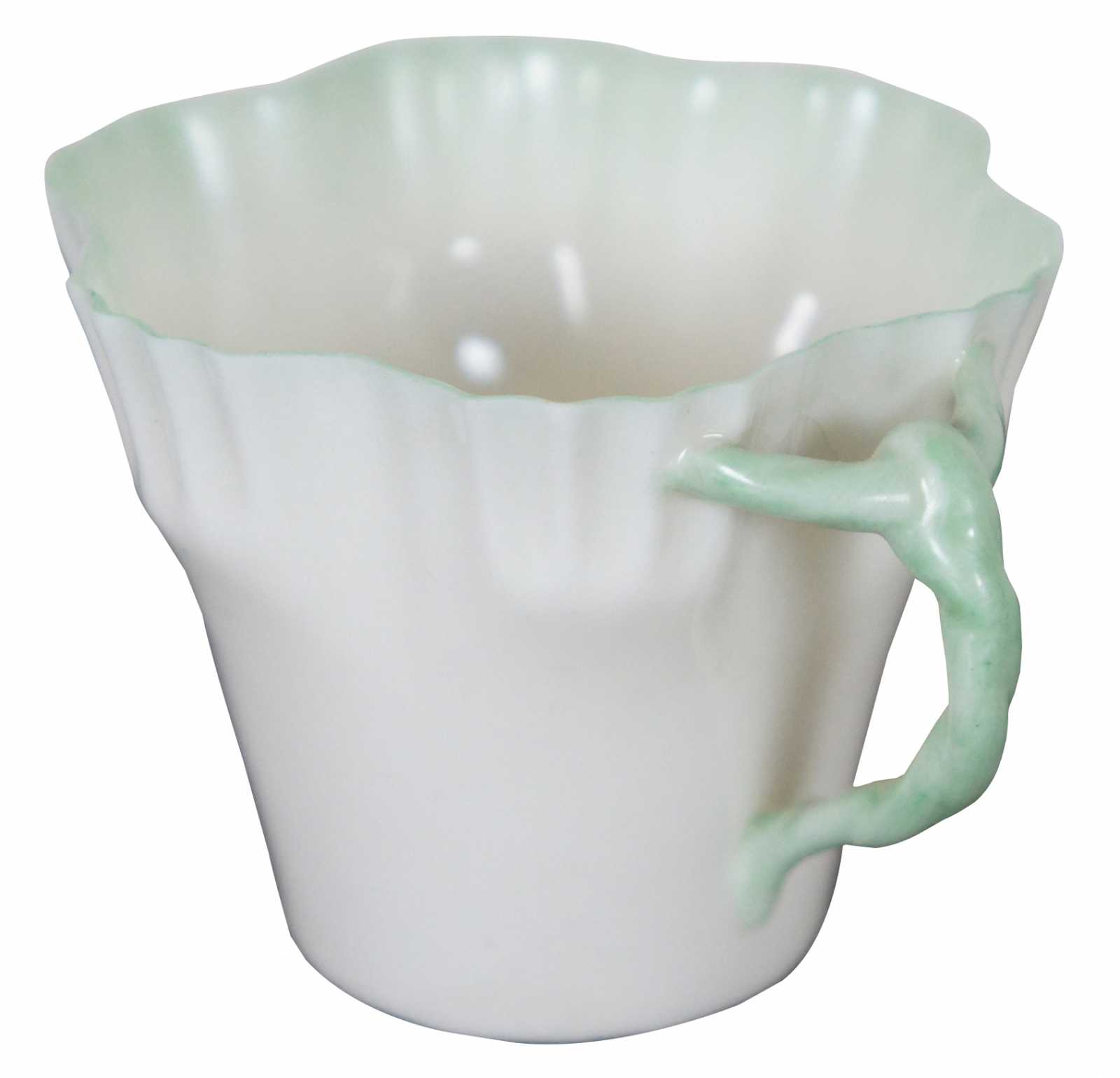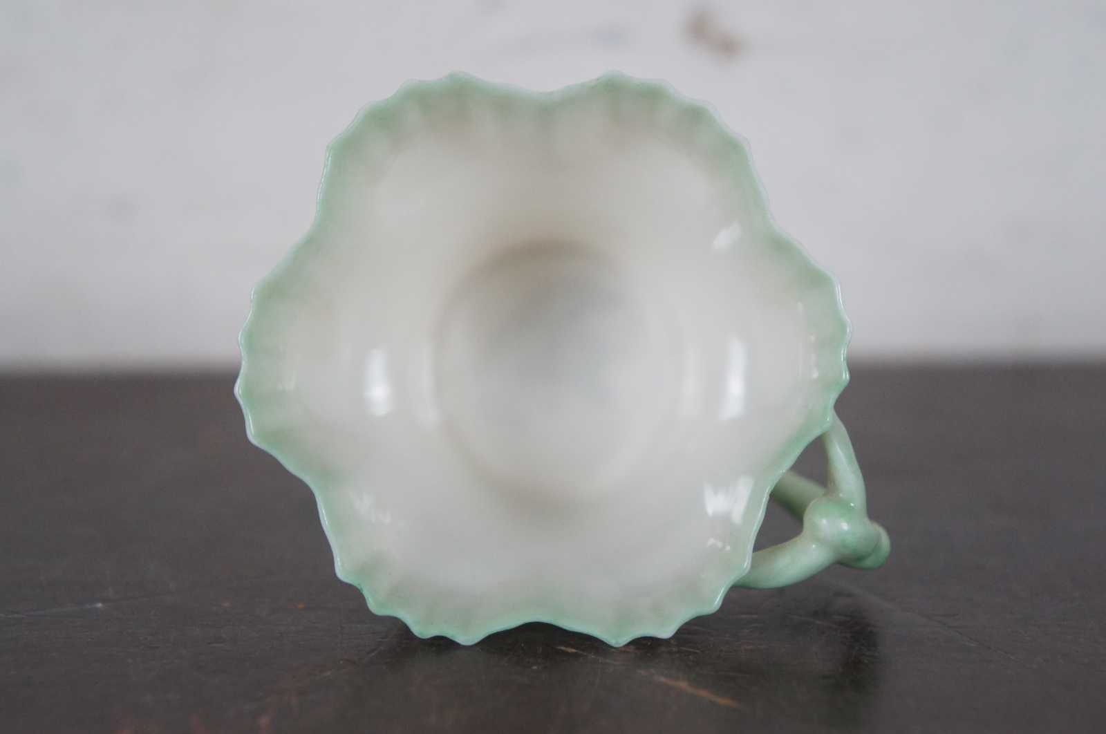 Antique Belleek Irish porcelain demitasse teacup with green edging and twisted branch shaped handle.