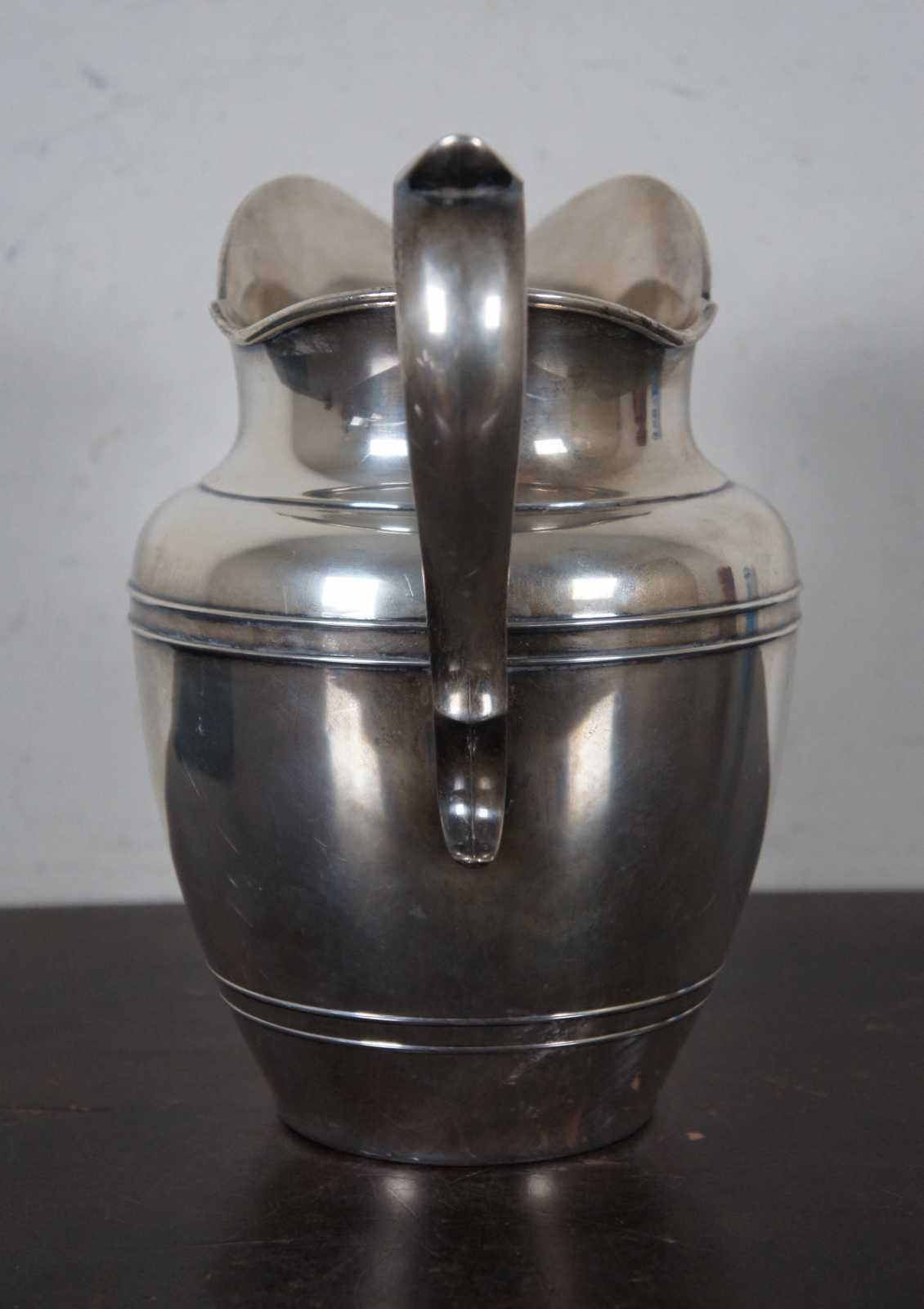 Antique 1940’s Gorham sterling silver water pitcher. Baluster body, helmet mouth with molded rim, and capped double-scroll handle. Molded bands encircle body. Model number A11710, capacity 5 pints.