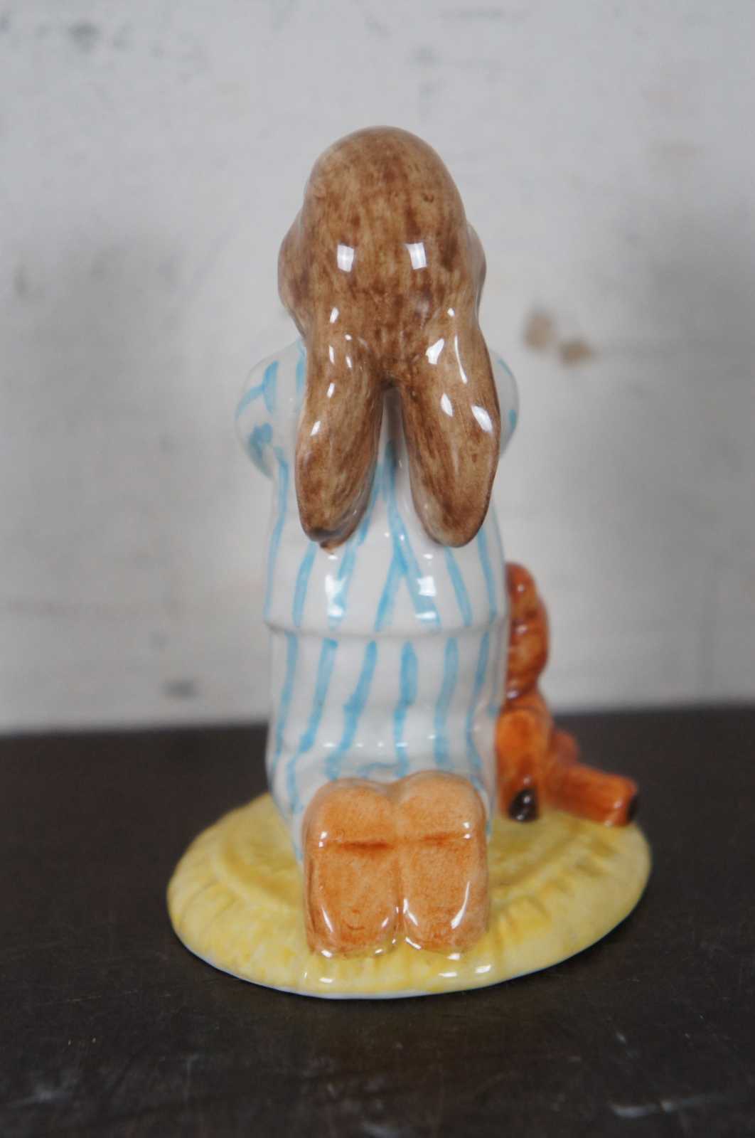 Vintage 1986 Royal Doulton Bunnykins figurine #DB55 Bedtime rabbit in blue stripe pajamas saying his prayers next to his teddy bear. Includes original box.