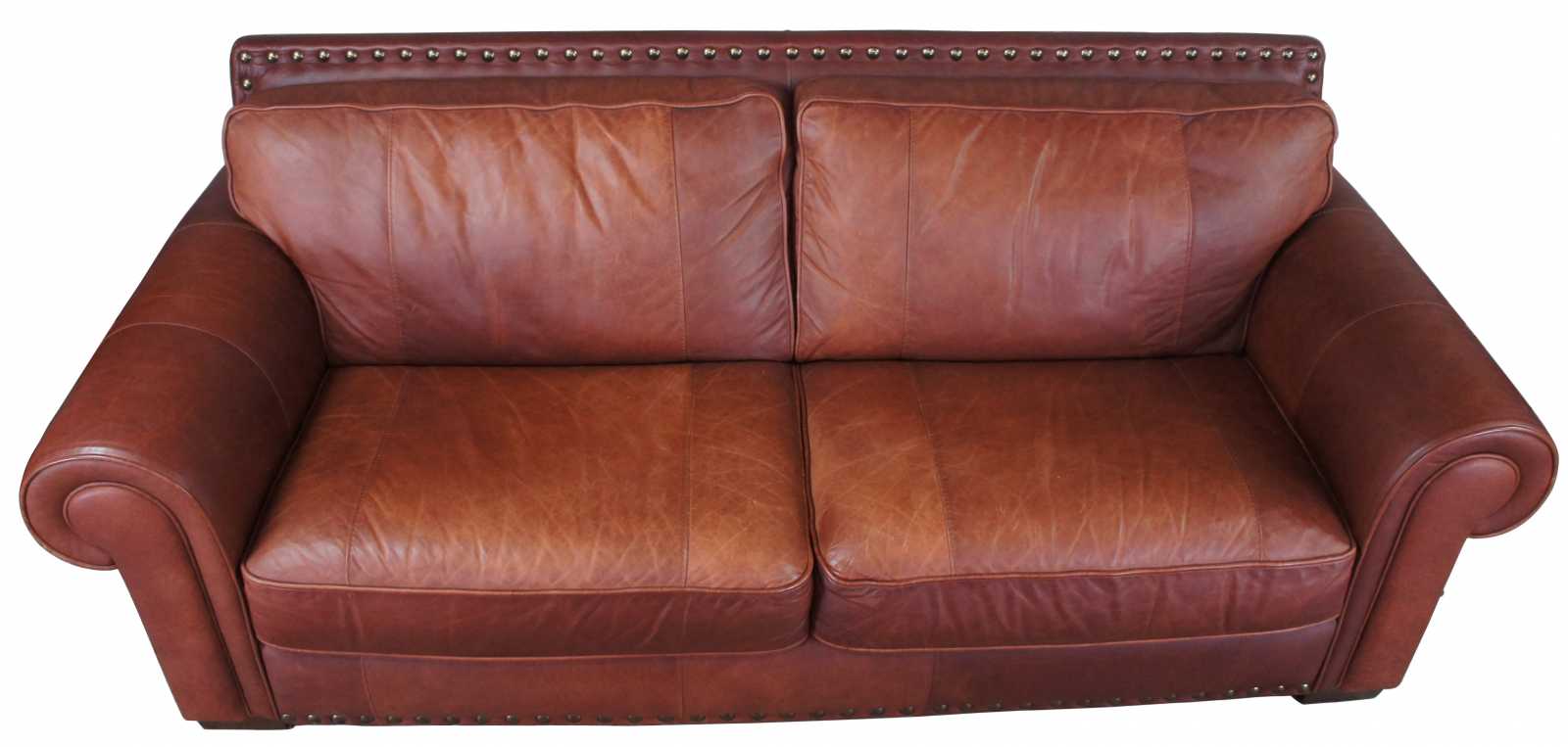 Vintage leather Monaco sofa featuring rolled arms, cognac leather and oversized nailhead trim. Made in Italy circa 2000.