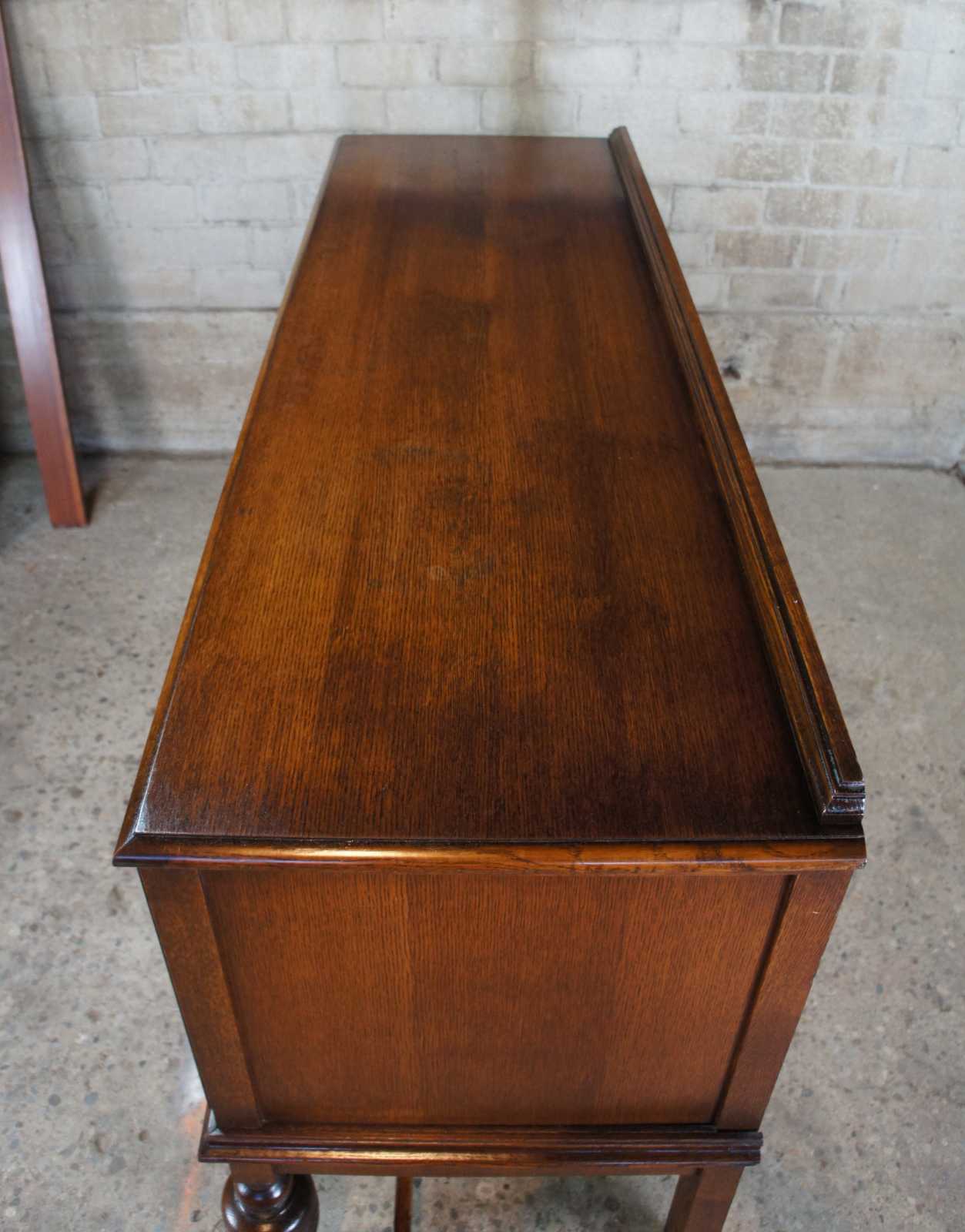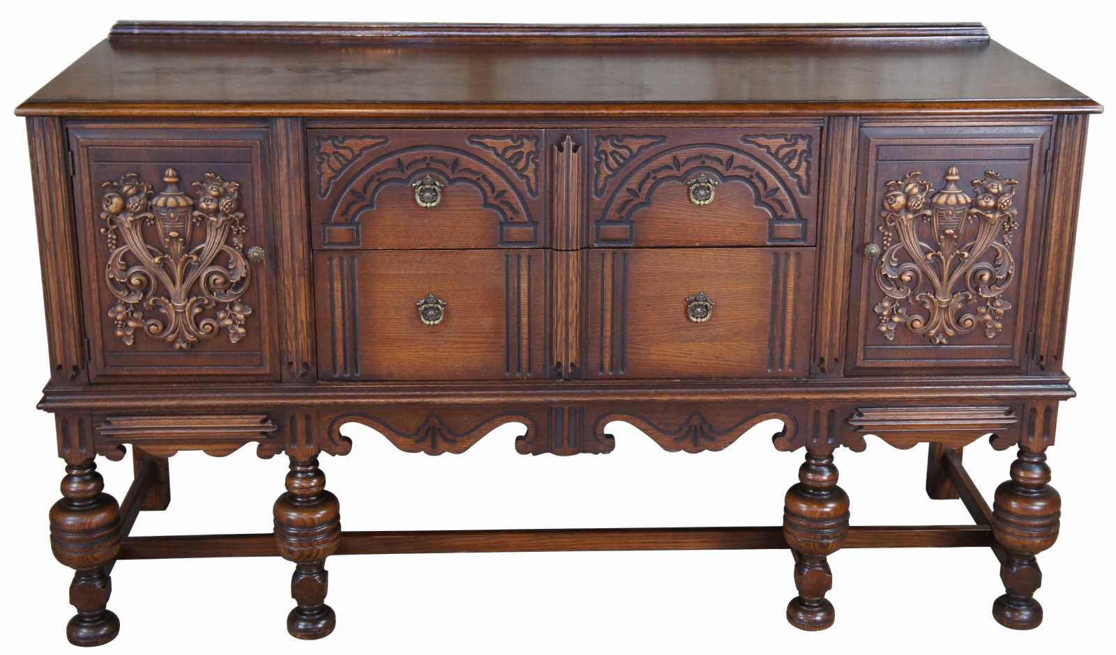 Early 20th Century Jacobean / Elizabethan revival buffet or server by Basic Furniture Company out of Waynesboro, Virginia. Made from oak with two drawers between two cabinets supported over carved serpentine apron over turned baluster supports and bun feet connected by stretchers. Carvings of a trophy urn with conocopias of fruit, nut and acanthus leaves.