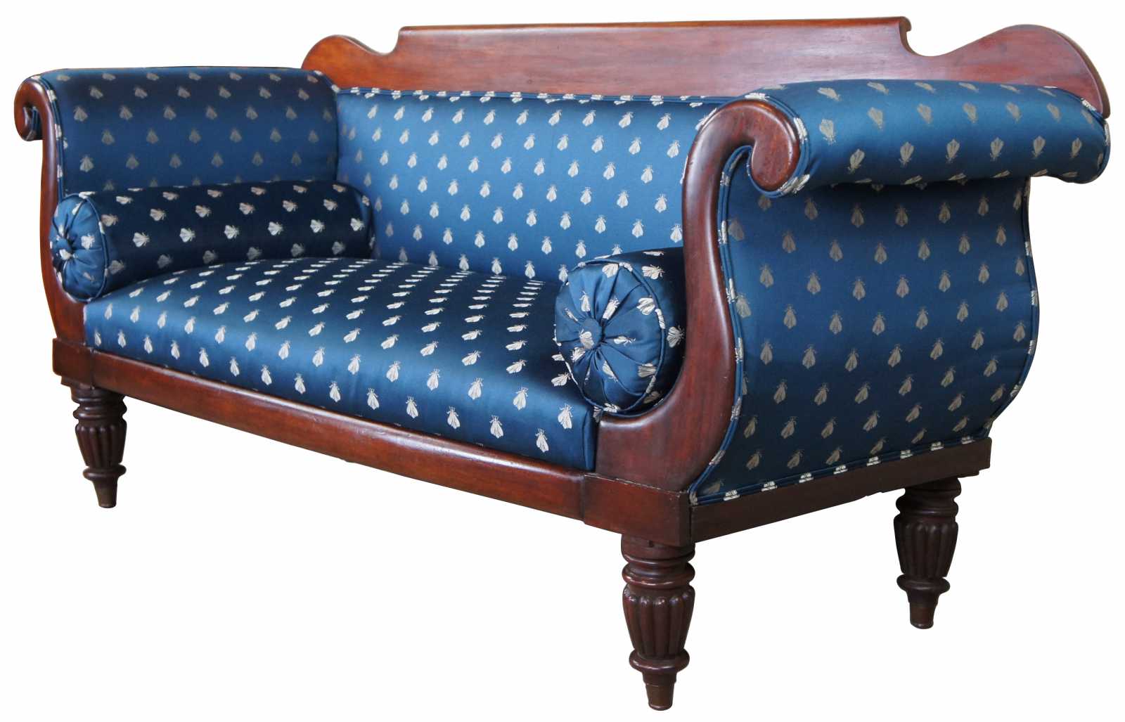 Antique Victorian parlor settee or sofa. Made of mahogany featuring rolled arms and blue silk scalamandre upholstery with insects and bolster pillows. The sofa is supported by turned reeded legs with brass caps.