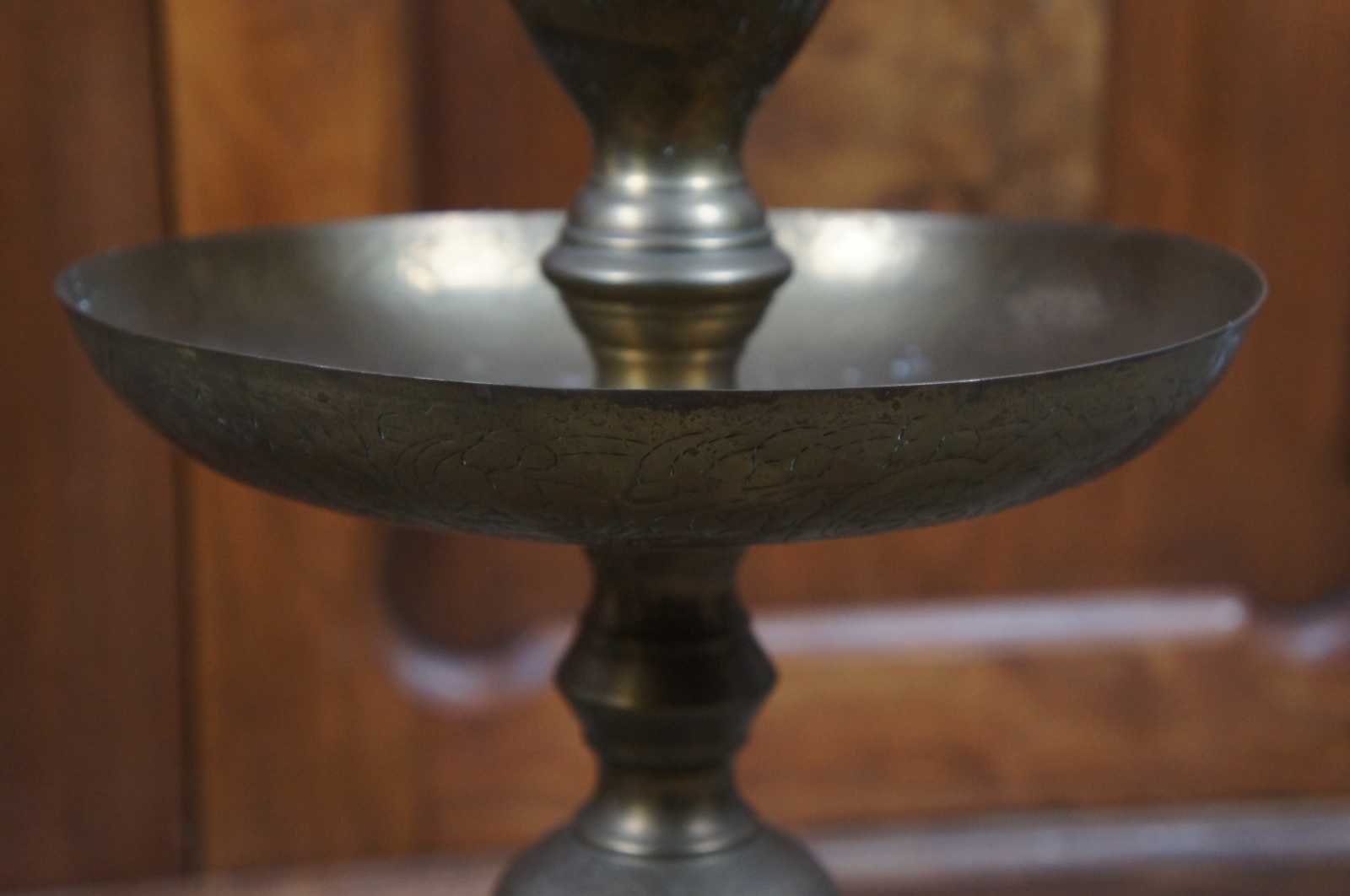 Pair of antique Indian or Middle Eastern etched floral brass altar candlesticks with mid level drip pan.