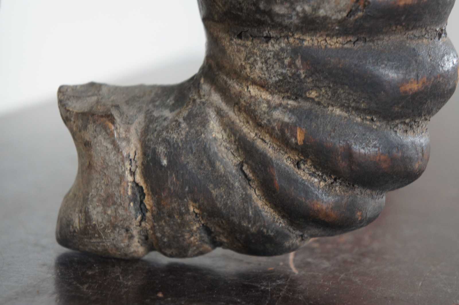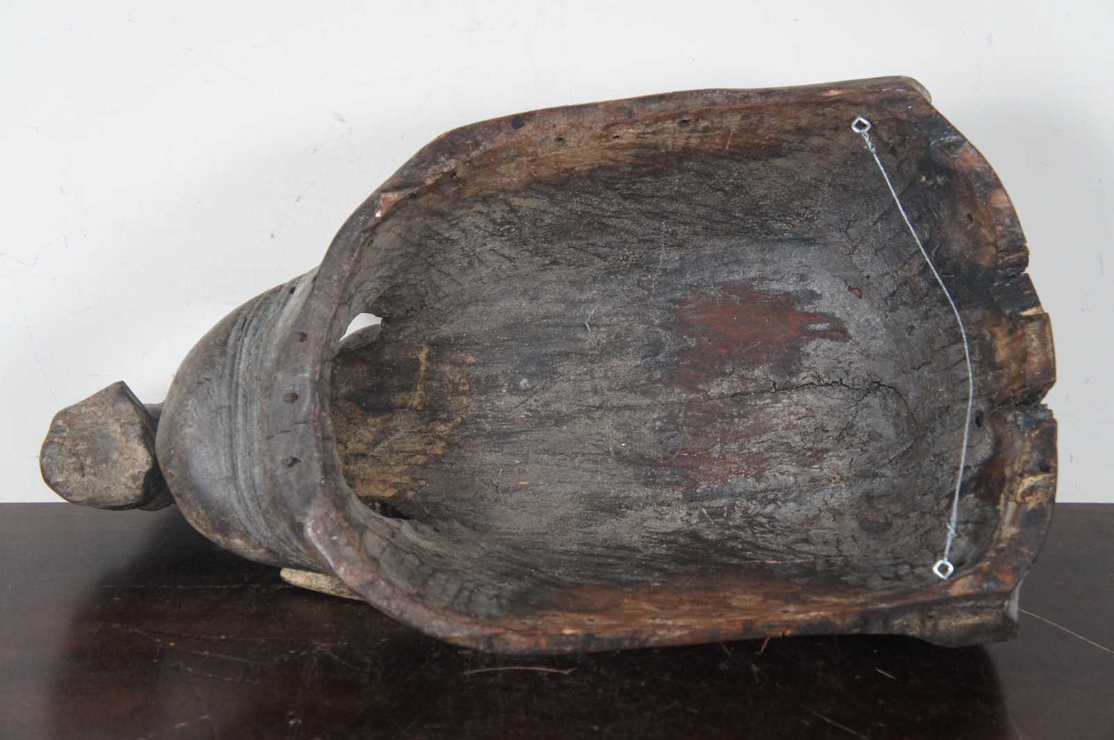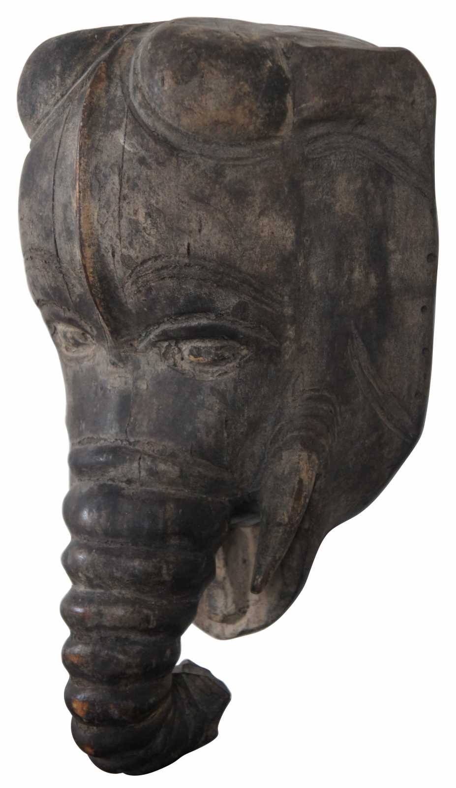 Antique hand carved wooden mask or wall hanging in the shape of an Indian elephant with wrinkled trunk and short tusks.