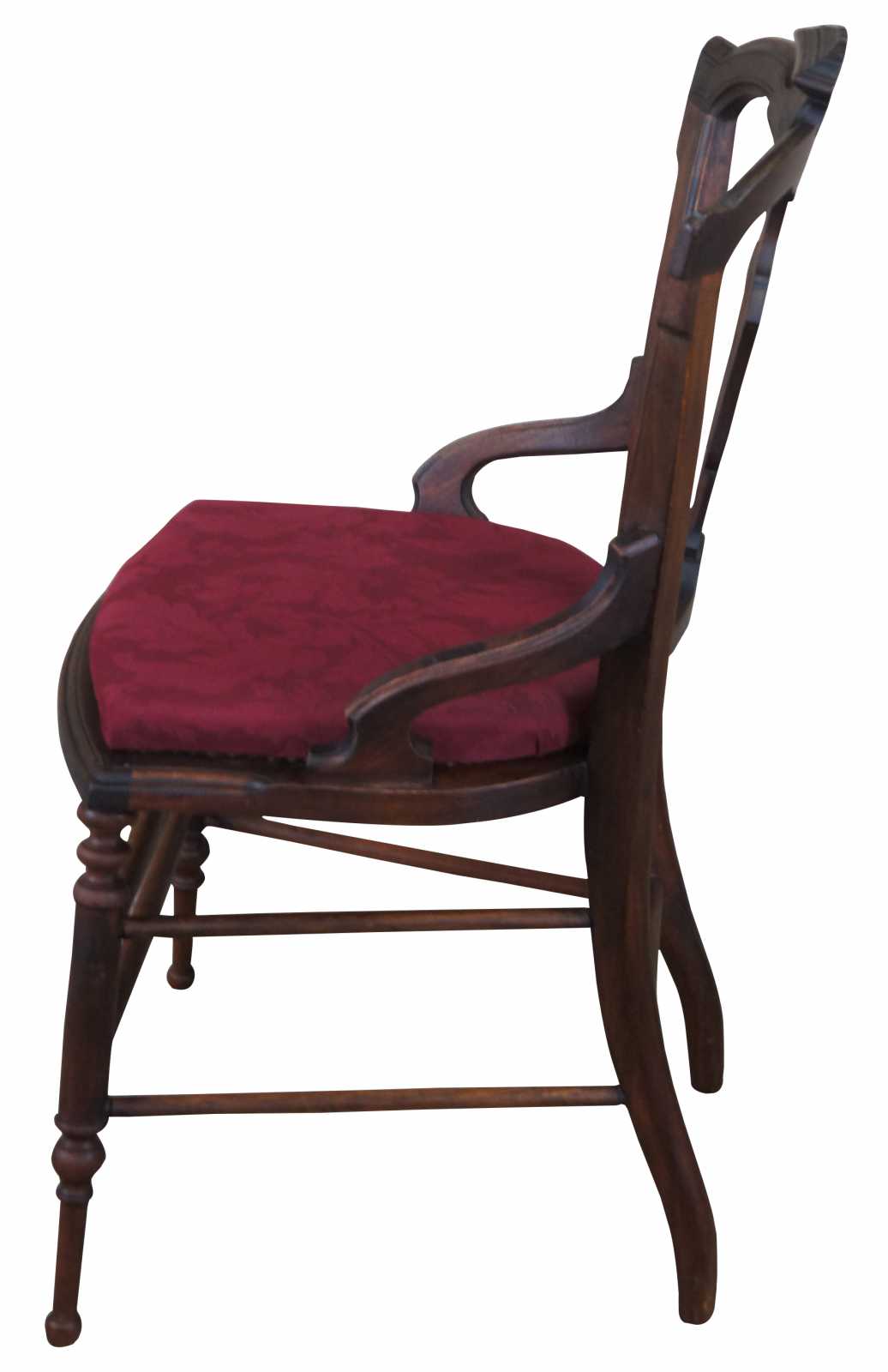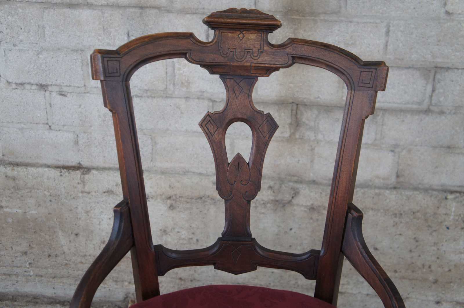 Antique Victorian Eastlake dining parlor chair. Made of walnut featuring ornate design with carved accents and turned legs.