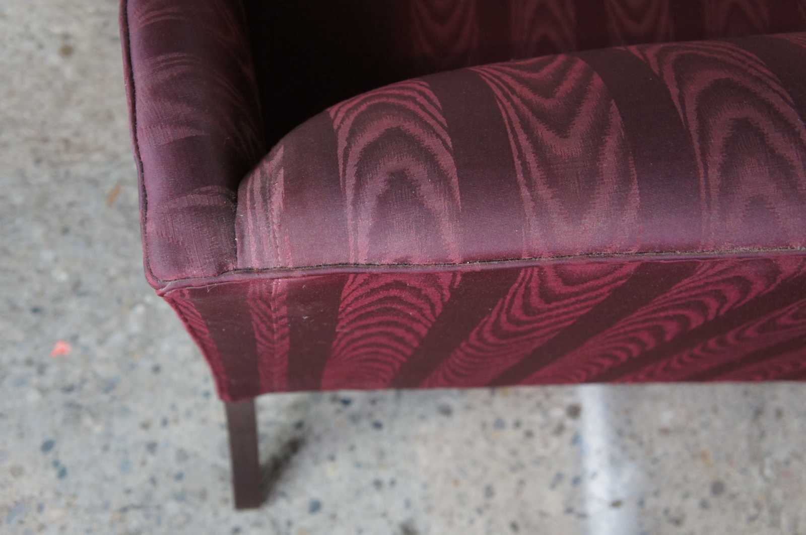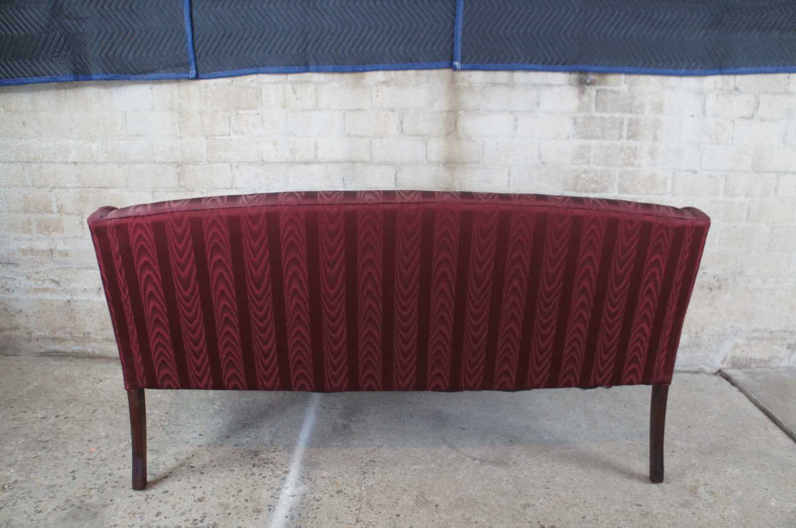 Antique Sheraton style bow back parlor sofa or settee. Made of mahogany featuring an arched back with red silk upholstery, nailhead trim, and ornate turned and reeded legs with arrow feet. Includes smooth open arms leading to elegantly banded corners.