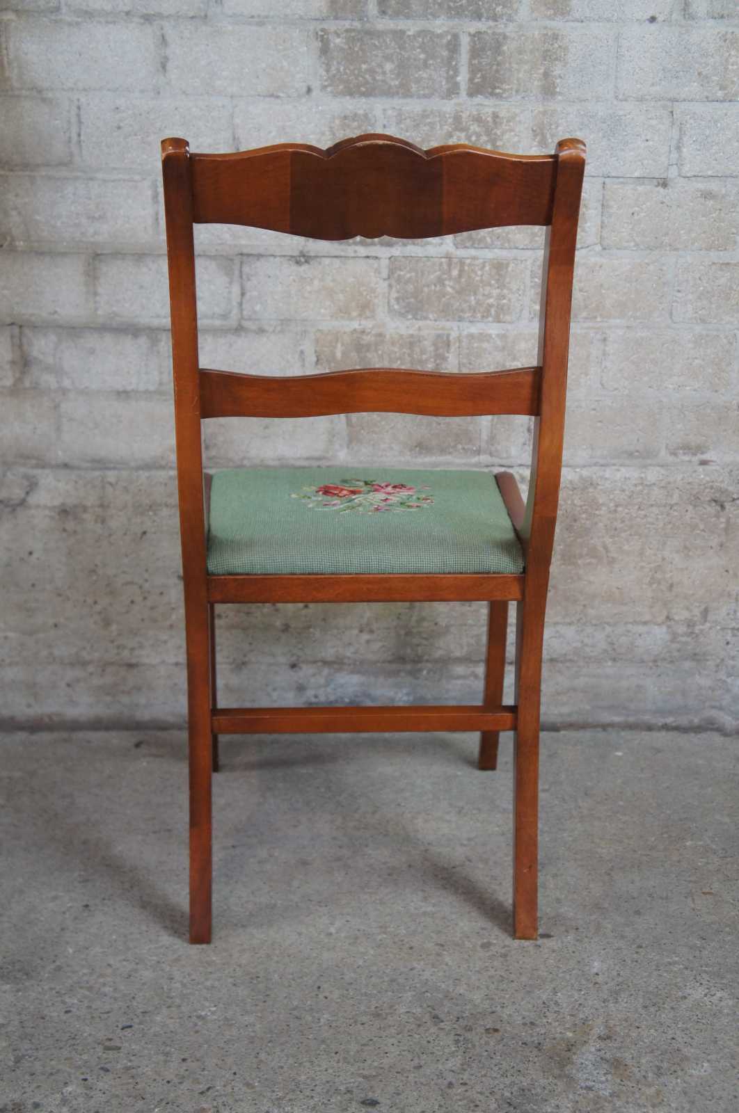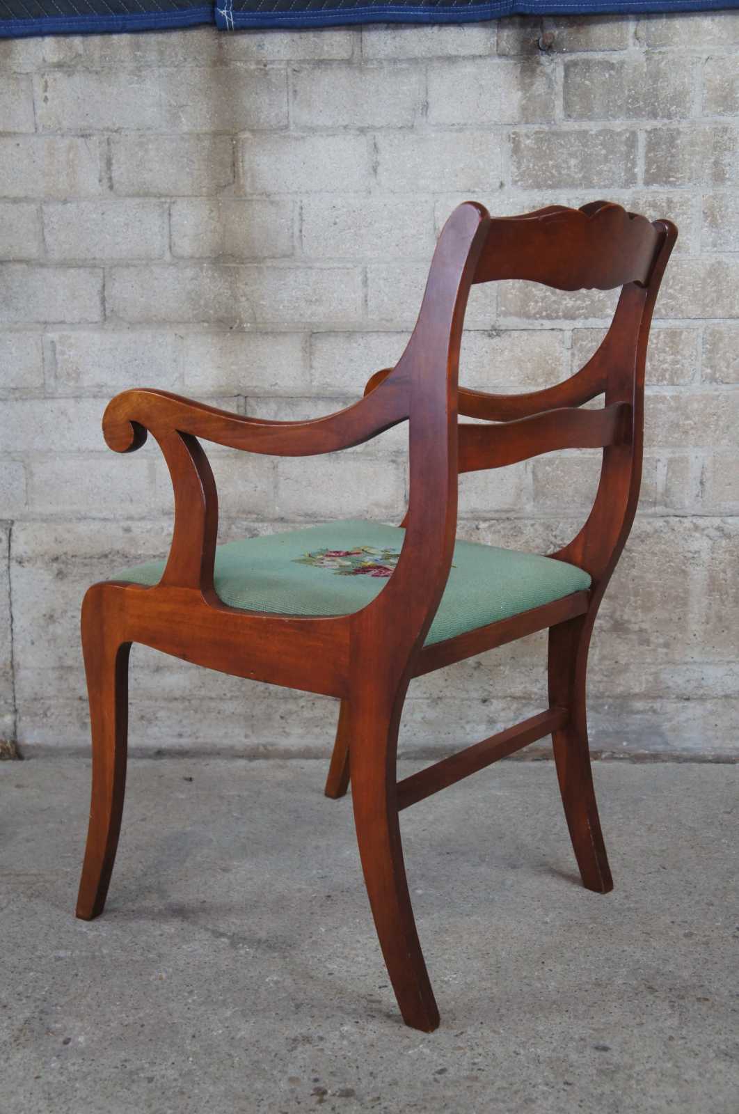 Seven antique Craddock Furniture Corporation dining chairs. Made of mahogany featuring a green floral needlepoint seat and carved floral back support. One arm, six sides.