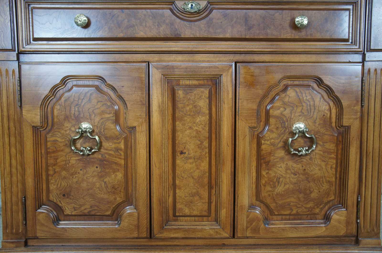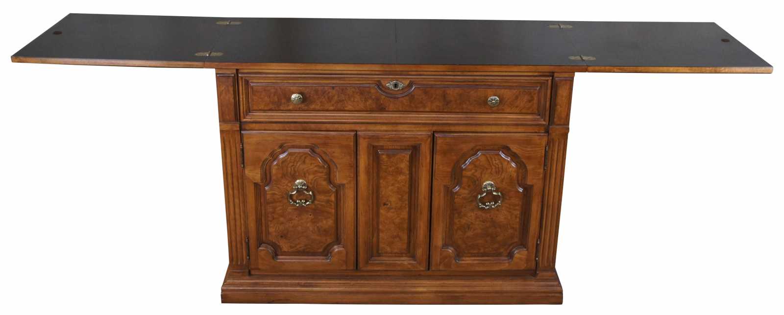 Thomasville Buffet or Server, circa 1970s. Made from walnut with olive ash wood burled panels. Includes a large upper dovetailed drawer and lower cabinet with shelf for storage. Upper surface butterflies open to a protective laminate top. On wheels for ease of movement.